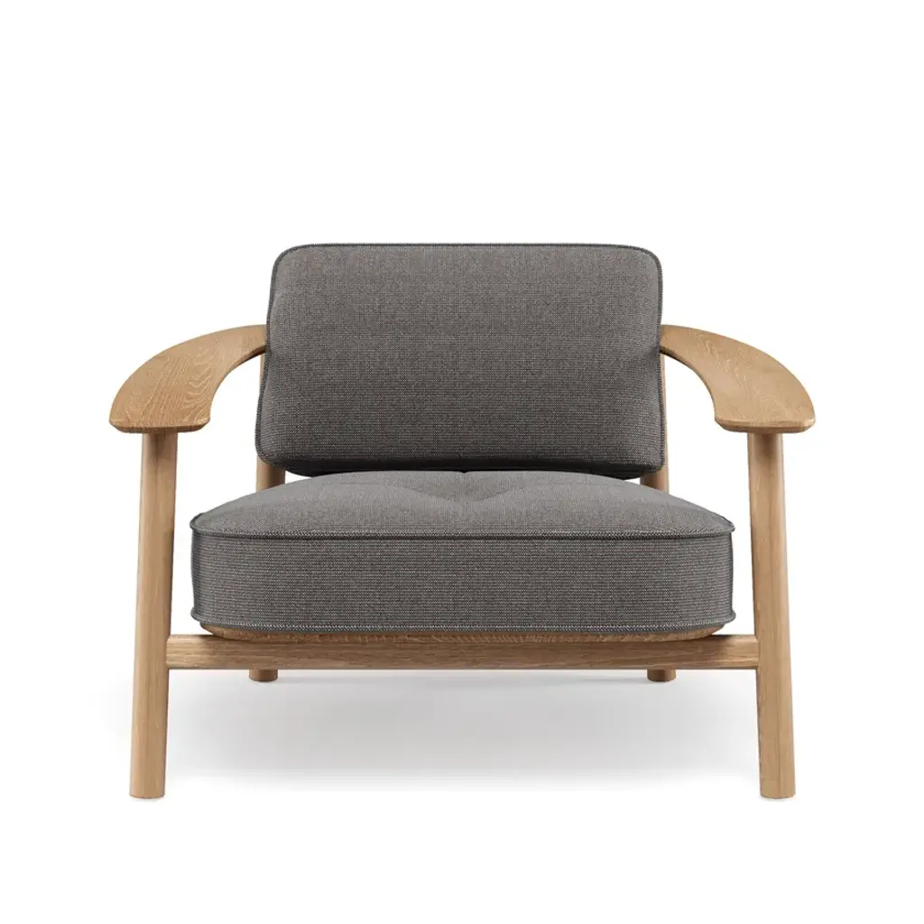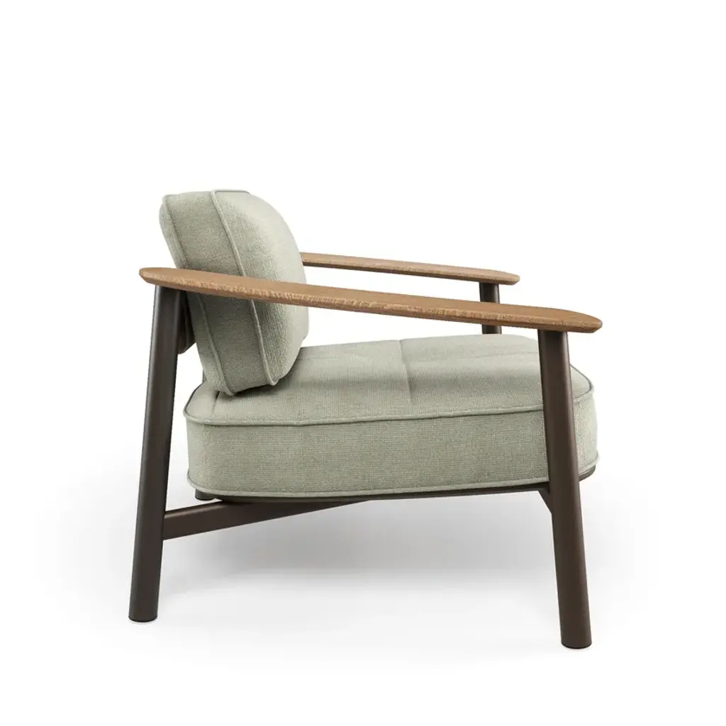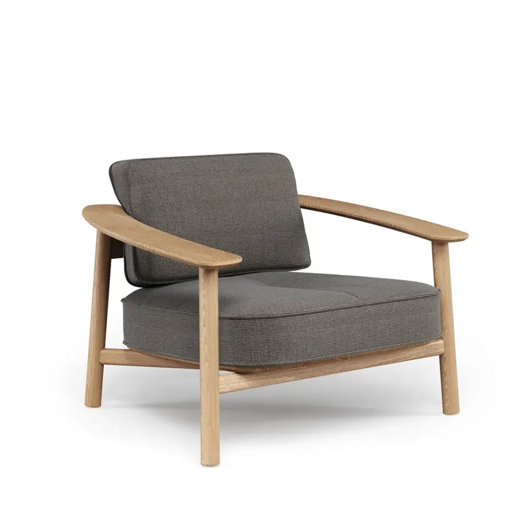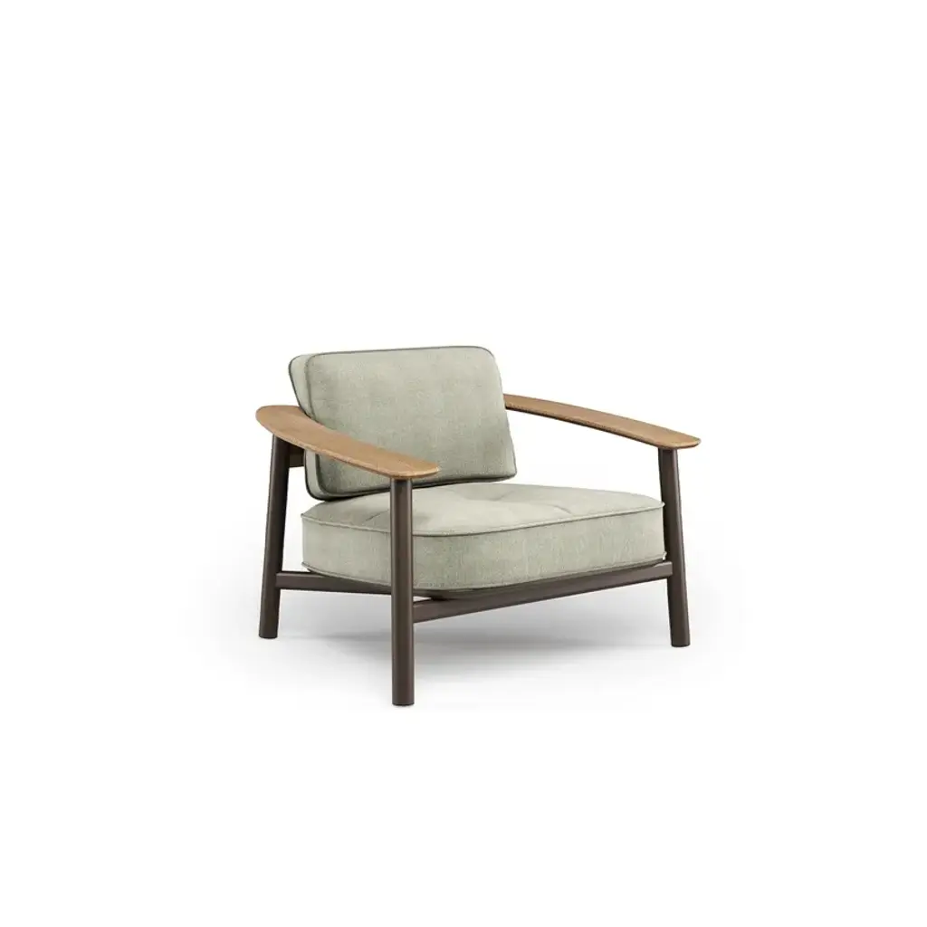 Twins is a fabric garden armchair with 100 % FSC teak frame. Available in aluminium plus teak version.Twins is a collection with a strong identity and the result of the perfect blend between the Emu know-how and the designer Sebastian Herkner’s skills. It embodies two twin versions: one is totally in 100% FSC teak, while the other one is an interesting material-mix between pure wood and one of the main components of EMU products: the aluminum.Twins Benefits - FSC 100% Teak, known for its resistance to outdoor use - Products without protective oils, natural finish - Cushions with fixing to the structure to guarantee the correct position of the set - The cushions have a completely removable cover and are made with a water-repellent lining - All structures have adjustable feet - Possibility for different mixing and matching between the 2 versions or with other EMU collections - Even the teak version is suitable for marine environments - The armrest in teak is perfect for hot areas and more comfortable than metal armrests
