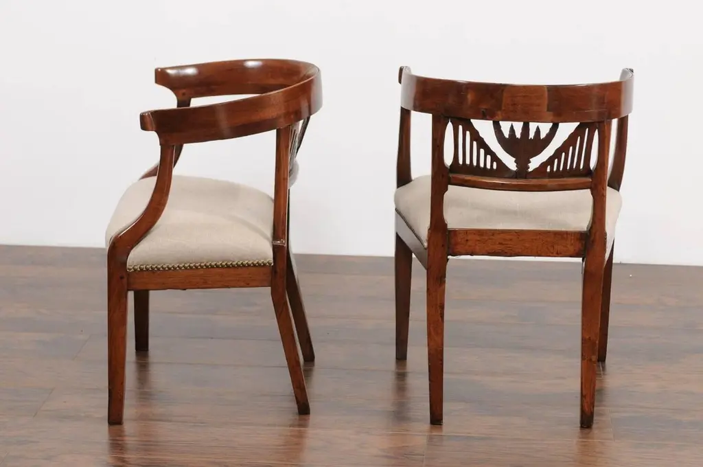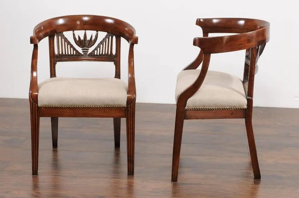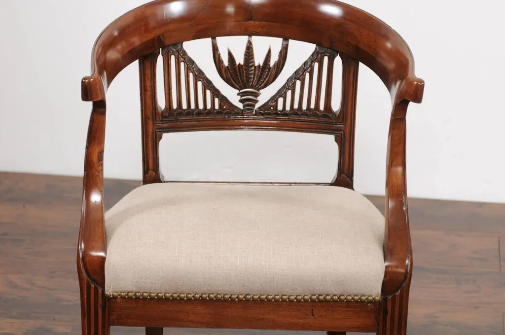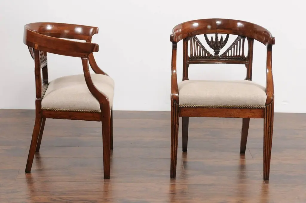 Two Italian walnut armchairs from the early 19th century with pierced splats, wraparound backs and new upholstery, priced and sold individually. Each of these Italian walnut armchairs features an exquisite wraparound back, adorned with an eye-catching carved splat. The delicately curved arms flank a linen-covered seat, accented by a brass nailhead trim. These arms flow into the front tapered and fluted legs, the back ones being slightly splayed. The warmth of the walnut patina, combined to the elegant lines and exquisite carved décor of these Italian armchairs, circa 1800, will make them an excellent choice for any home, whether placed in a living room, bedroom or office. The dimensions are slightly different for each chair, not noticeable if used as a pair. Each chair is $3,995. The measurements of the second armchair are 21" W x 15.25" D x 28" H (Seat: 17.75" H).