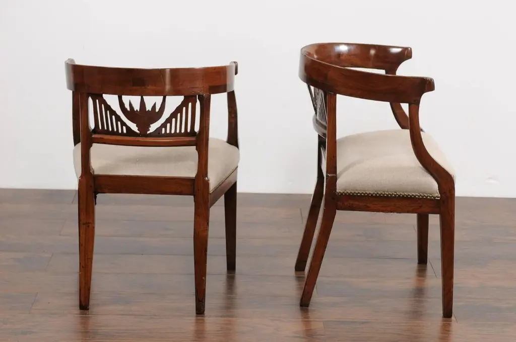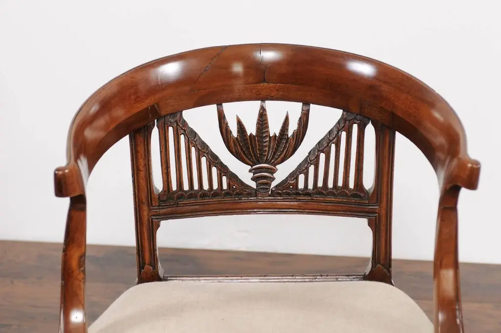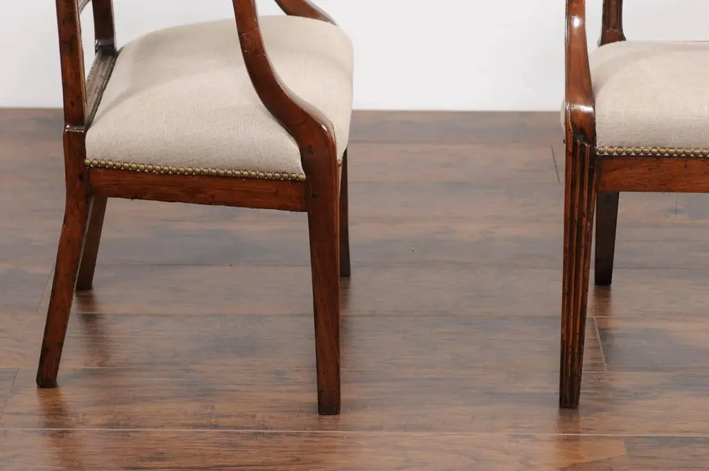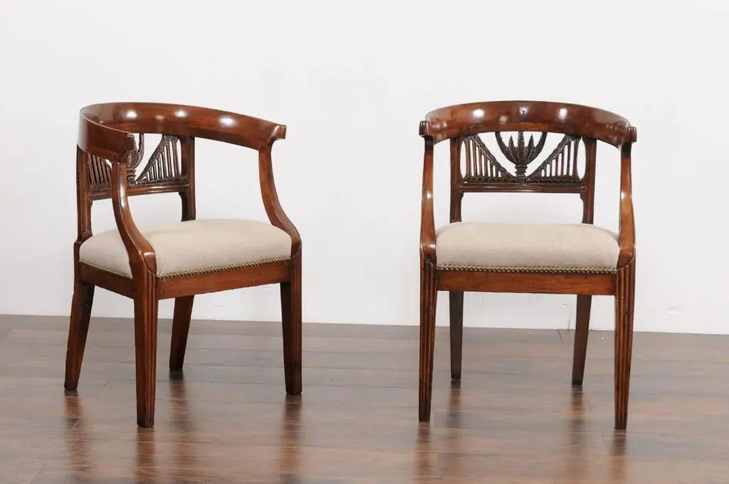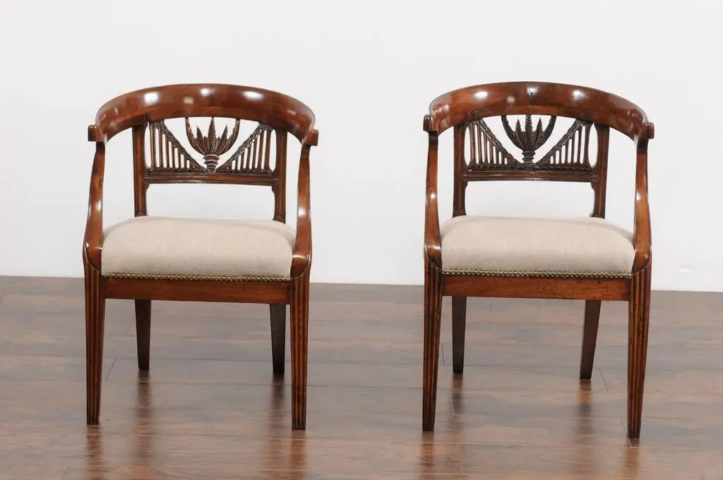 Two Italian walnut armchairs from the early 19th century with pierced splats, wraparound backs and new upholstery, priced and sold individually. Each of these Italian walnut armchairs features an exquisite wraparound back, adorned with an eye-catching carved splat. The delicately curved arms flank a linen-covered seat, accented by a brass nailhead trim. These arms flow into the front tapered and fluted legs, the back ones being slightly splayed. The warmth of the walnut patina, combined to the elegant lines and exquisite carved décor of these Italian armchairs, circa 1800, will make them an excellent choice for any home, whether placed in a living room, bedroom or office. The dimensions are slightly different for each chair, not noticeable if used as a pair. Each chair is $3,995. The measurements of the second armchair are 21" W x 15.25" D x 28" H (Seat: 17.75" H).