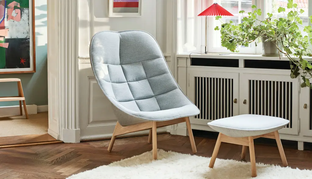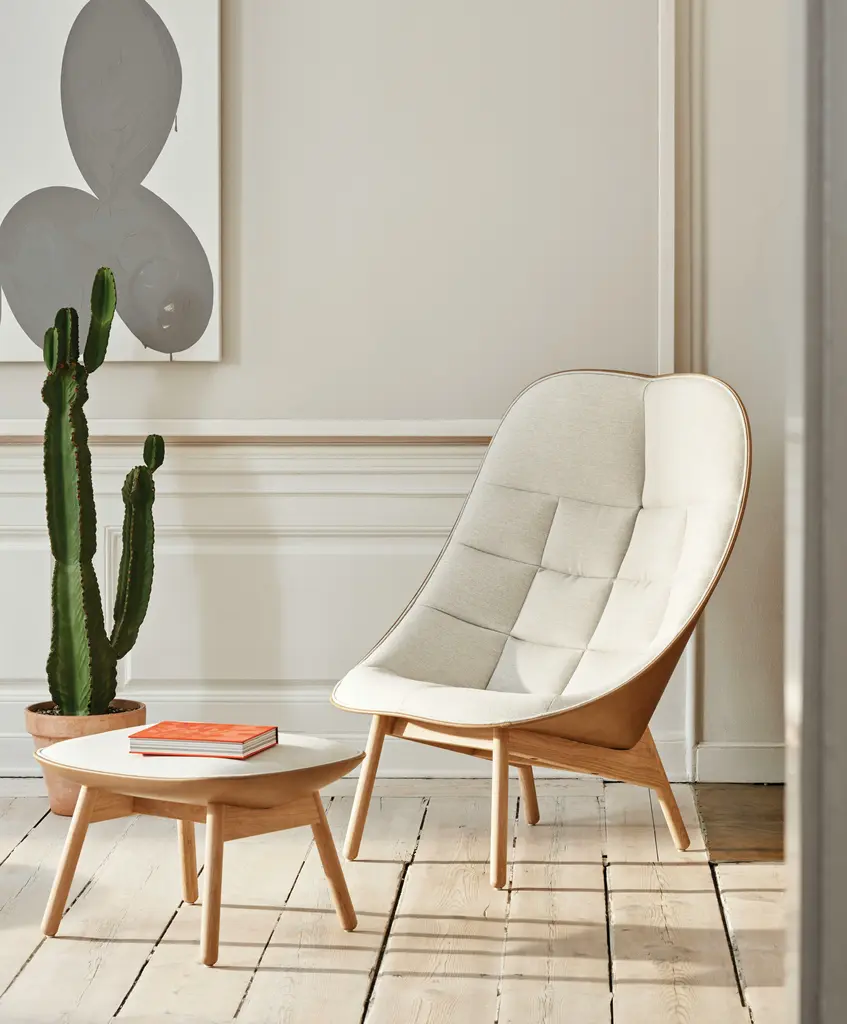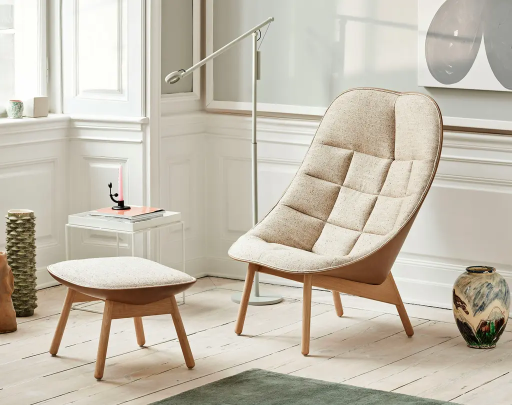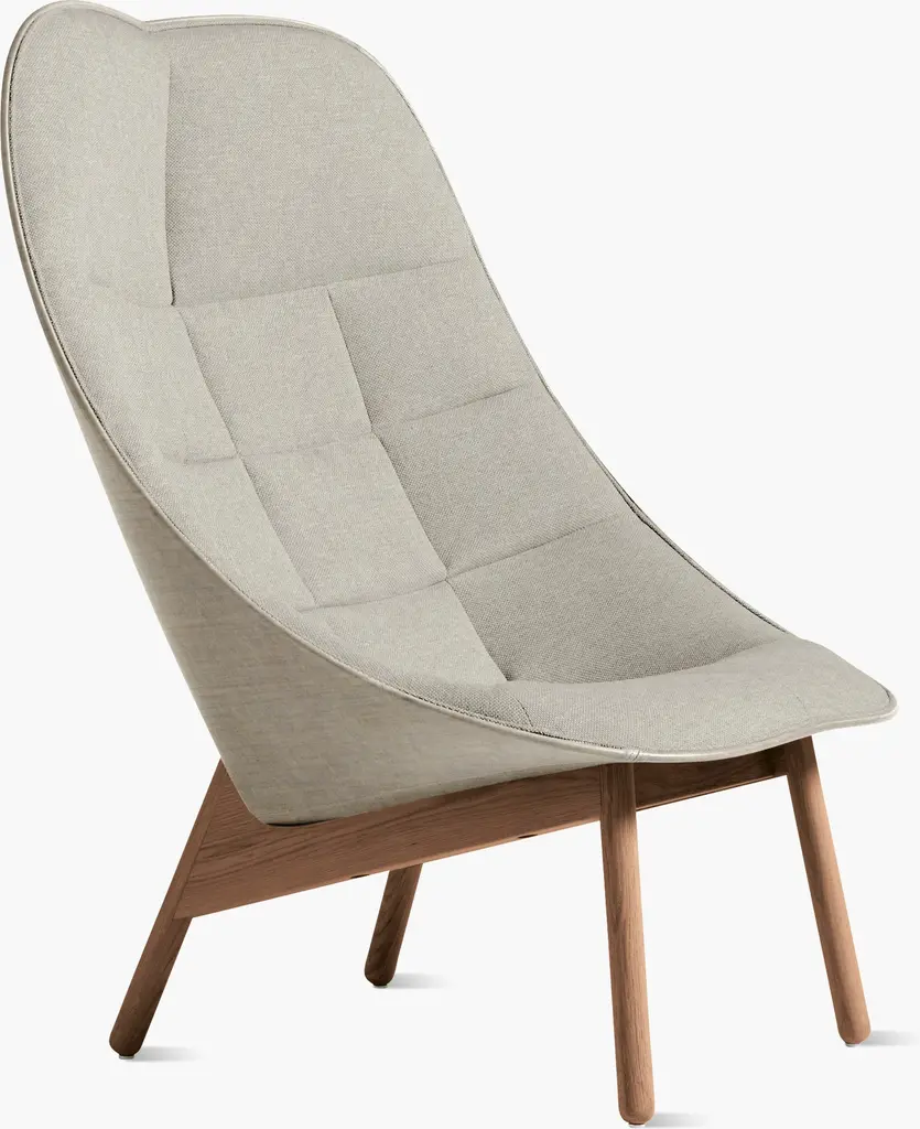 The Uchiwa Lounge Chair (2014) is a soft, open design, drawing inspiration for its profile from the traditional Japanese hand fan. Generous and inviting, it's ideal for extended lounging. It's upholstered in a mix of fabric and full-grain leather for an intriguing contrast in color and texture. Made in Poland.