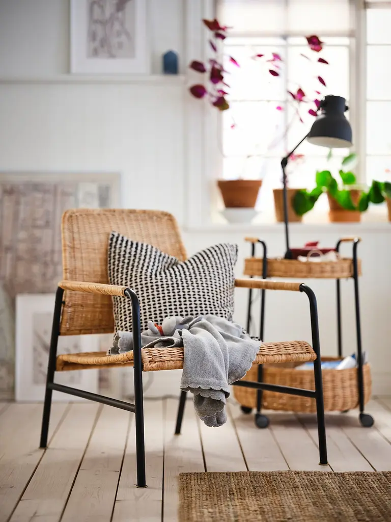 ULRIKSBERG Armchair - rattan/anthracite. Hand-woven backrest and seat by experienced craftspeople, which makes each armchair unique. The armchair is lightweight and easy to move if you want to clean the floor or rearrange the furniture. Easy to bring home since it’s lightweight and flat-packed.