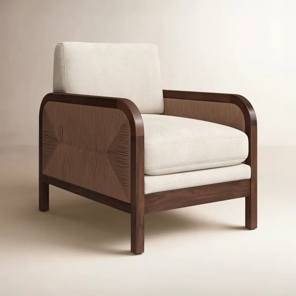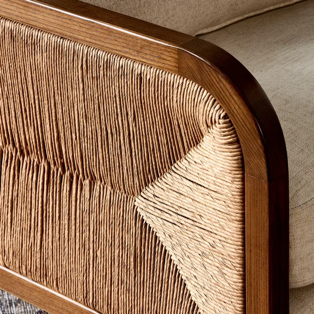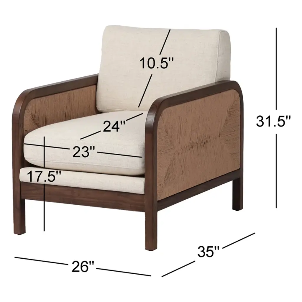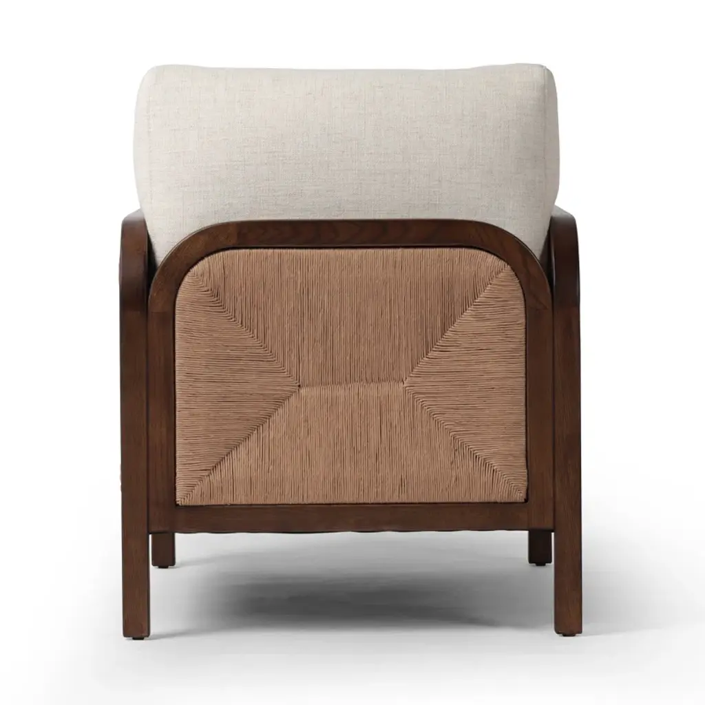 This upholstered armchair brings a mix of cozy comfort and textured charm to your living space. The neutral polyester blend upholstery complements a variety of decor styles, while the low-profile solid wood frame gives it a modern silhouette. This chair features sinuous springs and a feather blend filling in the cushion for a plush spot to sit while you read or watch TV. But the standout design element is the textured rattan accents on the back and round arms, adding a touch of natural coastal flair. To keep this armchair looking its best, simply spot clean with a dry, solvent-based cleaner when needed.