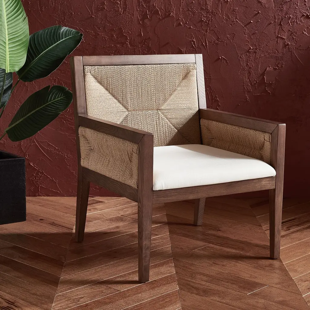 Create a comfy spot to sit and relax with our Upton accent chair. Our modern and neatly proportioned chair is updated with a beautifully woven back and arms. It showcases a rush weave pattern to attain simple yet striking graphics. The natural textures are framed with an ash wood frame and sleek tapered legs. With a comfy armrest and slim padded seat, our accent chair elevates your home with modern elegance and the cozy warmth of natural textures.