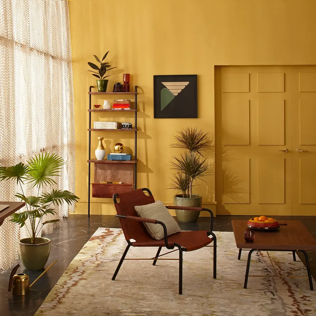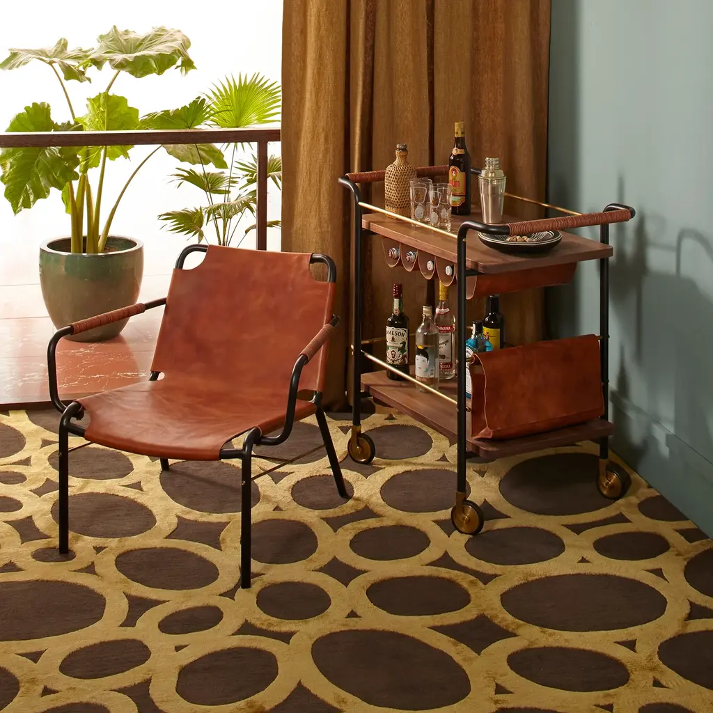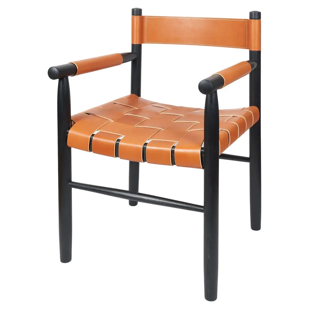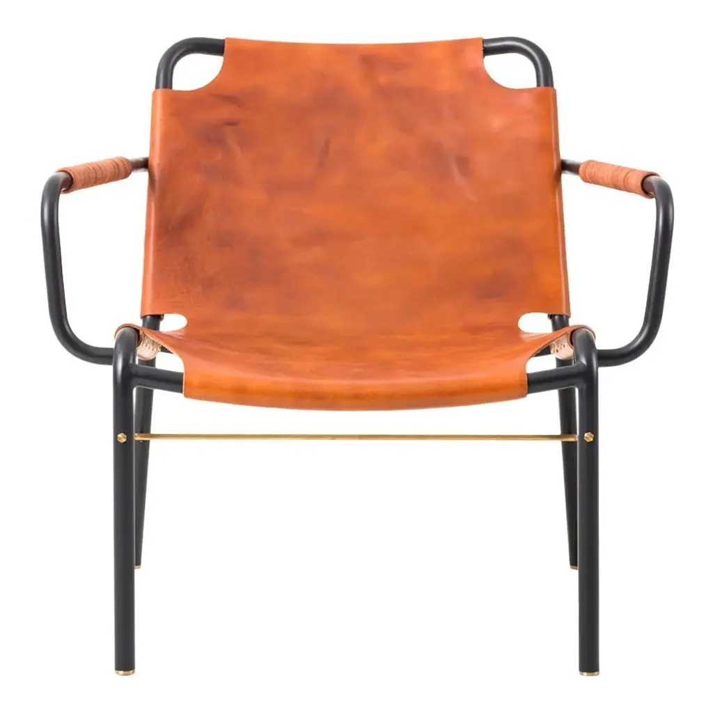The Valet Lounge Chair features a sculpted steel frame that curves around a seamless saddle-leather seat. Blackened, powder-coated steel is accented with brass hardware and detailed with leather cord wrapping on the arms.
