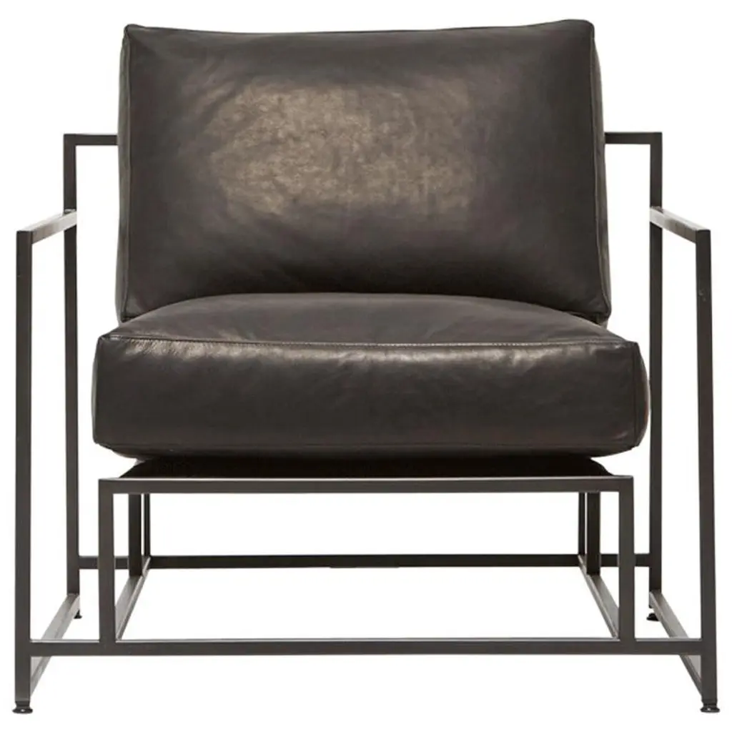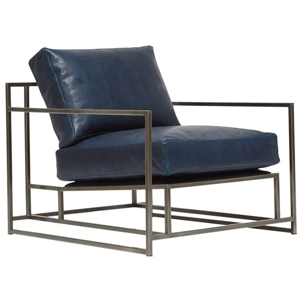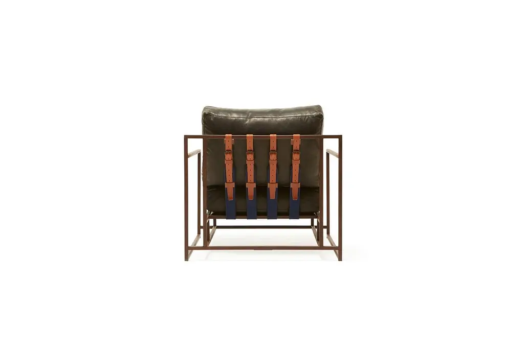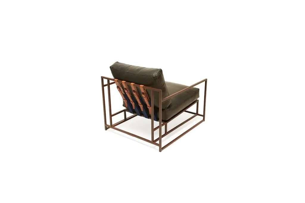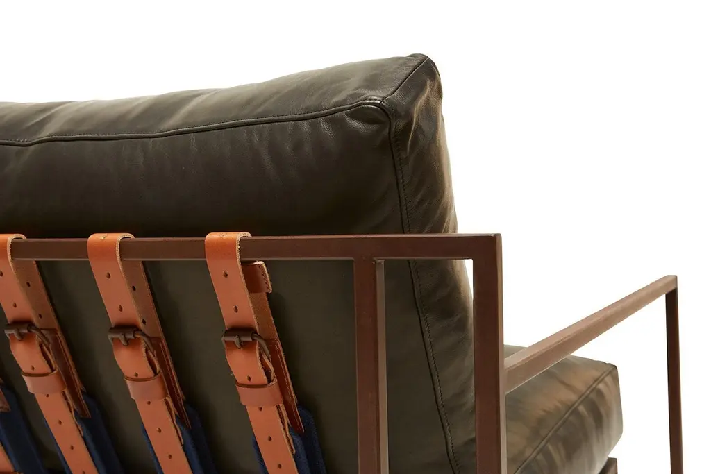 The Inheritance Armchair by Stephen Kenn is as comfortable as it is unique. The design features an exposed construction composed of three elements - a steel frame, plush upholstery, and supportive belts. The deep seating area is perfect for a relaxing lounge experience. Every Stephen Kenn piece is made to order through our Los Angeles studio in partnership with a number of small businesses and fabricators in the LA area. With this highly customizable armchair you can select from a wide range of finishes and materials to complement your home and lifestyle - please message us to see our Customization Guide with all available options.This version of our Inheritance Armchair is upholstered in grey nubuck leather from the Valhalla Collection by Moore & Giles. The foam seat cushion has been wrapped in down for added comfort and sits atop a blackened steel frame. The armchair is strapped with support belts featuring indigo cotton webbing, cognac leather, and marbled rust buckles.