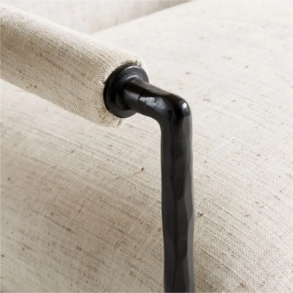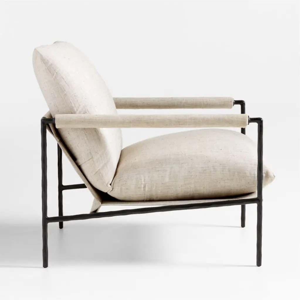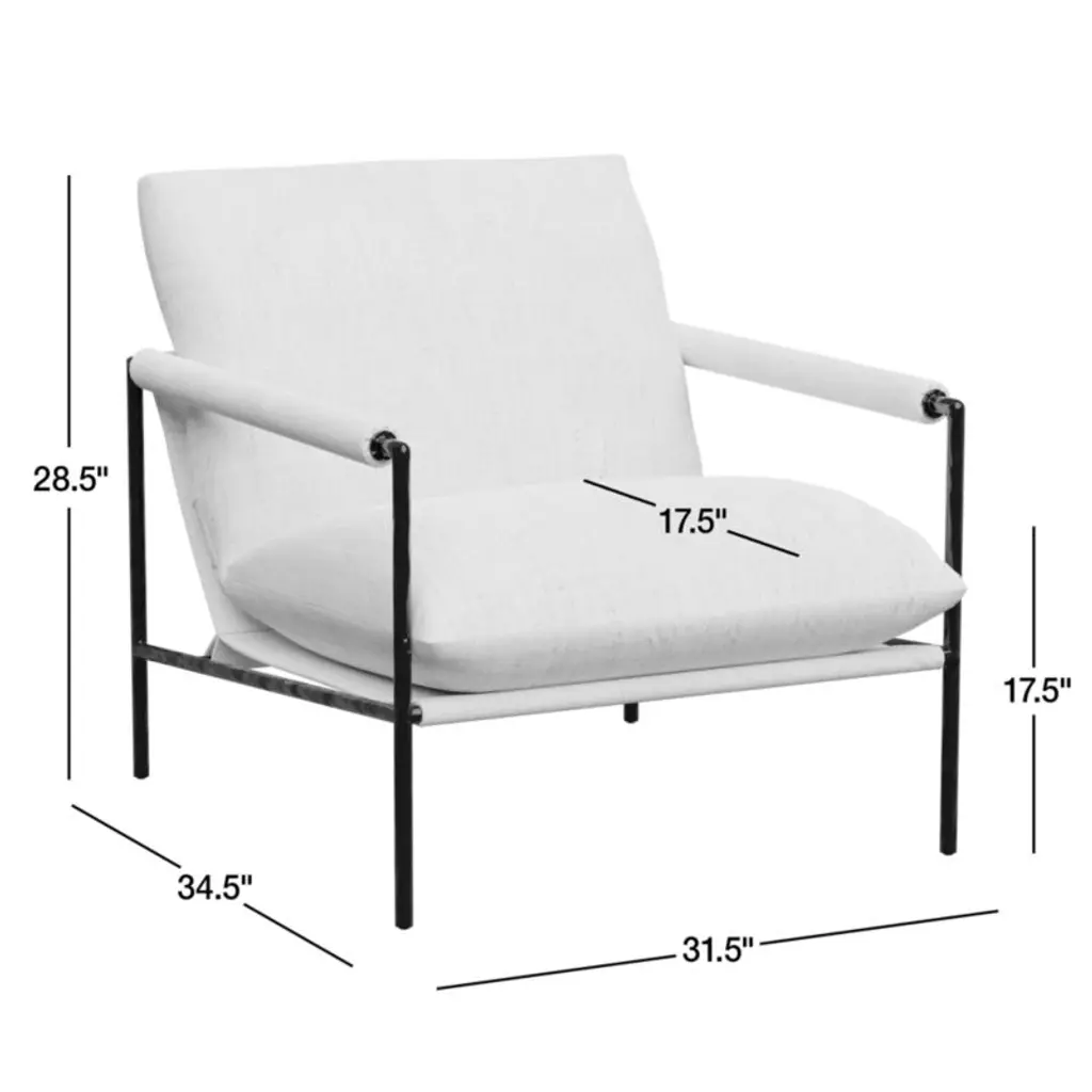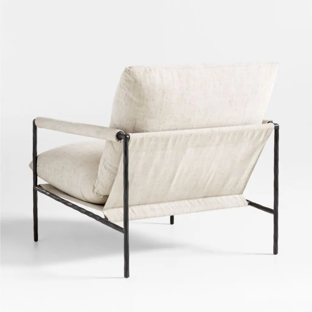 Our Valle accent chair brings an architectural edge to its breezy, coastal cool. Hammered and finished in matte black, metal rods construct the slim, linear frame accented with disc details on the padded bolstered arms. Linen-like off-white upholstery wraps around the frame to shape a sling suspension. The removable seat and back cushions bring lounge-worthy comfort to this sophisticated chair.