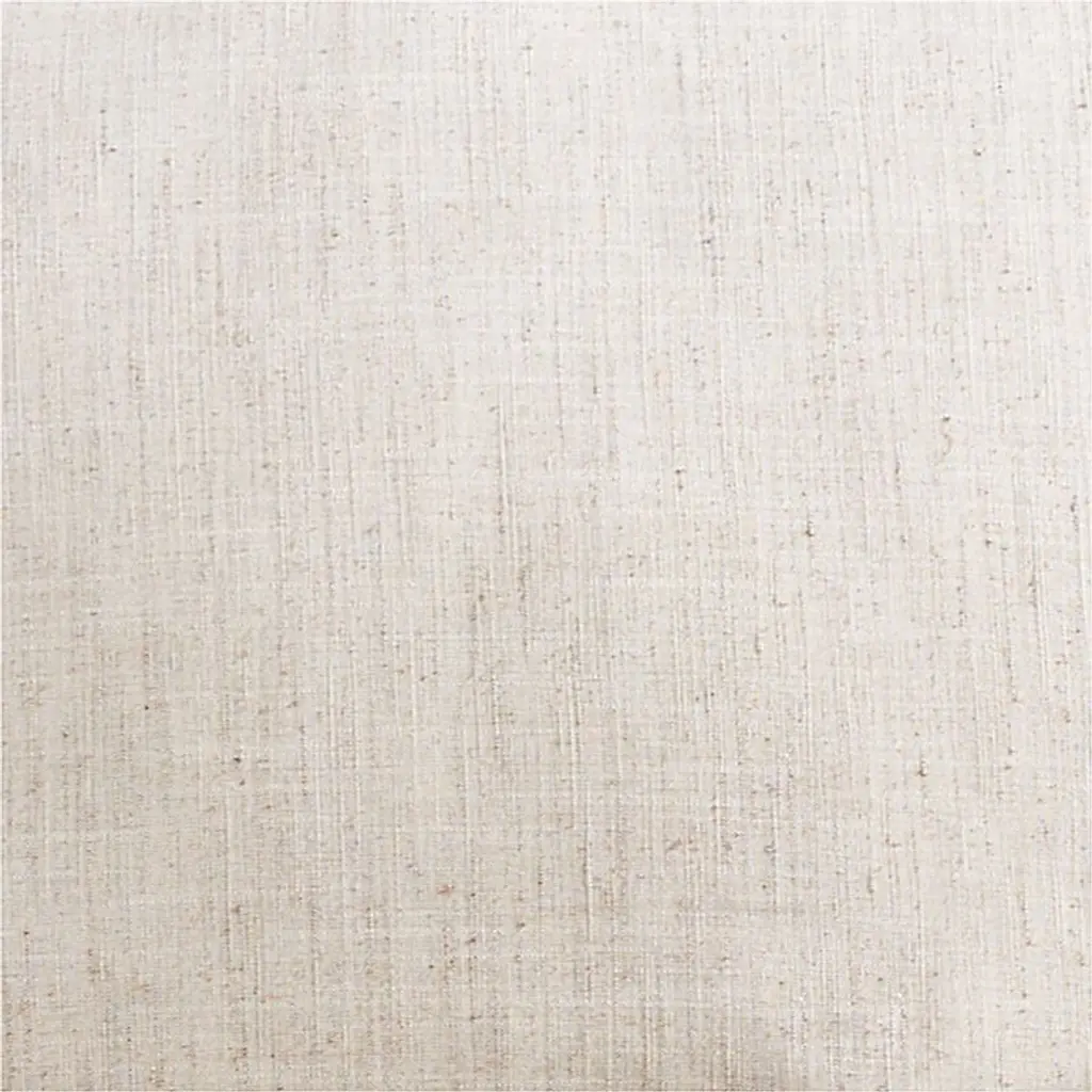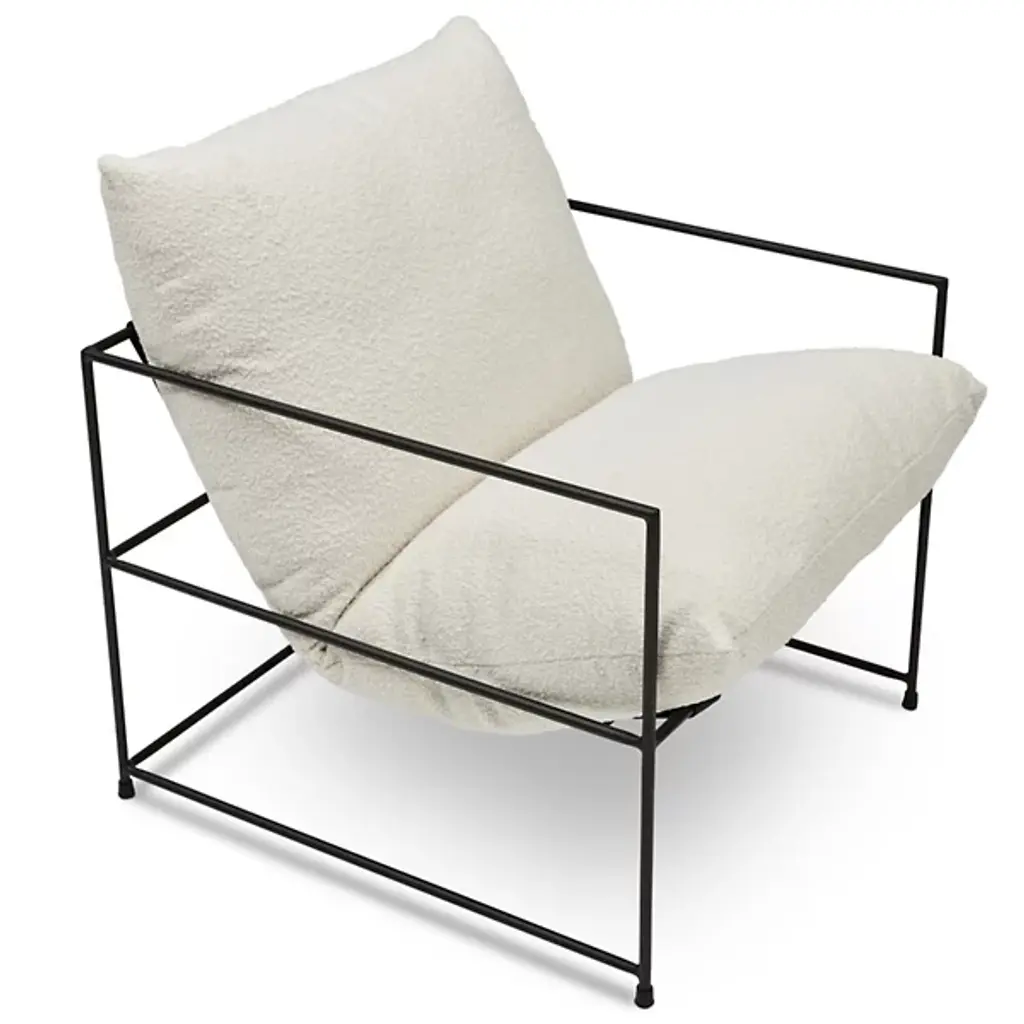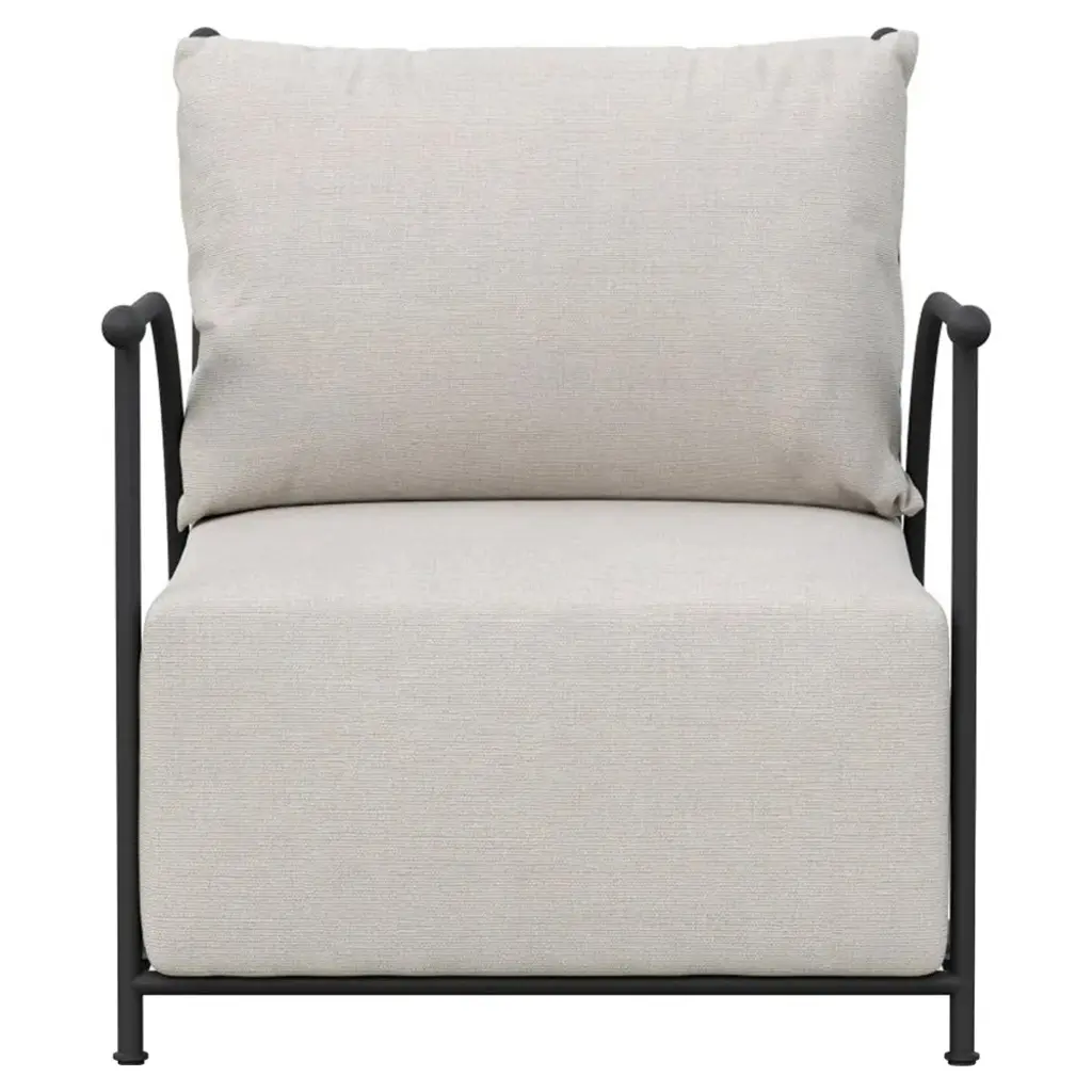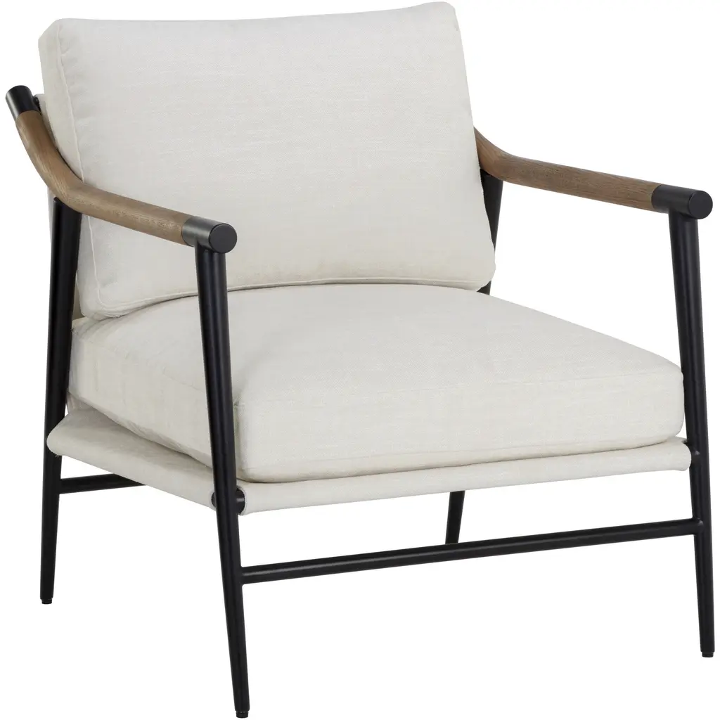 Our Valle accent chair brings an architectural edge to its breezy, coastal cool. Hammered and finished in matte black, metal rods construct the slim, linear frame accented with disc details on the padded bolstered arms. Linen-like off-white upholstery wraps around the frame to shape a sling suspension. The removable seat and back cushions bring lounge-worthy comfort to this sophisticated chair.
