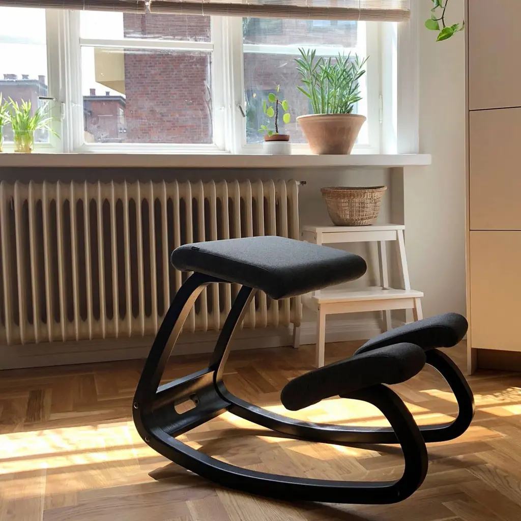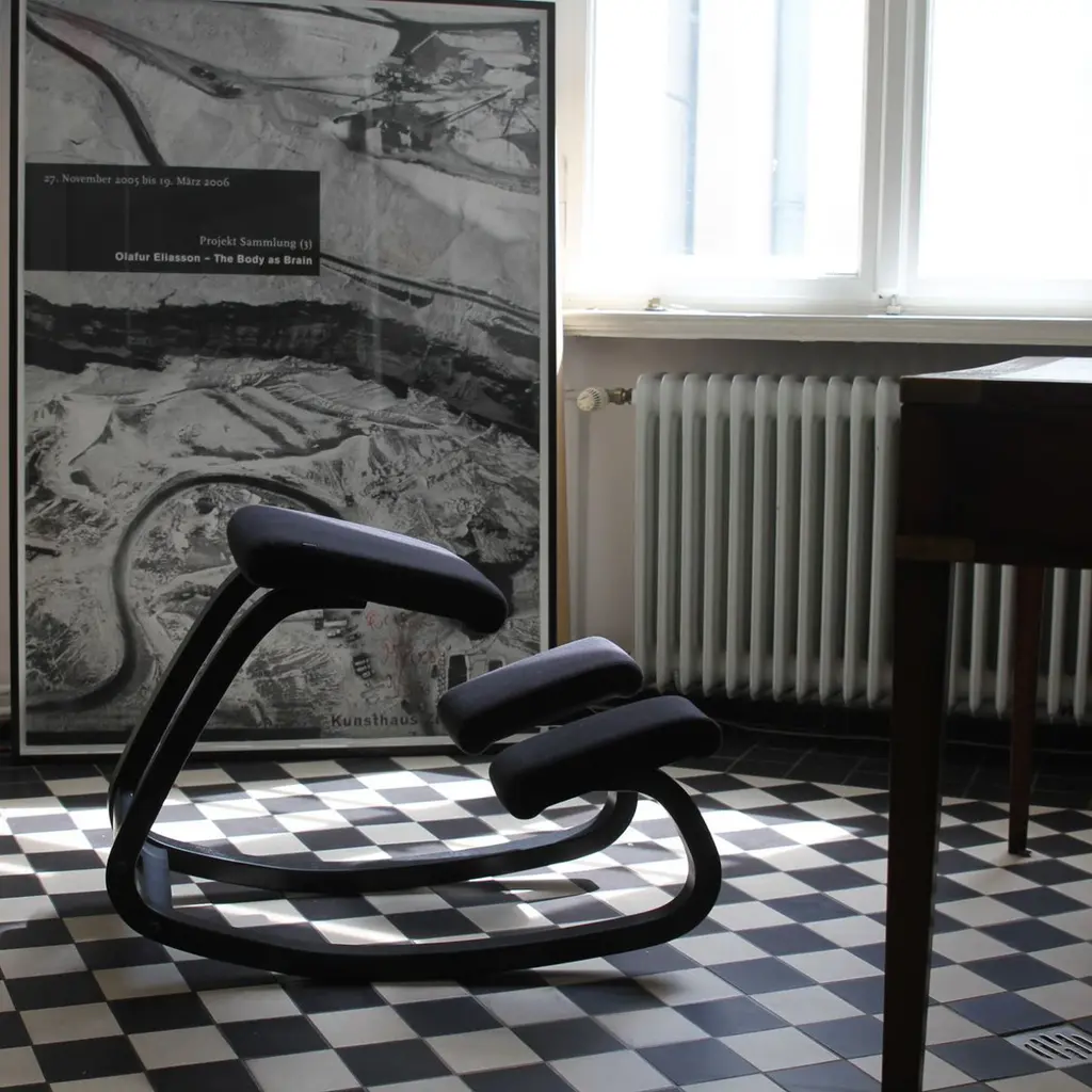 An iconic kneeling chair gets a stylish makeover that only accentuates its extraordinary design. Created in 1979 by Peter Opsvik, the Balans® chair now comes in a monochrome series for an even more elegant look. Designed to improve posture and well-being, the Variable Balans® Monochrome Chair enables users to sit or relax in a wide range of positions. The tilted seat and lower cushions offer excellent support and provide incredible flexibility. Additionally, the wooden runners are curved to allow users to tilt backward or forward. This series features matching wood finishes and upholstery colors that range from muted to vibrant. While the wood frame features a water-based lacquer, the upholstery is made from a blend of 95% worsted wool and 5% nylon with a simple weave.