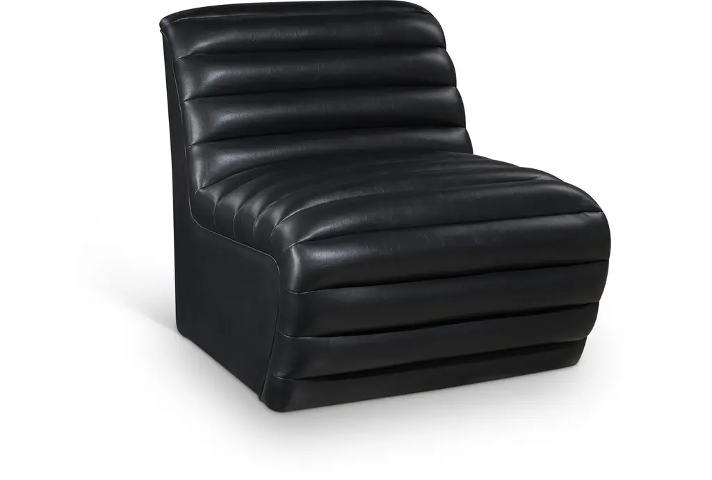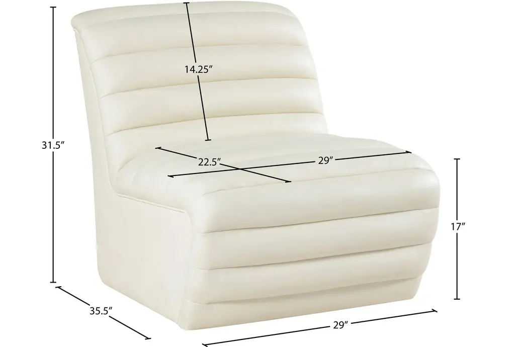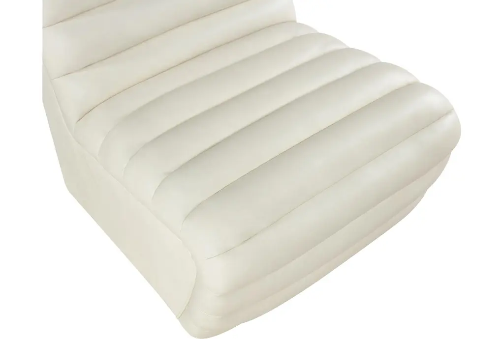 Enhance your living space with the Vega Cream Vegan Leather Upholstered Accent Chair. This modern armless chair brings a touch of minimalist maximalism to any room, offering a sleek and comfortable seating option. Upholstered in soft cream vegan leather, this chair is designed for both style and durability, making it a perfect addition to your living room or bedroom suite.