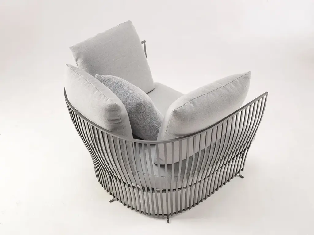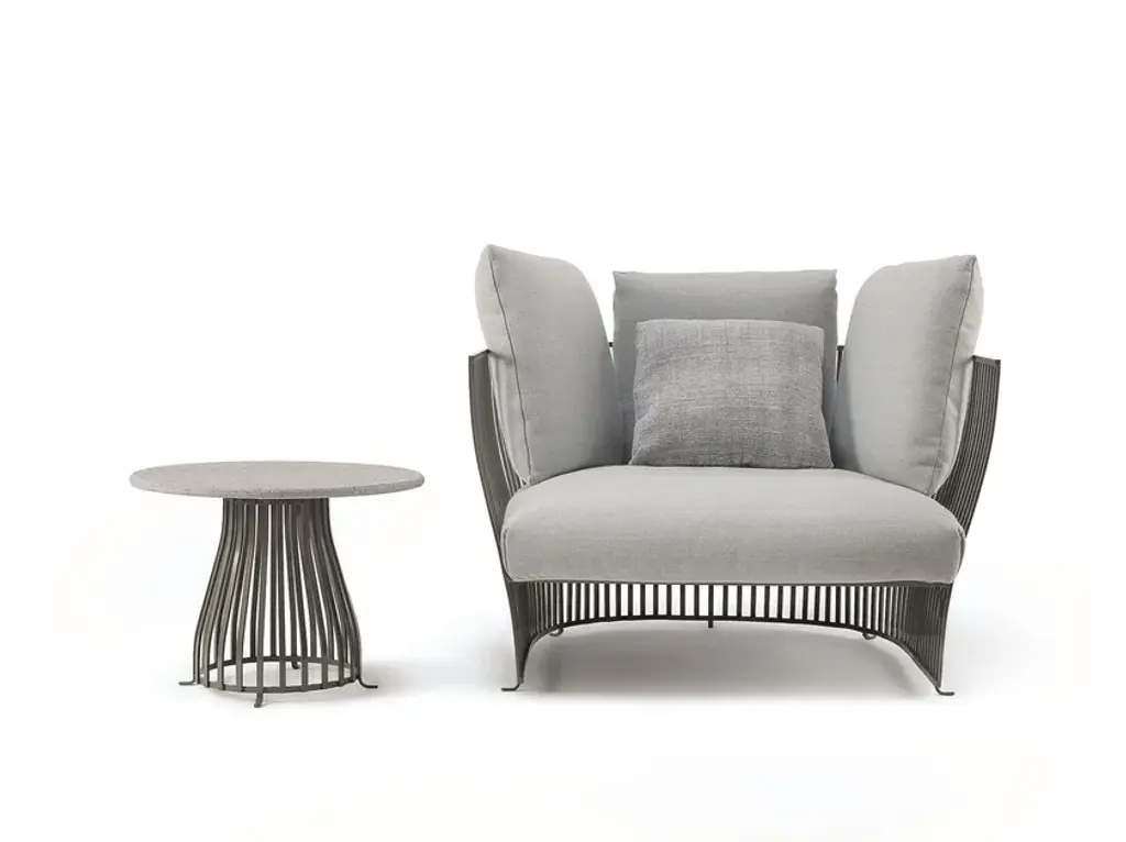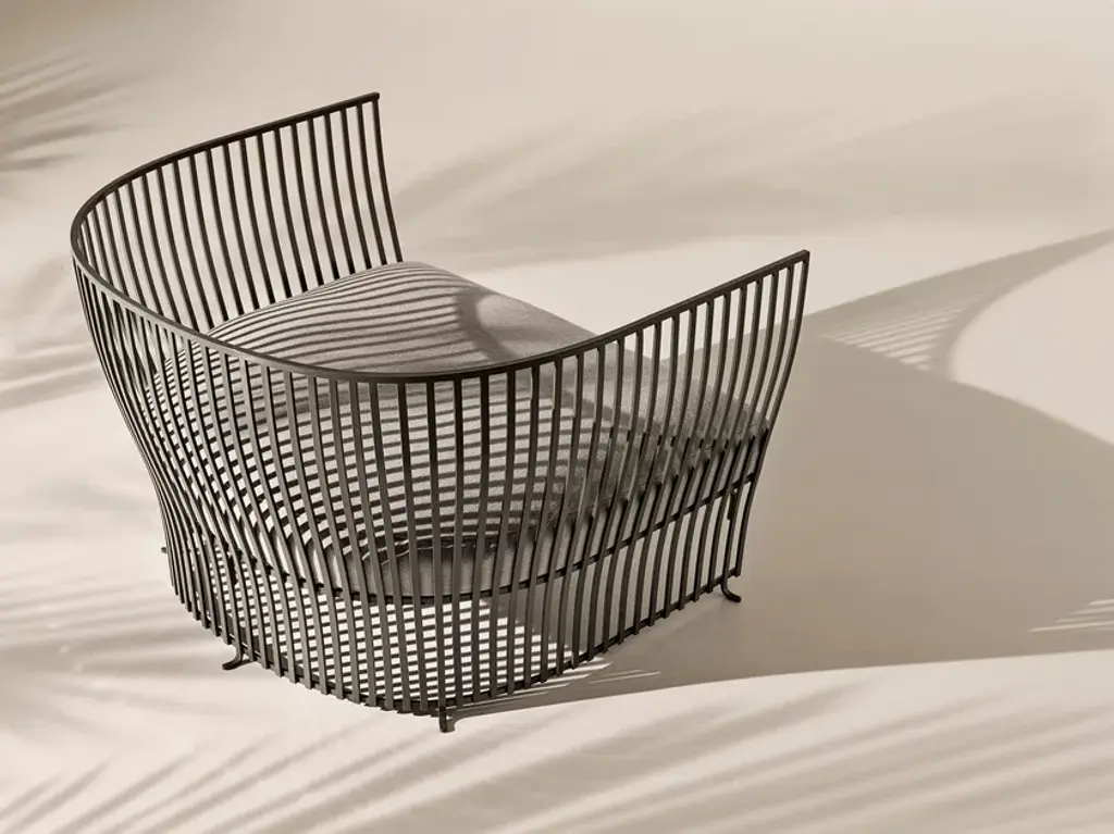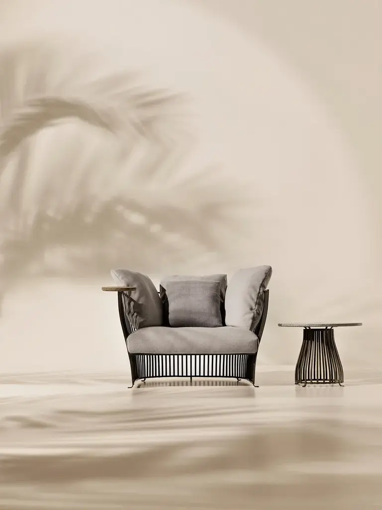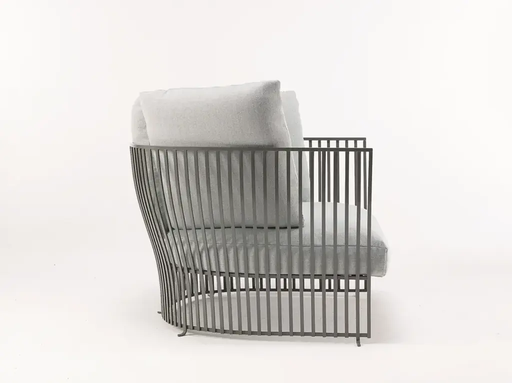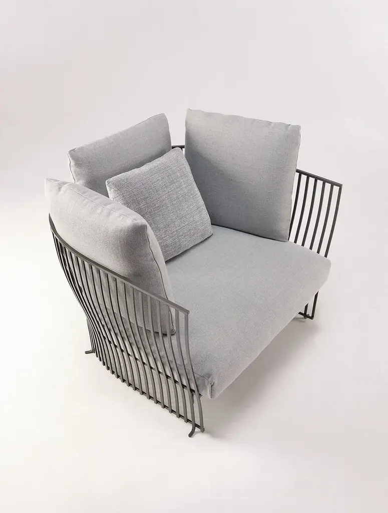 Venexia is a fabric and aluminum garden armchair with armrests by Ethimo, design by Luca Nichetto.Venexia is the new design challenge from Ethimo and Luca Nichetto. A lounge collection inspired by nineteenth-century urban design, with the addition of the aesthetic and functional aspects of furnishings for contemporary residential or contract use, where the aim is to improve the quality of outdoor spaces, guaranteeing a new al fresco feel-good experience. Visually reminiscent of old-fashioned railings, the structure of the furniture is made of a refined harmonious series of very thin aluminium slats, shaped with ad hoc moulds to ensure uniformity. The ornate result is a collection featuring big proportions, light to the eye yet conveying a feeling of solidity and robustness.Venexia comprises lounge armchairs, a two-seater sofa, and a chaise longue that can either be used on their own or arranged together to create a large sofa or daybed. The collection also includes occasional tables with lava-stone or enamelled terracotta tops, available in two sizes: 90 cm in diameter and 42.5 cm high, or with a diameter of 60 cm and a height of 48 cm. The modularity of the elements makes it possible to create pleasing compositions to furnish a wide variety of outdoor settings with a delicate sense of harmony for socialising in comfort. The padding in the big, soft cushions is made from recycled materials and completely waterproof, and they are upholstered in exceptionally soft, 100% outdoor fabric. With their special texture, they help to create an even more surprising look.Available in dark grey, the structure of Venexia is treated with a powder coating to guarantee it lasts longer, its beauty unaltered, when used outside.Venexia is a sinuous form of elegance created specifically for practical new al fresco living.