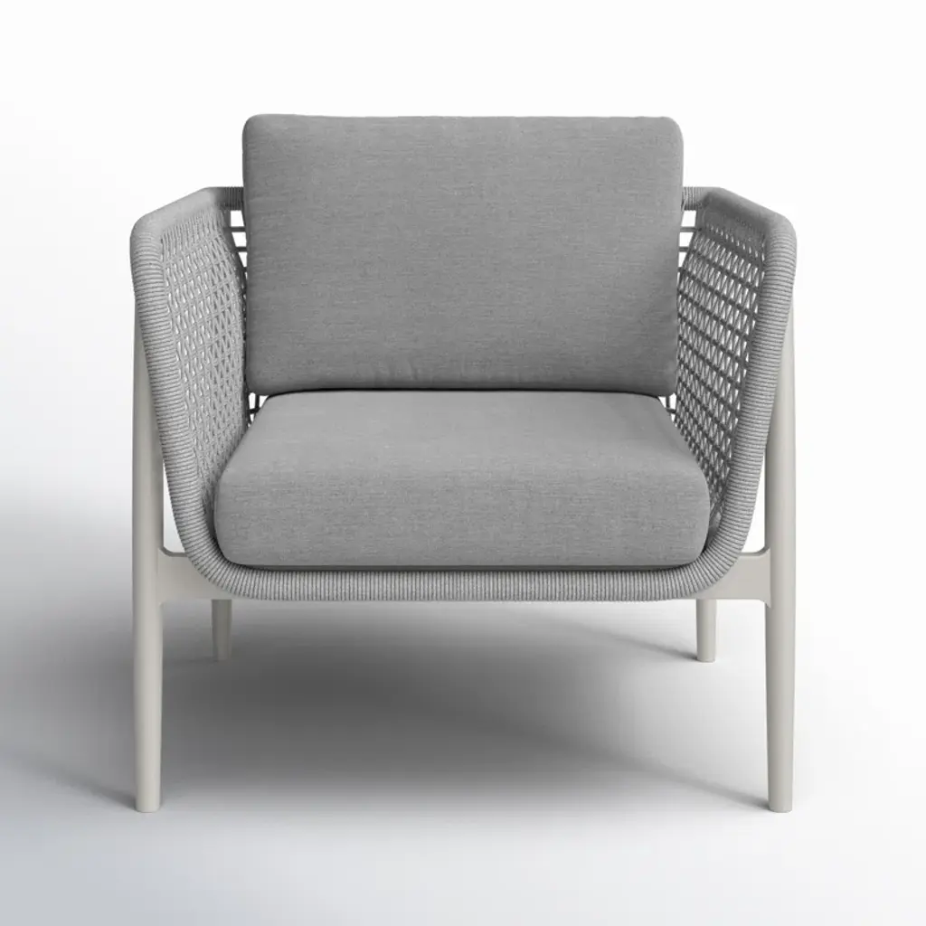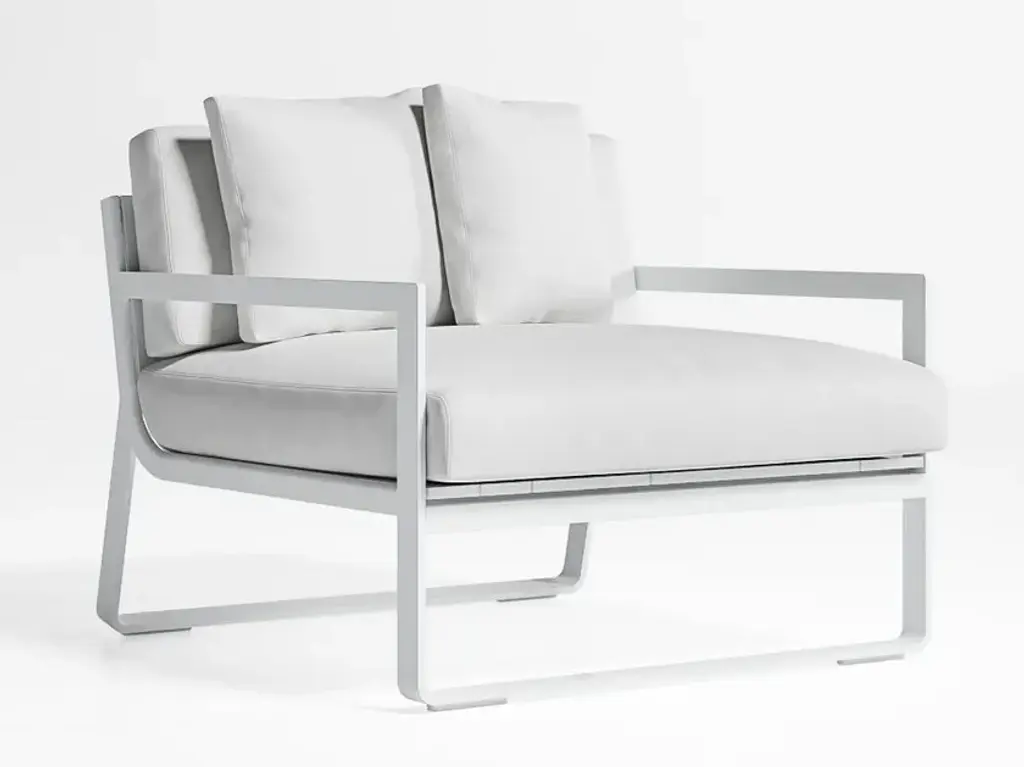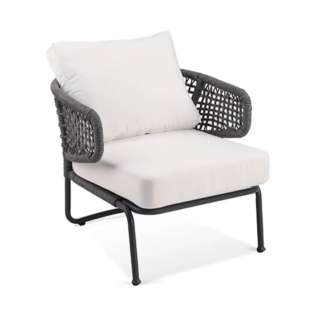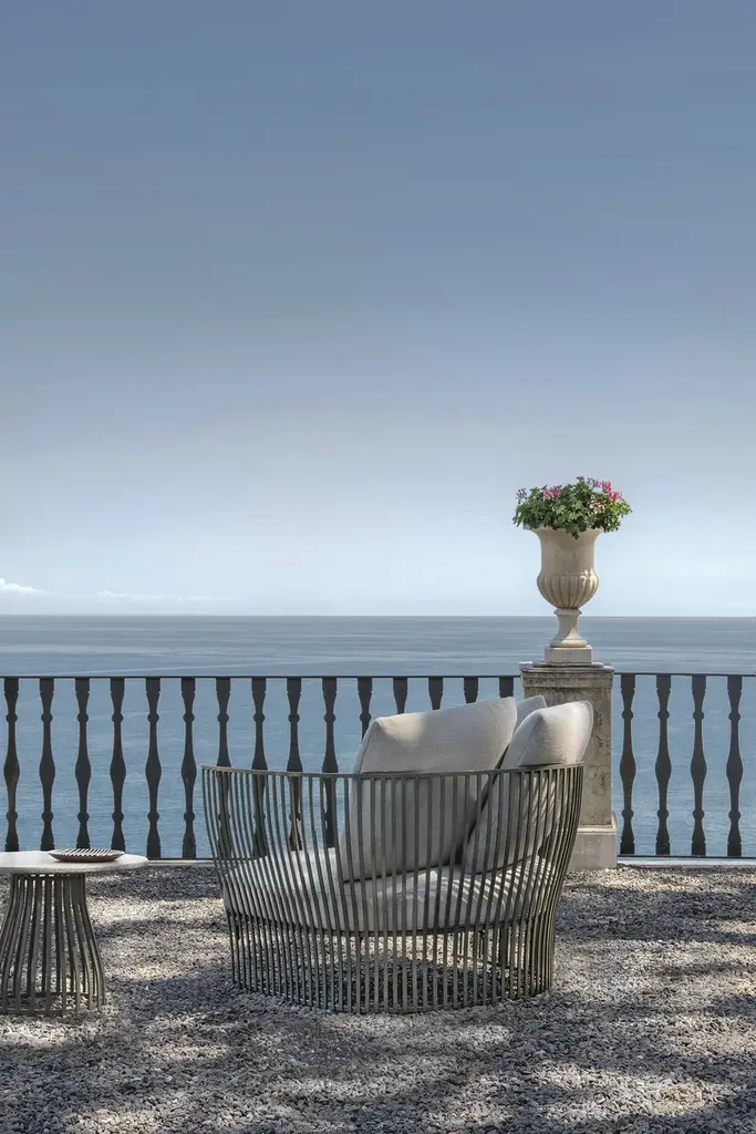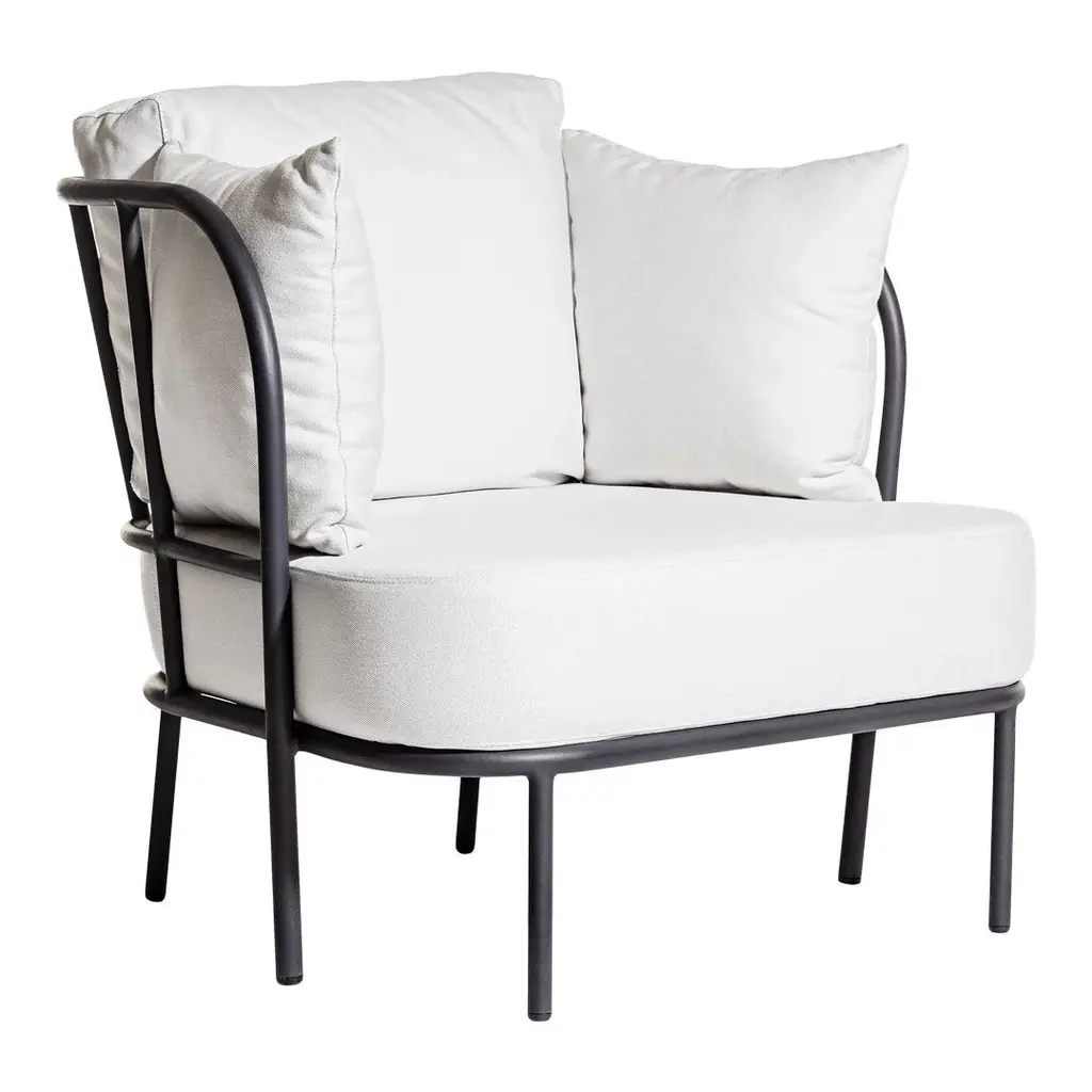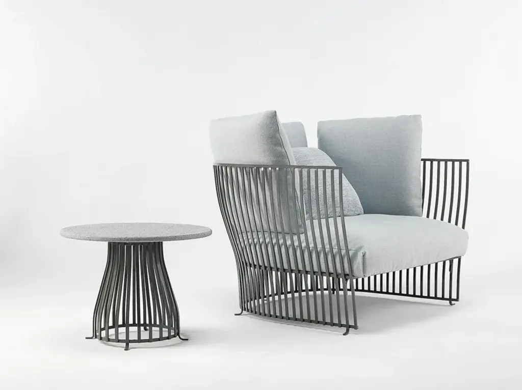 Venexia is a fabric and aluminum garden armchair with armrests by Ethimo, design by Luca Nichetto.Venexia is the new design challenge from Ethimo and Luca Nichetto. A lounge collection inspired by nineteenth-century urban design, with the addition of the aesthetic and functional aspects of furnishings for contemporary residential or contract use, where the aim is to improve the quality of outdoor spaces, guaranteeing a new al fresco feel-good experience. Visually reminiscent of old-fashioned railings, the structure of the furniture is made of a refined harmonious series of very thin aluminium slats, shaped with ad hoc moulds to ensure uniformity. The ornate result is a collection featuring big proportions, light to the eye yet conveying a feeling of solidity and robustness.Venexia comprises lounge armchairs, a two-seater sofa, and a chaise longue that can either be used on their own or arranged together to create a large sofa or daybed. The collection also includes occasional tables with lava-stone or enamelled terracotta tops, available in two sizes: 90 cm in diameter and 42.5 cm high, or with a diameter of 60 cm and a height of 48 cm. The modularity of the elements makes it possible to create pleasing compositions to furnish a wide variety of outdoor settings with a delicate sense of harmony for socialising in comfort. The padding in the big, soft cushions is made from recycled materials and completely waterproof, and they are upholstered in exceptionally soft, 100% outdoor fabric. With their special texture, they help to create an even more surprising look.Available in dark grey, the structure of Venexia is treated with a powder coating to guarantee it lasts longer, its beauty unaltered, when used outside.Venexia is a sinuous form of elegance created specifically for practical new al fresco living.