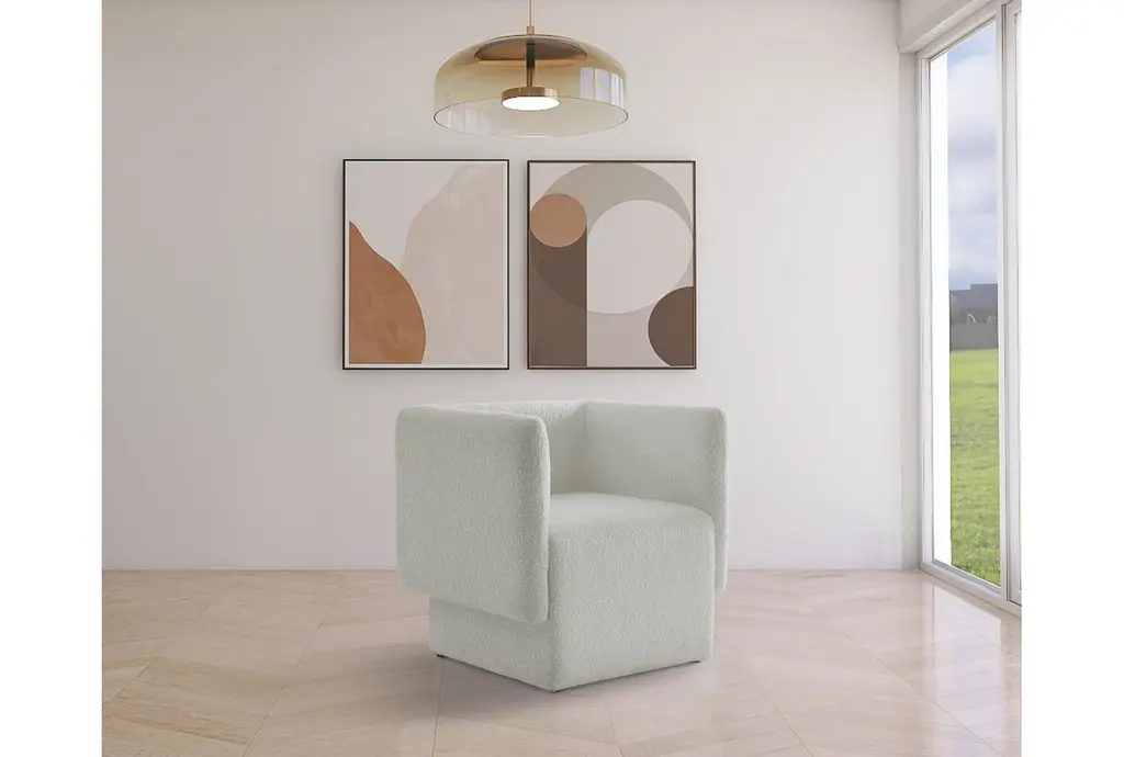 The Vera Cream White Boucle Fabric Accent Chair with Arms is a stylish addition to any living room. Its modern design and neutral cream color make it a versatile piece that can blend seamlessly with various decor styles. The boucle fabric adds texture and comfort, making it perfect for relaxing in style.