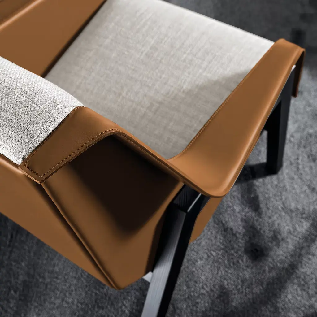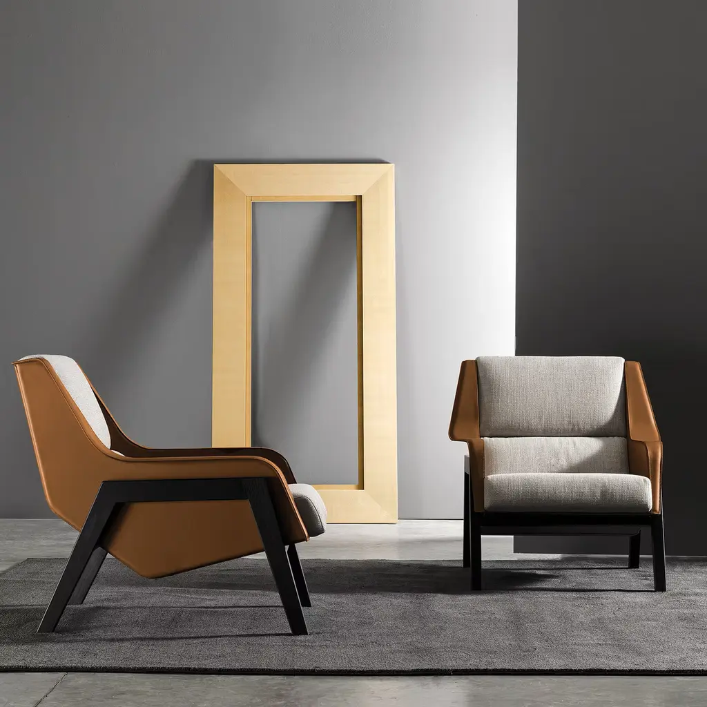 The intriguing structure of this sculptural armchair comes from the combination of bold elements marked by distinctive colors and silhouettes. The black-stained ash legs frame the fractured line formed by the cushions of seat, back, and headrest in gray fabric, flanked by enclosing armrests clad in light brown leather.