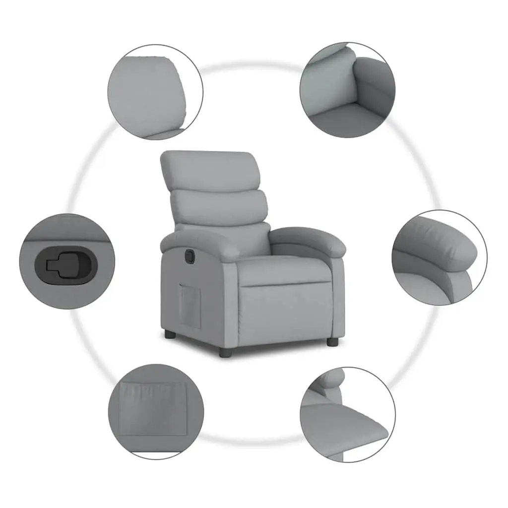 This recliner chair boasts a stylish light gray fabric and is designed for ultimate comfort, making it perfect for relaxation after a long day. The ergonomic design promotes gentle support, making it an inviting piece for reading, watching movies, or unwinding in your living space, seamlessly fitting into modern decor while enhancing your lounge experience. Ultimate Comfort: The ergonomic structure provides superior support, making it an excellent choice for anyone looking to relax. Your body will thank you after a few long hours of sitting in the plush upholstery.Adjustable Mechanism: With multiple reclining positions, you can customize the angle according to your enjoyment, whether you want to lean back for a nap or sit upright while enjoying a book or movie.Durable Material: Crafted from breathable fabric, the chair ensures air circulation, preventing heat buildup, which makes even lengthy seating pleasurable and refreshing.Compact Design: The chair's dimensions are perfect for small spaces, providing comfort without overwhelming a room. This makes it ideal for apartments, home theaters, and cozy living rooms.Easy Maintenance: Cleaning is straightforward; simply wipe spills with a damp cloth, ensuring your recliner remains fresh and appealing through everyday use.