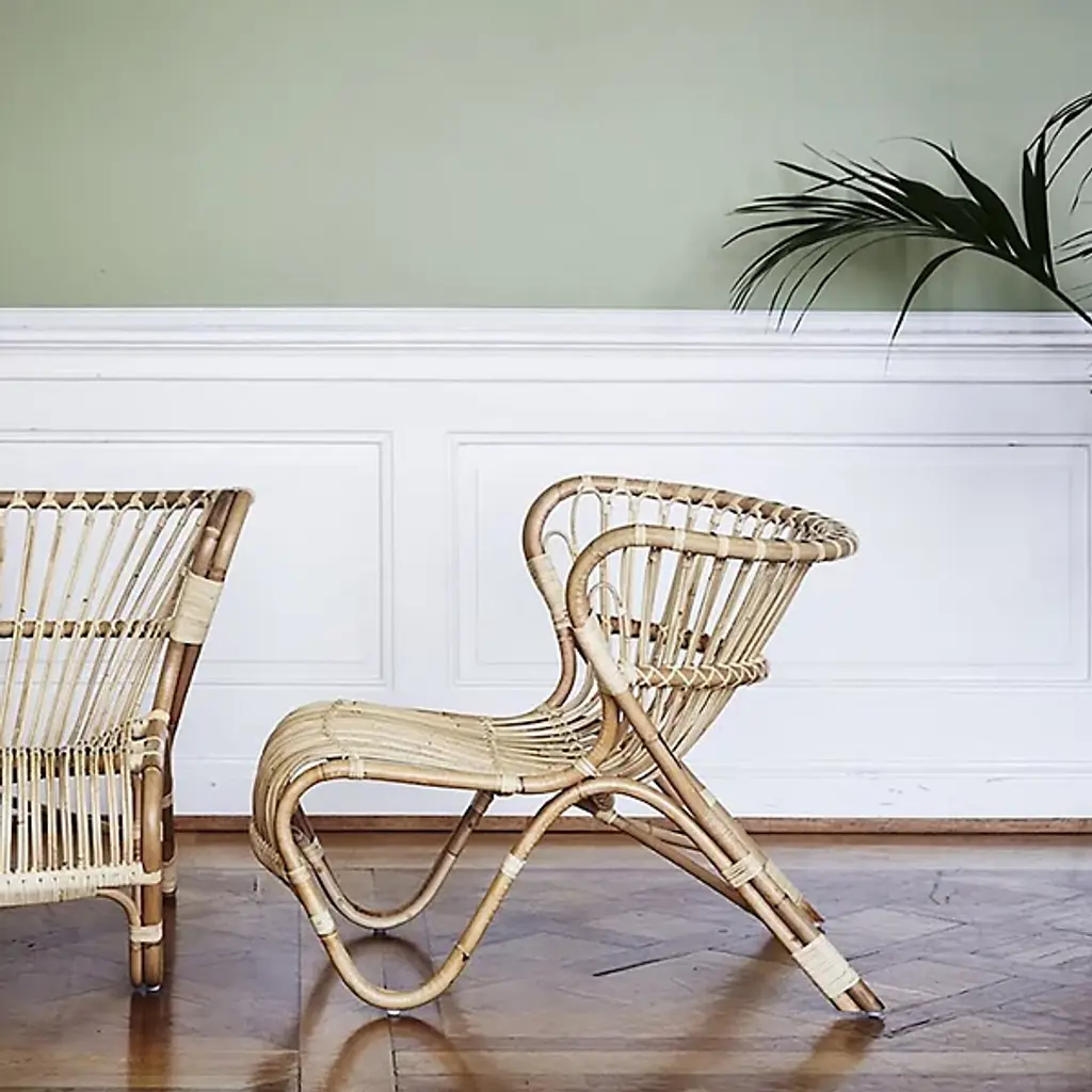 Viggo Boesen Fox Rattan Lounge Chair from Sika Design fits effortlessly into any Living Room, Bedroom, or Office setting. It showcases the elegant, sculptural lines iconic to the Icons Collection, adding a touch of Mid-Century Modern flair to your space. Crafted from sustainable rattan, this chair embodies timeless European design while being mindful of environmental impact. The durable, lightweight nature of rattan makes it a practical option for versatile indoor decorating needs.