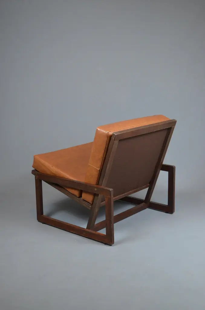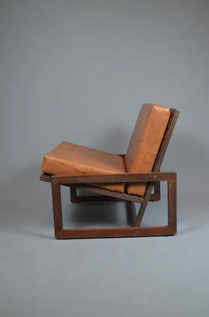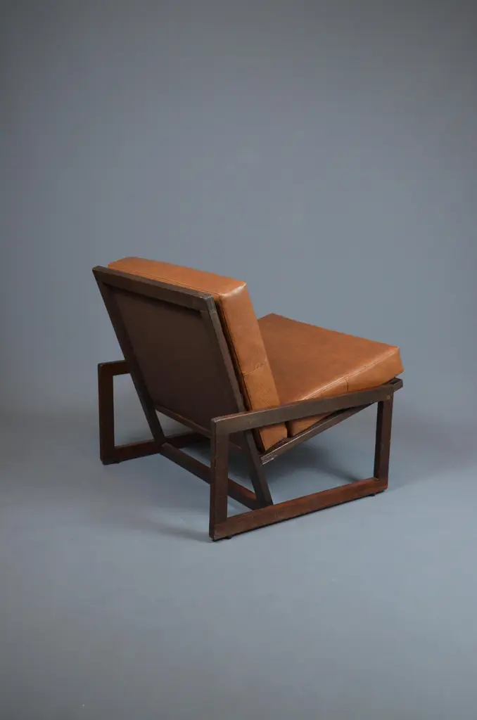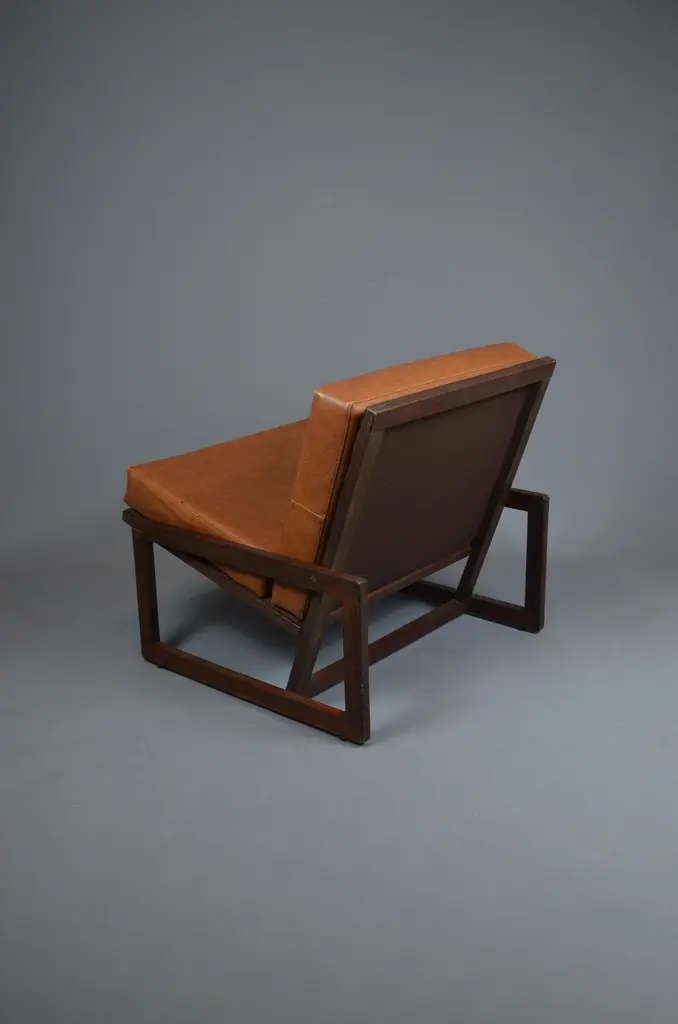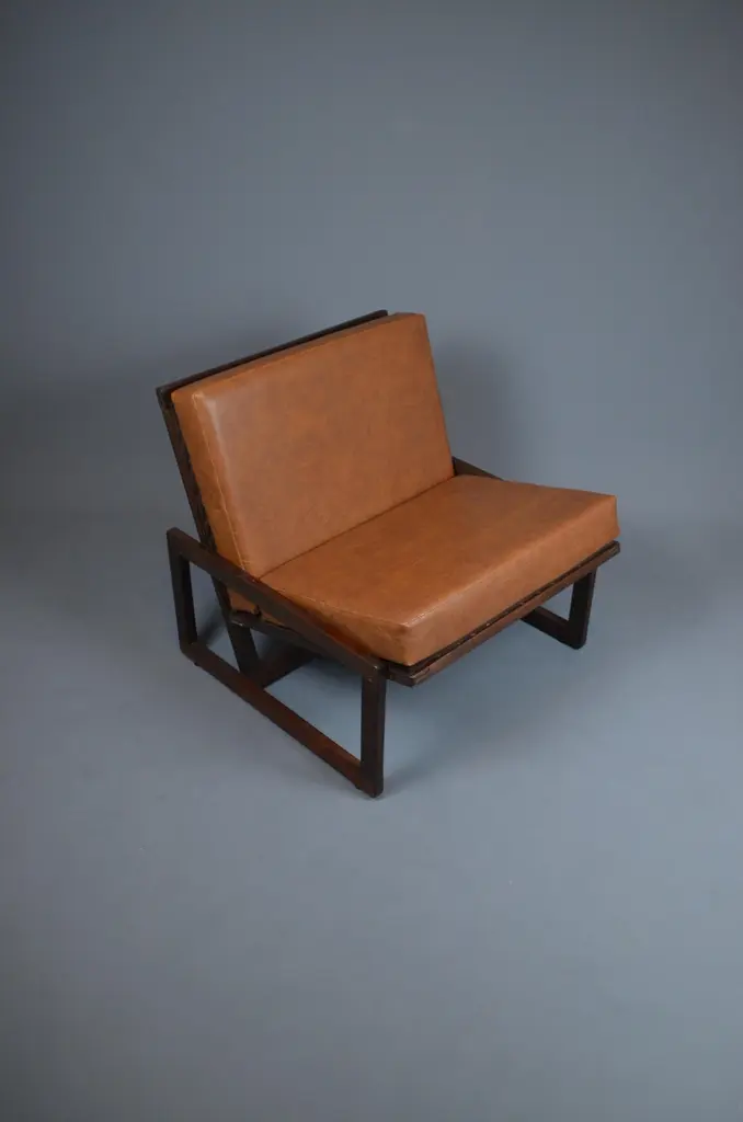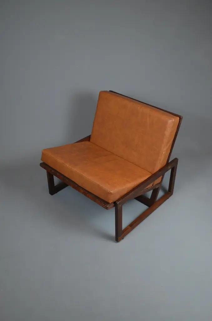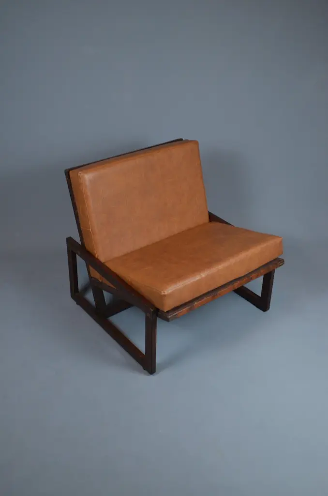 Armchair, likely designed in the late 1960s or early 1970s, is inspired by the famous Carlottamodel by Afra and Tobia Scarpa for Cassina. With its bold geometric lines and comfortable seating, it is a unique piece, perfect for 20th-century furniture enthusiasts.The frame is made of wood, and showcases beautiful exposed joinery, highlighting high-quality craftsmanship. The seat is supported by a system of straps, ensuring excellent support and optimal flexibility. The backrest, also fitted with straps, is subtly covered with brown fabric for a refined finish. The cushions, upholstered in brown skai, have developed a lovely patina over time, adding extra comfort to the piece.With its minimalist design and well-balanced lines, this armchair fits seamlessly into both vintage and contemporary interiors. Its authenticity and character make it a standout addition to any design furniture collection.