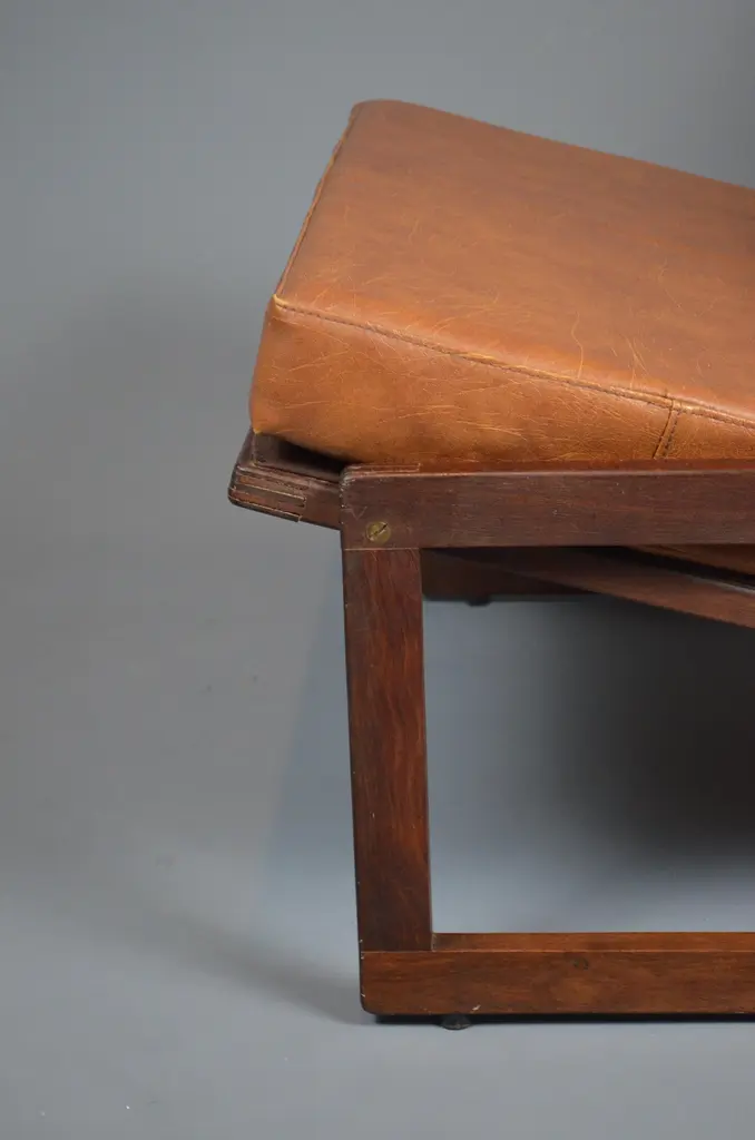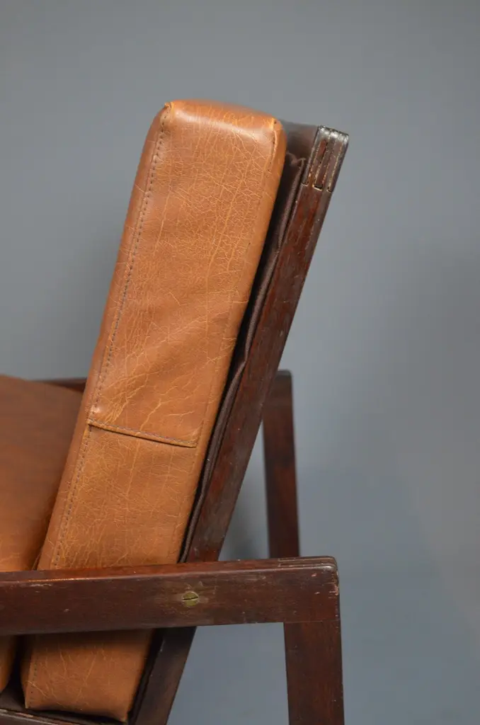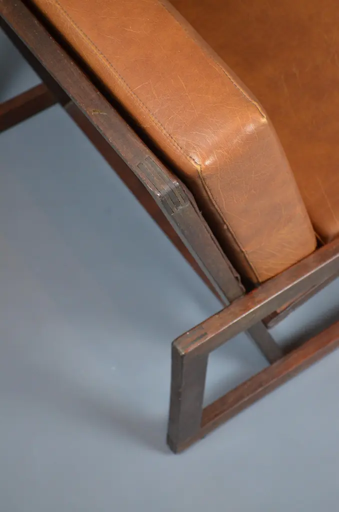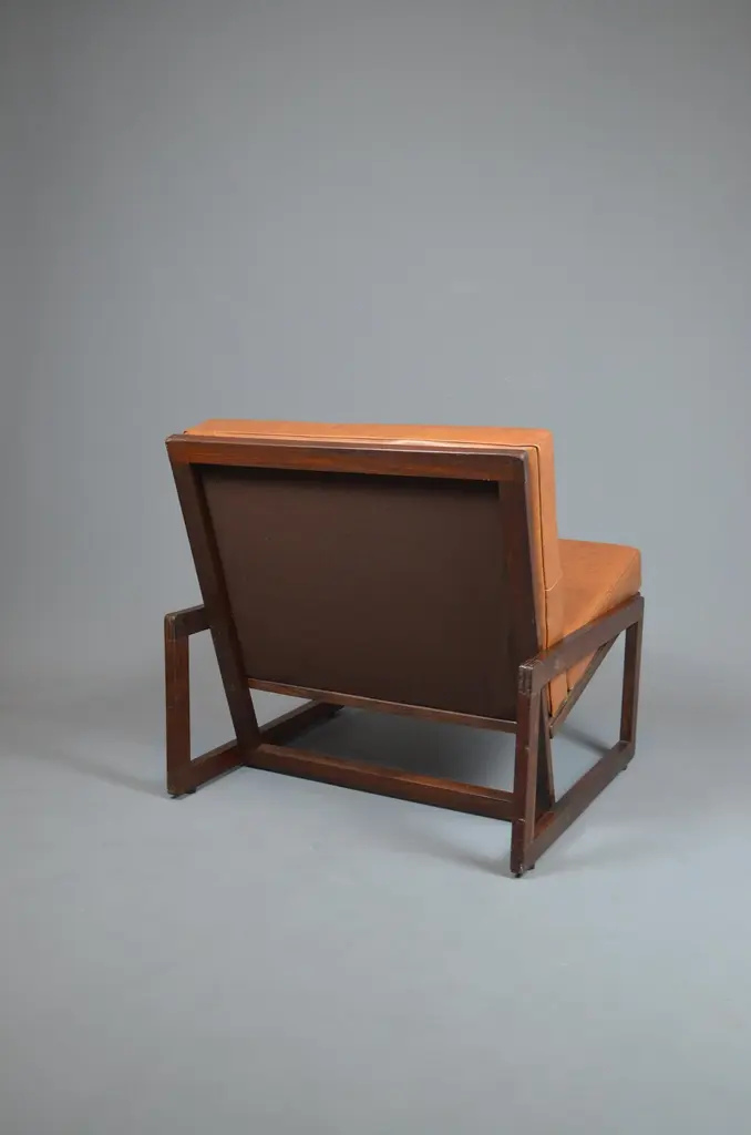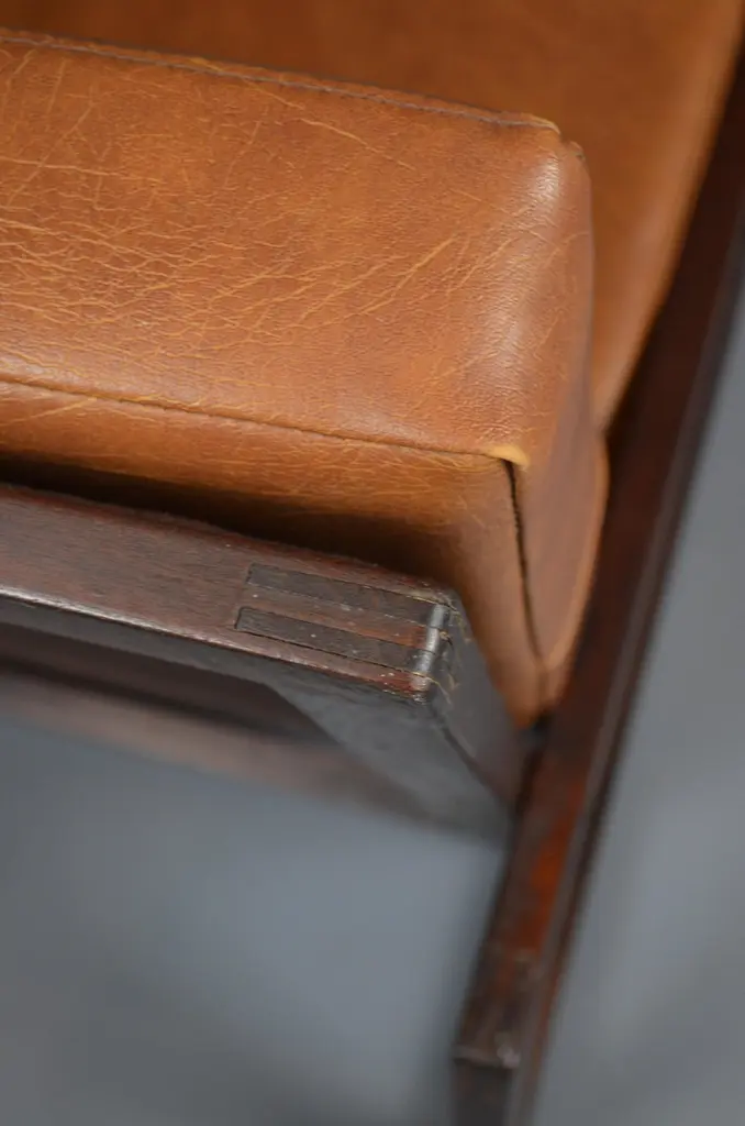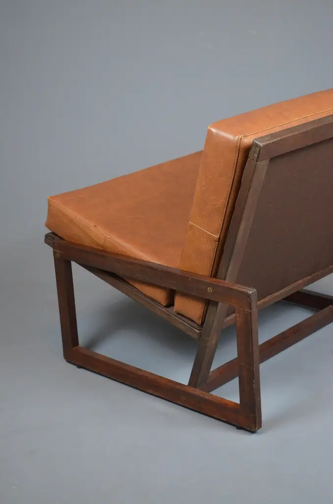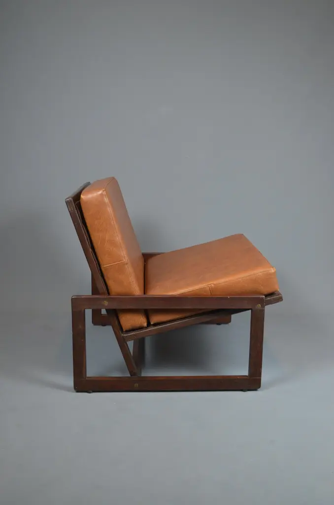 Armchair, likely designed in the late 1960s or early 1970s, is inspired by the famous Carlottamodel by Afra and Tobia Scarpa for Cassina. With its bold geometric lines and comfortable seating, it is a unique piece, perfect for 20th-century furniture enthusiasts.The frame is made of wood, and showcases beautiful exposed joinery, highlighting high-quality craftsmanship. The seat is supported by a system of straps, ensuring excellent support and optimal flexibility. The backrest, also fitted with straps, is subtly covered with brown fabric for a refined finish. The cushions, upholstered in brown skai, have developed a lovely patina over time, adding extra comfort to the piece.With its minimalist design and well-balanced lines, this armchair fits seamlessly into both vintage and contemporary interiors. Its authenticity and character make it a standout addition to any design furniture collection.