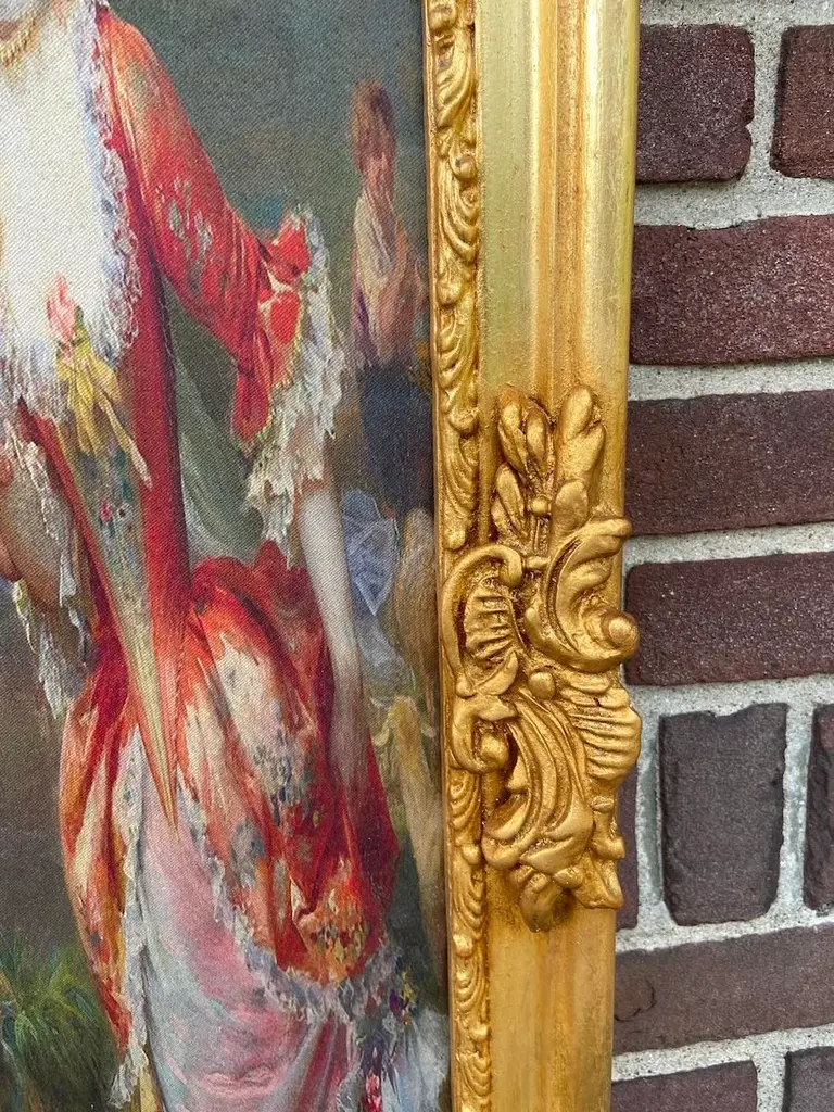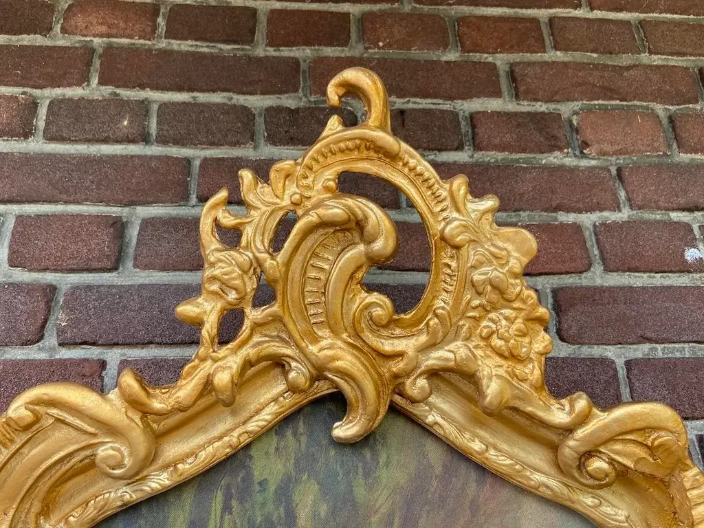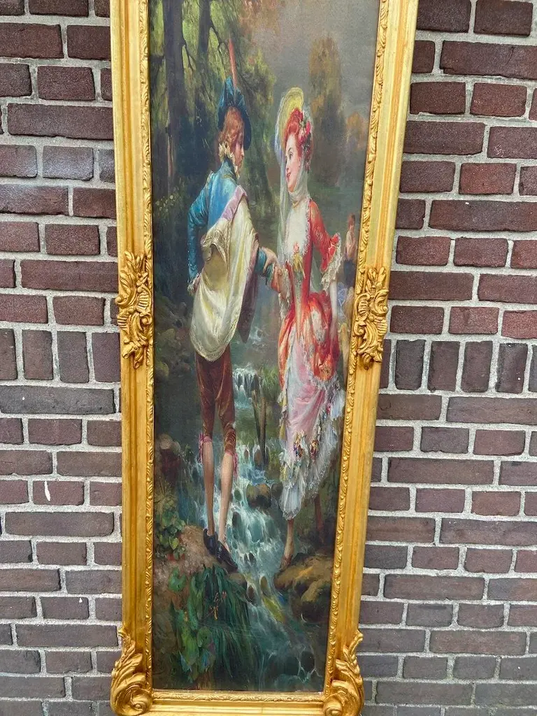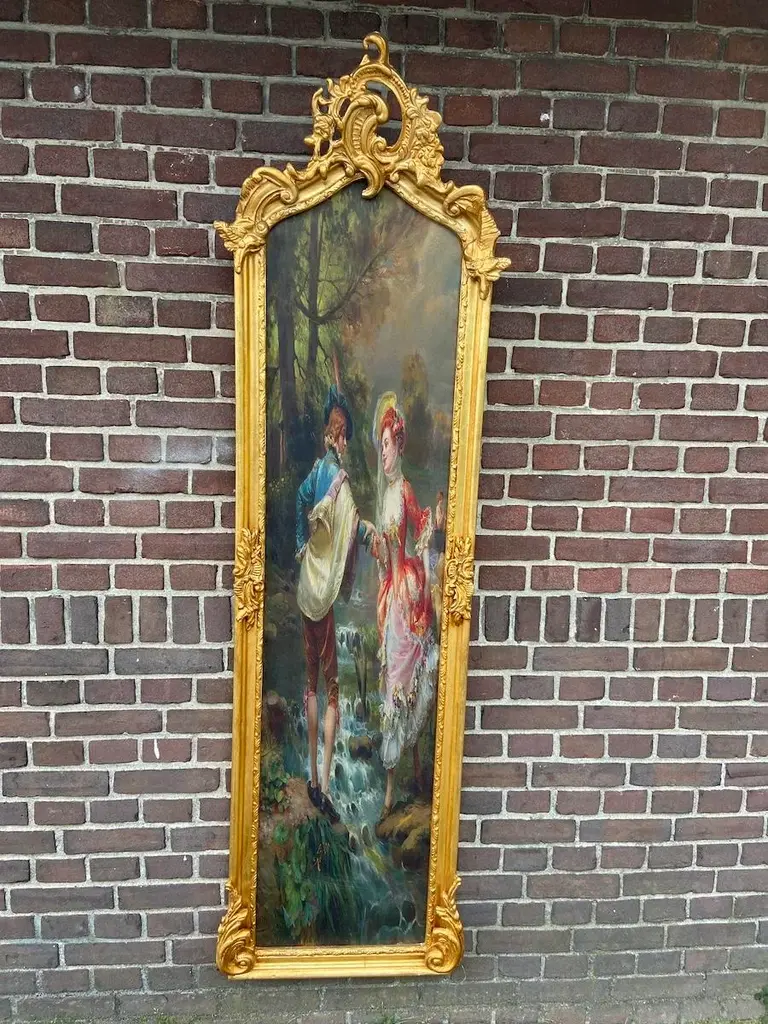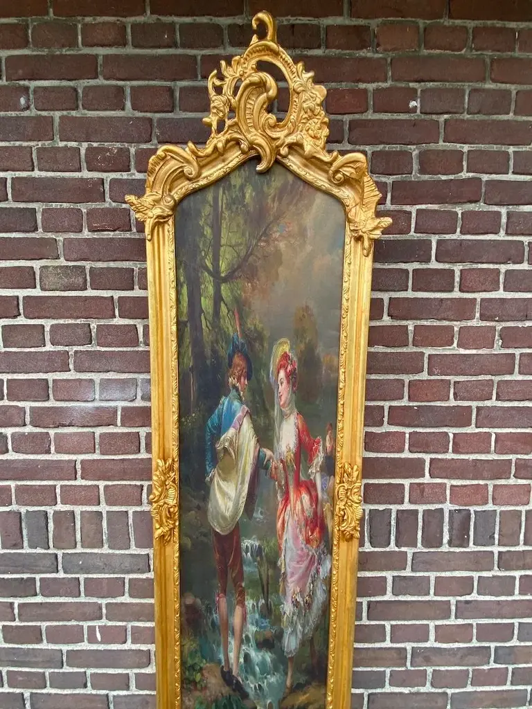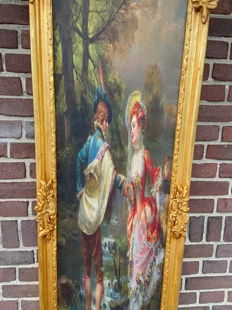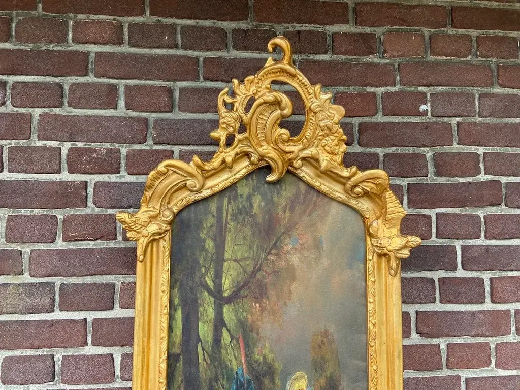 Bring French elegance and timeless romance into your home with this exquisite vintage French Louis XVI-style frame, featuring ornate gilded detailing and romantic fabric upholstery. This stunning decorative piece captures the grace and refinement of 18th-century French design, making it an extraordinary addition to any sophisticated interior. Exceptional Craftsmanship & Design: Authentic French Louis XVI-style frame, handcrafted from solid beech wood for durability and classic appeal. Features intricate hand-carved detailing, accentuating the refined aesthetics of the Louis XVI era. The frame has been professionally refinished with hand-applied gold leaf, enhancing its luxurious opulence while preserving its vintage character. Romantic Upholstery with 19th-Century Scenery: Adorned with beautifully reupholstered fabric, showcasing a charming 19th-century romantic scene. Depicts a deeply enamored couple in elegant period clothing, set against a picturesque countryside backdrop. The soft, muted tones of the fabric complement the gilded frame, adding a touch of whimsy and historical charm. Versatile Decorative Accent: A tall, statement frame that adds instant sophistication and romance to any space. Ideal for placement in a bedroom, hallway, living room, or sitting area, creating a warm and elegant ambiance. Can be styled as standalone decorative art or paired with classic furnishings for a curated French-inspired aesthetic. Dimensions: Metric: 56 cm W × 10 cm D × 178 cm H Imperial: 22 in W × 4 in D × 70 in H Secure Packaging & Shipping: Carefully packed with professional materials to ensure safe transit. Fully insured and includes tracking, giving you peace of mind from dispatch to delivery. ✨ Add a Touch of French Romance to Your Home! This gorgeous Louis XVI-style frame is perfect for those who appreciate history, art, and timeless elegance. Whether as a focal point in your home or a unique gift, this luxurious and enchanting piece will make a lasting impression.