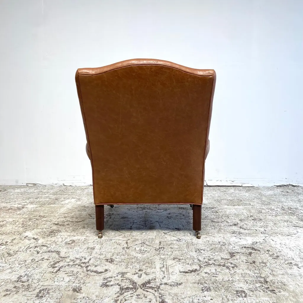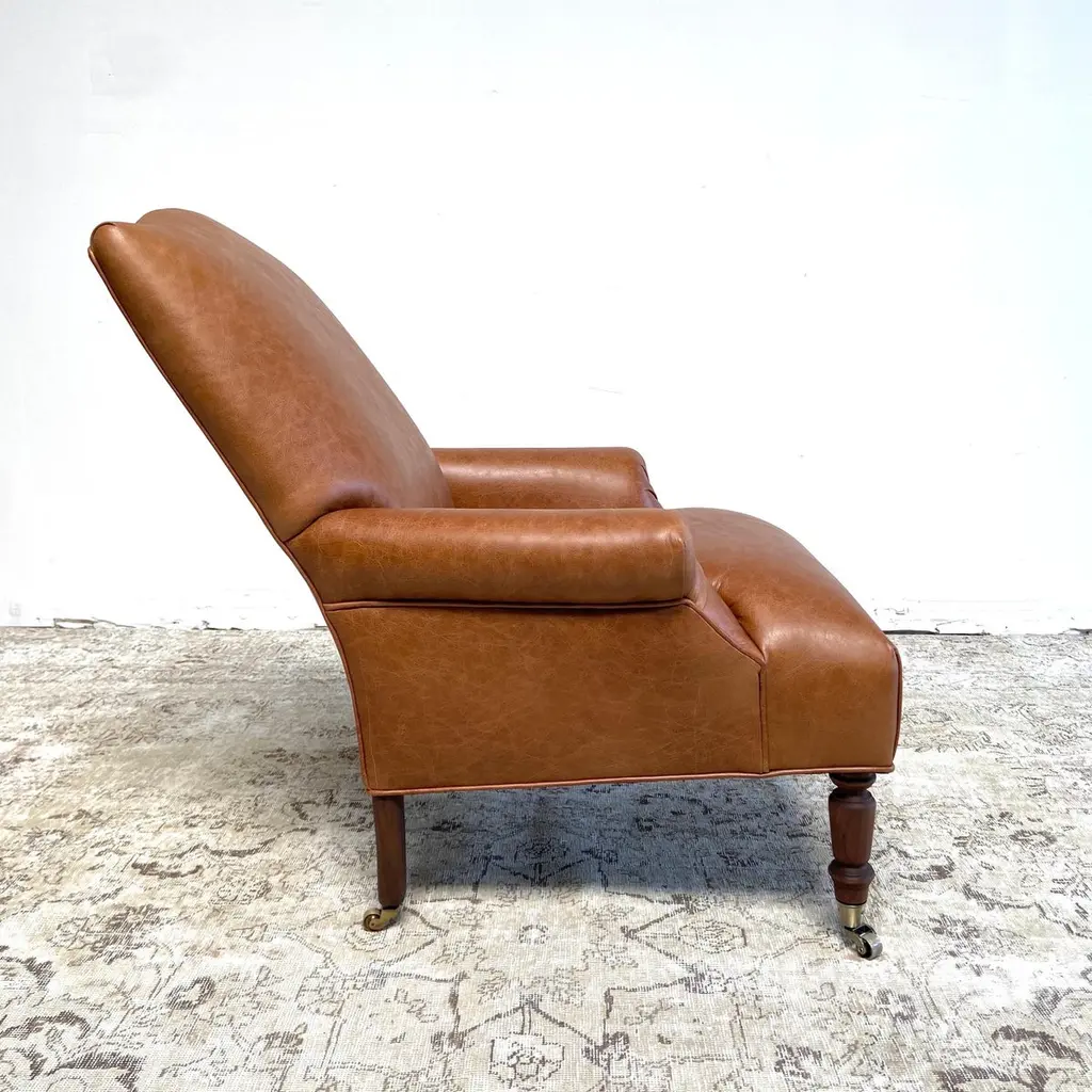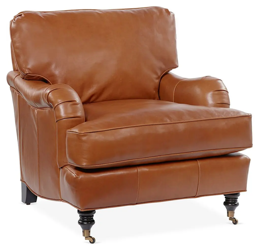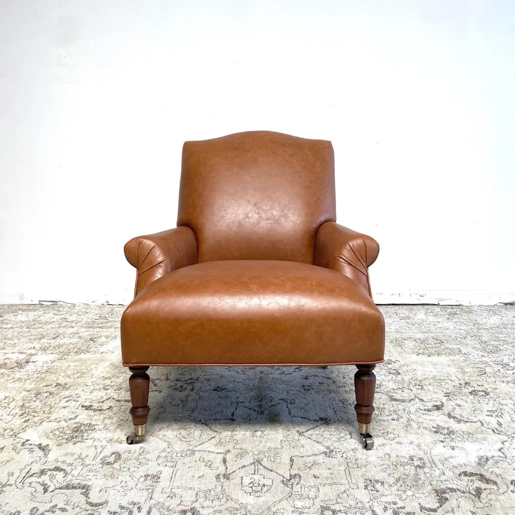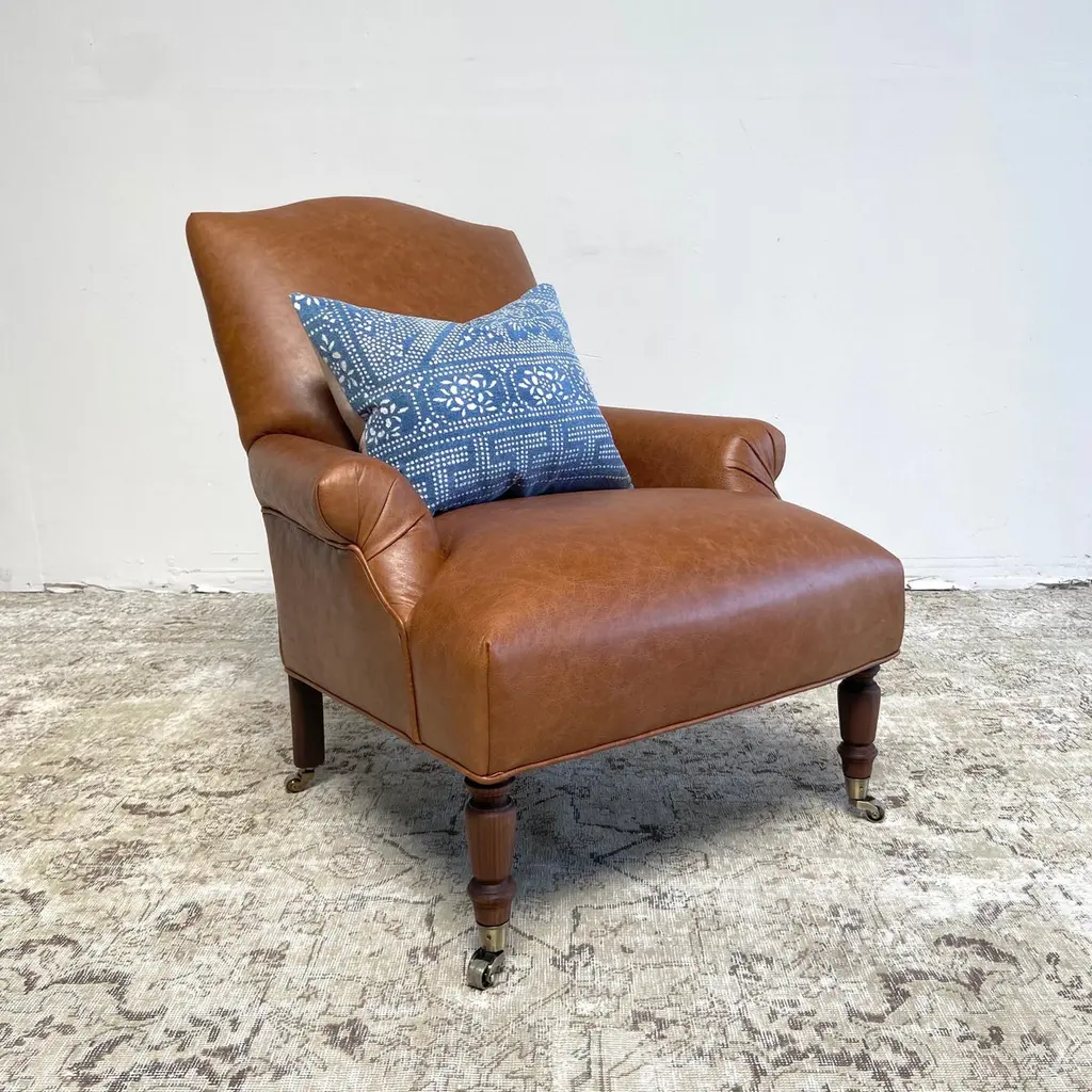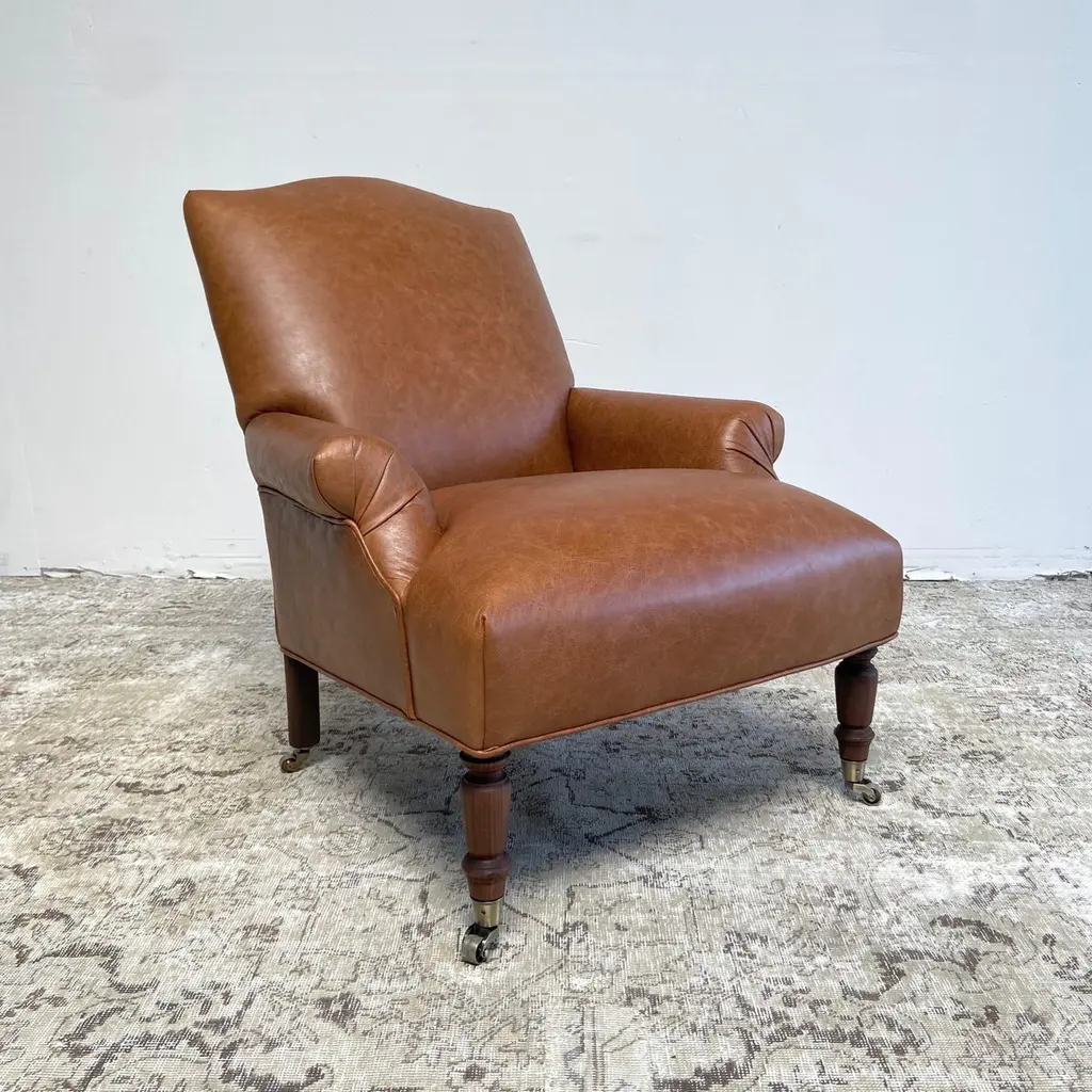 French inspired upholstered linen bergère chairs These French inspired chair are based on an original Napoleon III style pair of chairs. Napoleon III was the nephew of the Napoleon that we are all familiar with. This style dates from the mid- to late 19th century, France. This chair has antique brass casters on all legs and is low and deep with Classic lines and proportions. Leather upholstery in crystal mustard. Size: 32? wide x 34? deep x 37? tall Seat height 17? Stain: Fruitwood Priced with Leather upholstery.Linen upholstery also availalble.