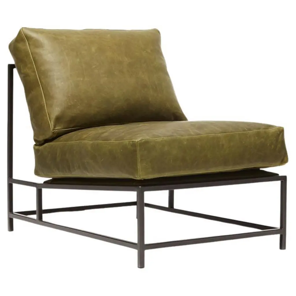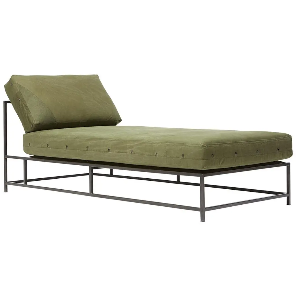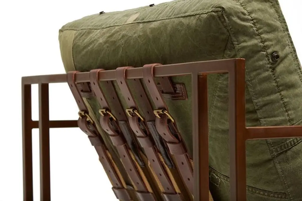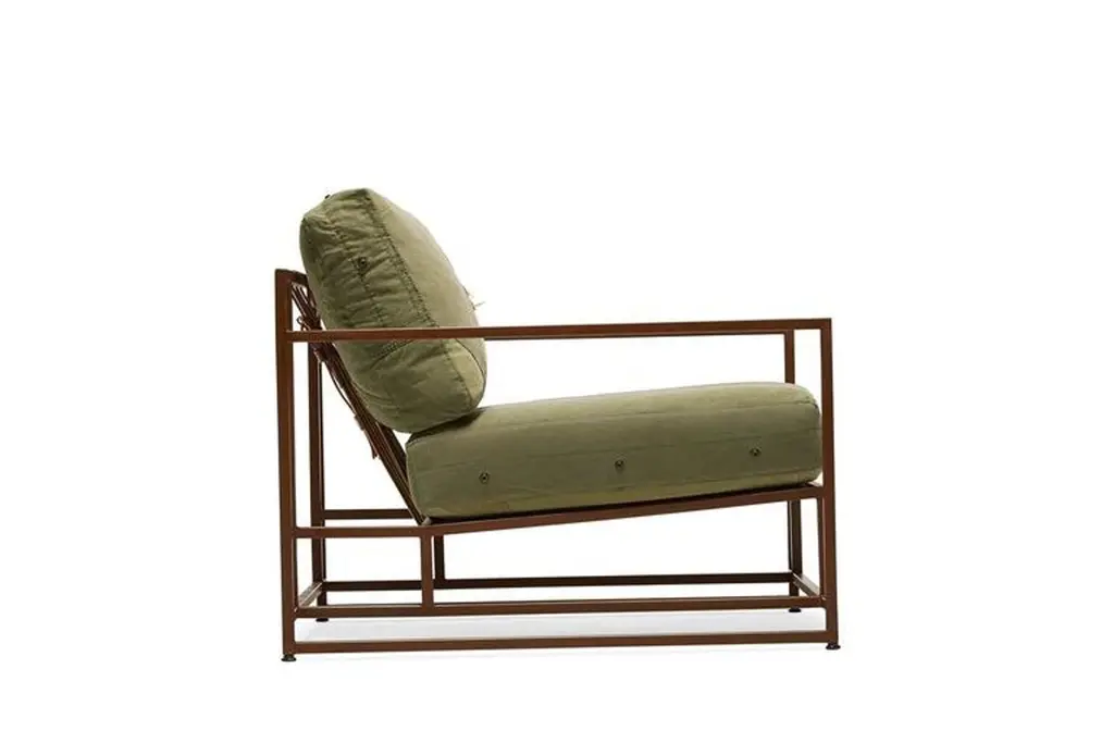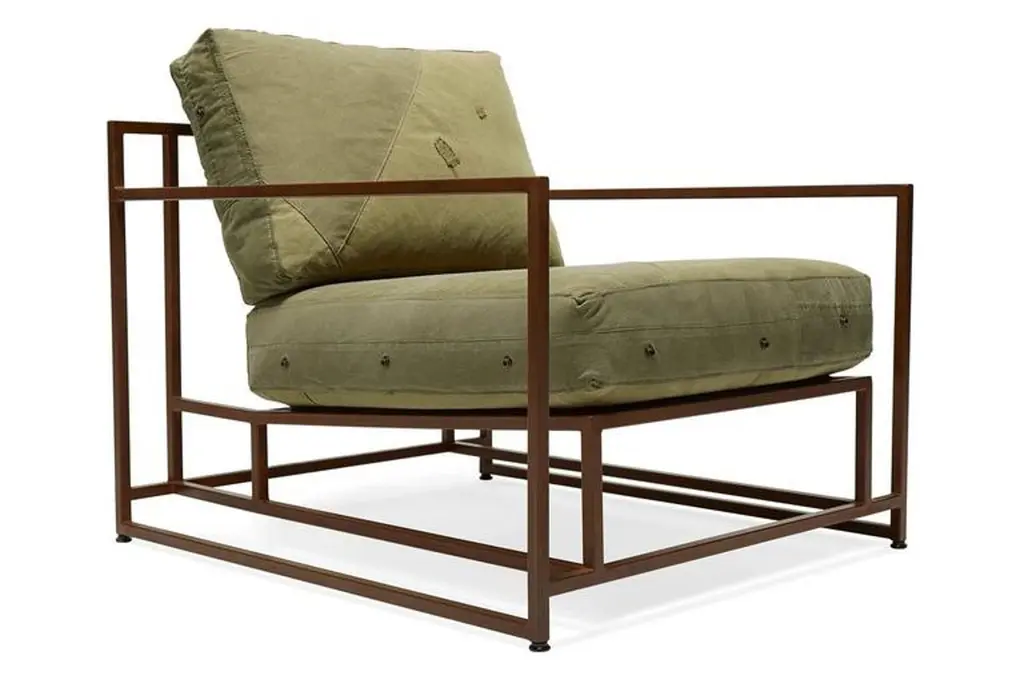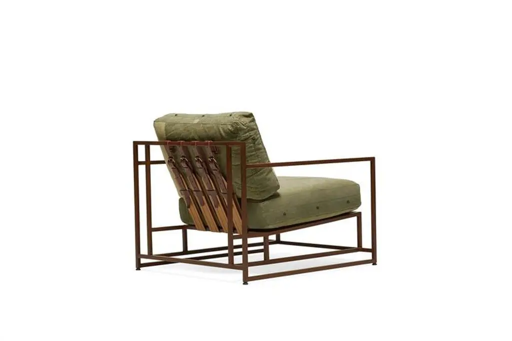 The Inheritance Armchair by Stephen Kenn is as comfortable as it is unique. The design features an exposed construction composed of three elements - a steel frame, plush upholstery, and supportive belts. The deep seating area is perfect for a relaxing lounge experience. This armchair comes with removable cushion covers to allow for easy cleaning should the need arise. Every Stephen Kenn piece is made to order through our Los Angeles studio in partnership with a number of small businesses and fabricators in the LA area. With this highly customizable armchair you can select from a wide range of finishes and materials to complement your home and lifestyle - please message us to see our Customization Guide with all available options.Since the development of the Inheritance Collection, Stephen Kenn has been inspired by the history inherent in vintage military-issue materials. This version of our Inheritance Armchair is upholstered with salvaged vintage military canvas material. Each piece of canvas is distinctive and will have unique attributes from its long history of use, including small imperfections, stamps, lettering, patches, or markings from the soldiers who used them, as well as shade variations in olives and greens.The foam seat cushions have been wrapped in polyfiber for added softness and comfort. Sitting atop a marble rust steel plated frame, the armchair is strapped with support belts featuring a replica of a WWII Swiss army "mule belt” with oxblood leather and antique brass buckles.