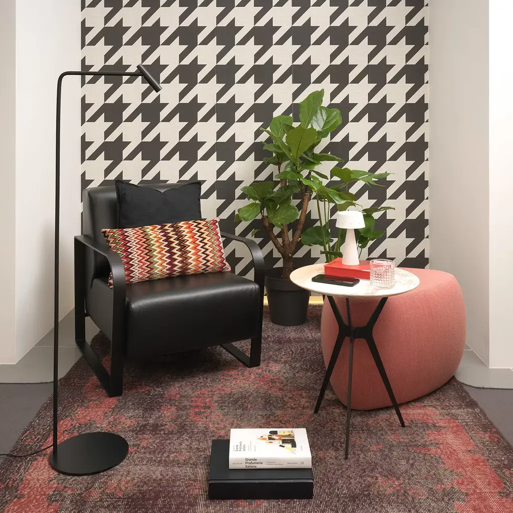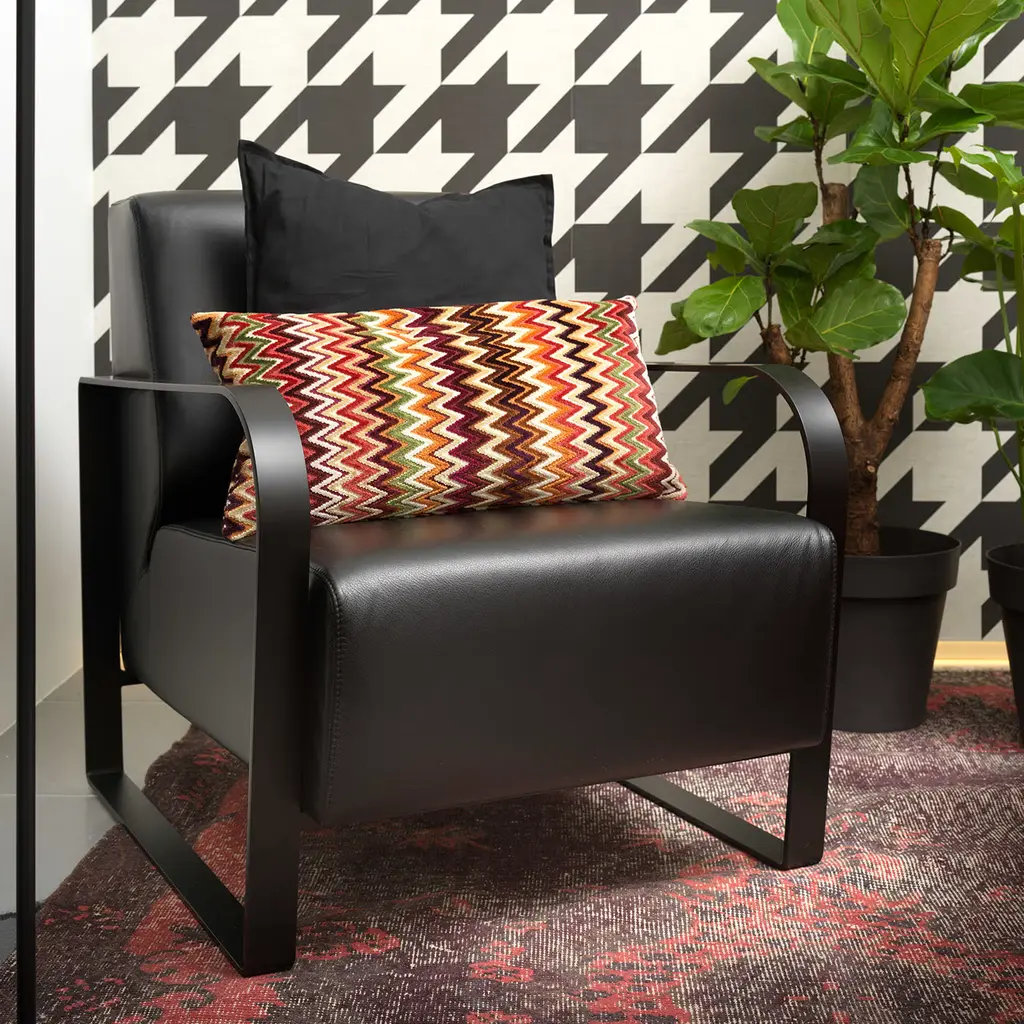 This upholstered armchair is characterized by a painted steel sled base in matte black. Elegance and simplicity for every living room.