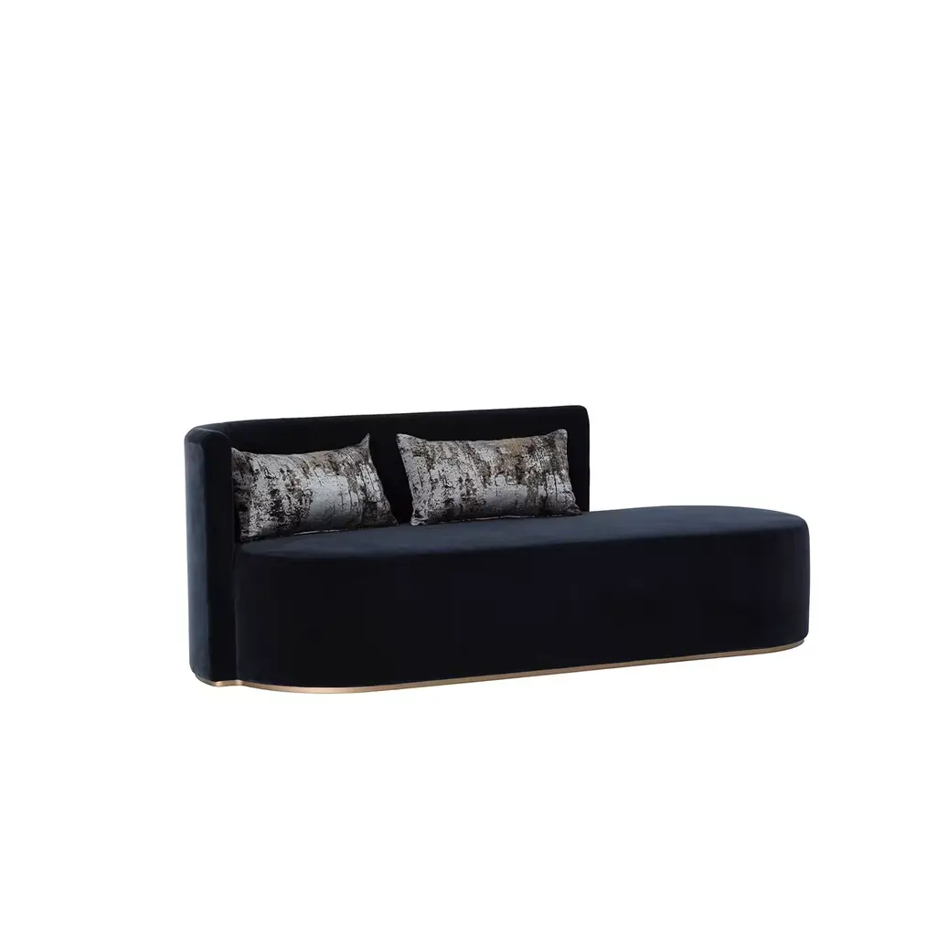 Whether for a special corner in the living room, lounge, or bedroom, this superb chaise longue provides an oasis for relaxing in a showstopping design that merges functionality, comfort, and elegance. Shown with right-arm facing style, the dormeuse-style silhouette features a polyurethane and Dacron-padded wood frame raised on a platform base enriched with a brushed brass finish and a luxurious deep blue velvet upholstery (other colors available upon request). Throw cushions are not included but available separately, please ask the Concierge for information. Contract and commercial certifications available upon request.
