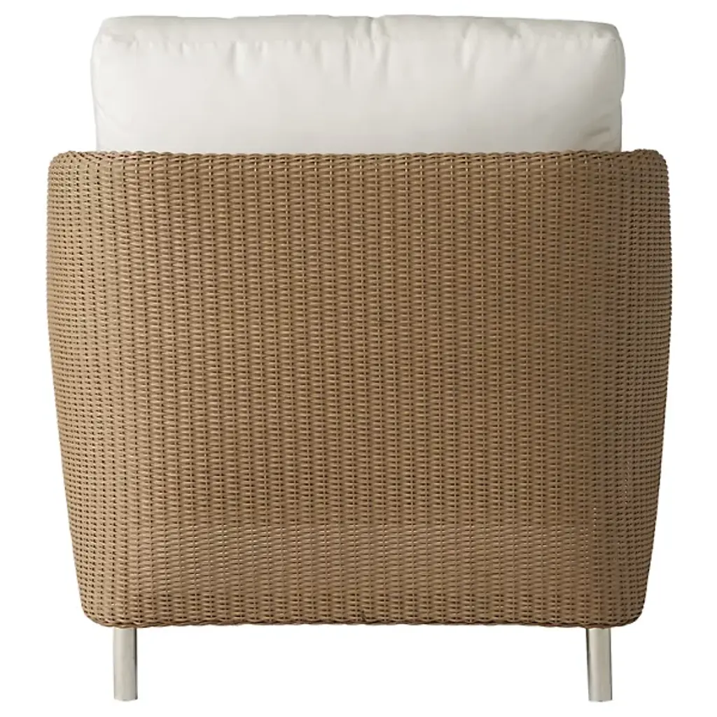 The Visions Lounge Chair from Lloyd Flanders pairs contemporary simplicity and vibrant vintage detail by surrounding an aluminum frame with a rustic wicker weave and wraparound back. Each seat is strong and stylish, made in the USA using welded aluminum with an enamel finish. A patterned set of slender Lloyd Loom Wicker made from aluminum wire with cellulose fibers sheathes the metal structure, creating something resilient and rustic that secures soft, cushioned padding for its seat, back, and sides. Every element, whether soft or structural, can withstand the sun, wind, and rain while adding casual, enveloping comfort to its surroundings.