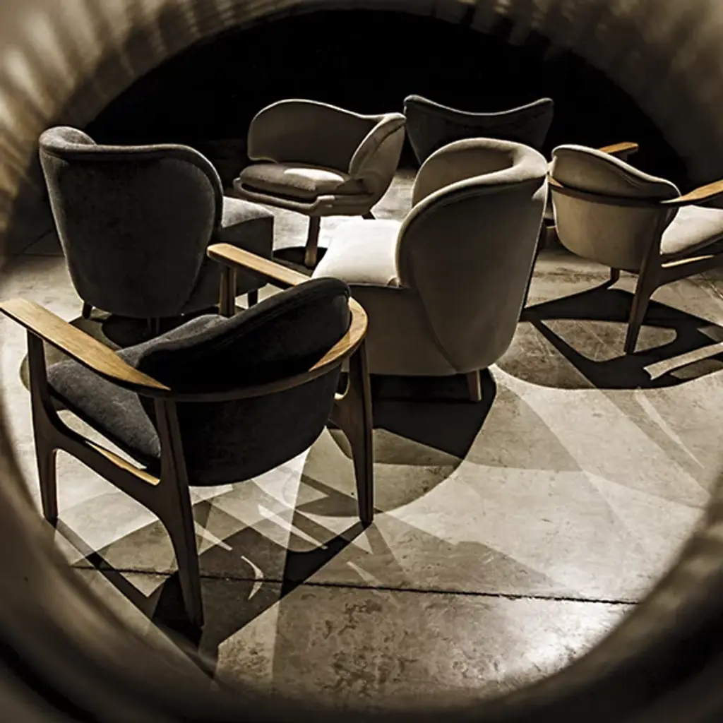 The Vittorio Lounge Chair from Noir employs asymmetrical curves that respond intuitively to the human form. Its fabric follows the gentle wave of the backrest, creating a natural rhythm that invites relaxation. Teak arms extend at precisely the right height to support elbows while maintaining a sense of lightness. The legs angle outward slightly, ensuring stability while remaining slender and refined. This chair excels in conversation groupings where its organic shape encourages natural interaction between sitters.