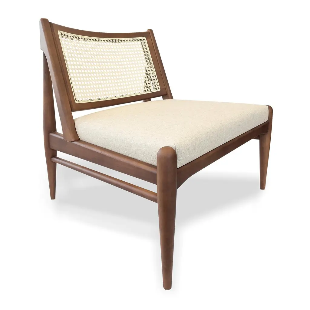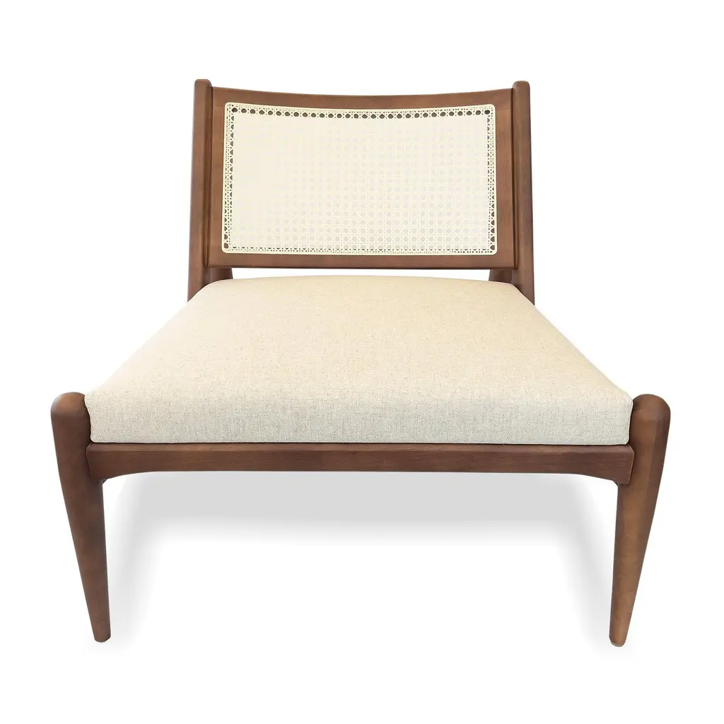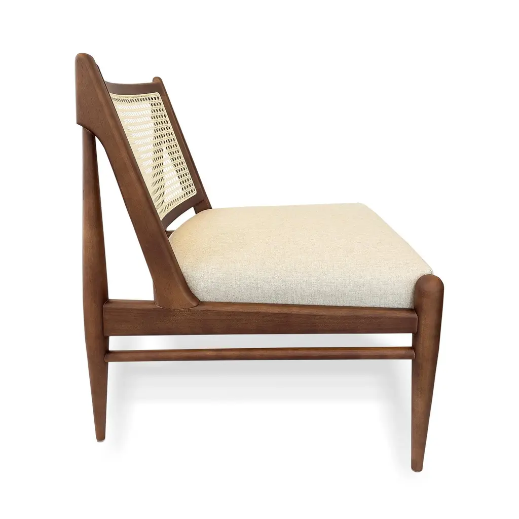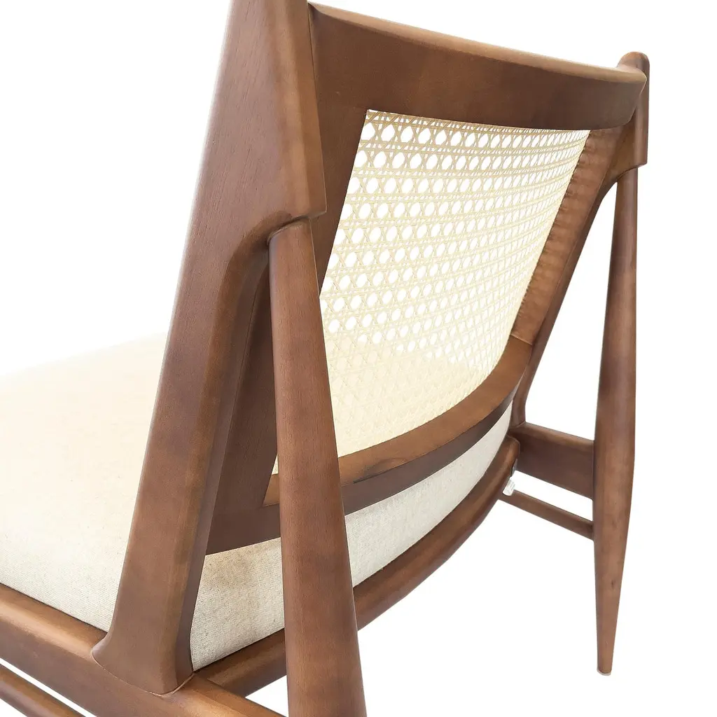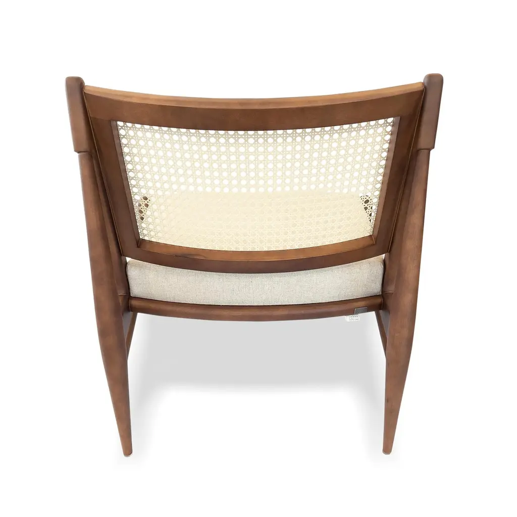 A Donna cane-back chair by Uultis with walnut finish and Oatmeal fabric. Please check availability prior to purchase.Introducing the Donna cane-back chair, beautifully designed with a walnut wood finish, an oatmeal fabric seat, and a natural hand-woven cane backrest crafted from 100% natural cotton straw. The Wheat Thin Plain Weave fabric adds a soft and inviting texture to the seat, supported by medium-density foam for optimal comfort. Its solid wood structure ensures durability and a timeless aesthetic, seamlessly integrating into modern, contemporary, or traditional settings.The natural cane backrest creates an airy and elegant visual contrast with the walnut finish, offering both a striking design element and comfort. Ideal for lounging in the living room, reading in a cozy corner, or as an accent chair in a bedroom or office, the Donna chair brings a sense of warmth and relaxation into any space. Designed with eco-conscious materials, the chair reflects Uultis' commitment to sustainability while delivering sophisticated style.Arriving fully assembled, this chair offers practicality, beauty, and versatility. Its refined lines and natural elements make it a perfect fit for those who appreciate high-quality craftsmanship, making the Donna cane-back chair not only a functional piece but also an artistic addition to your home décor.