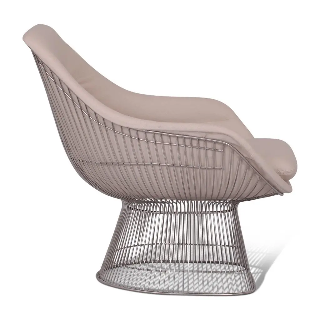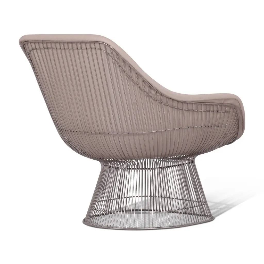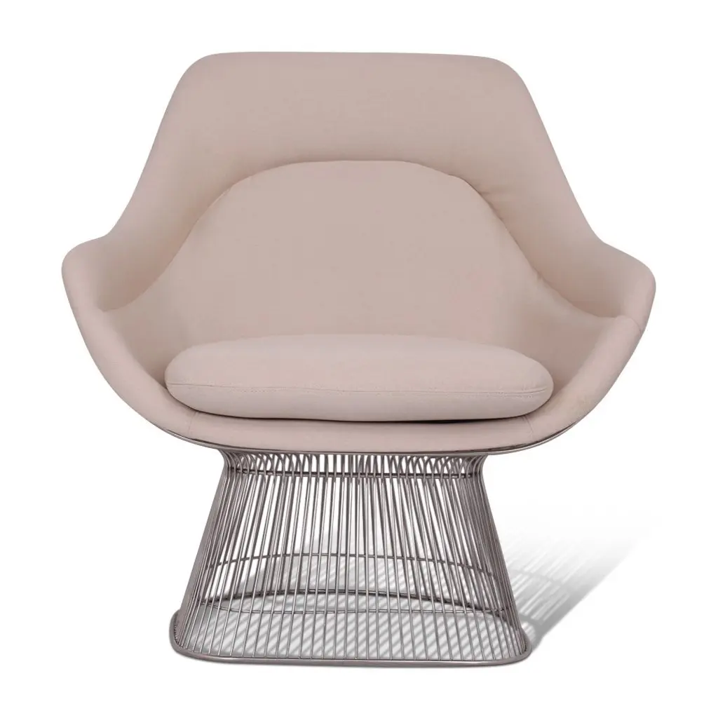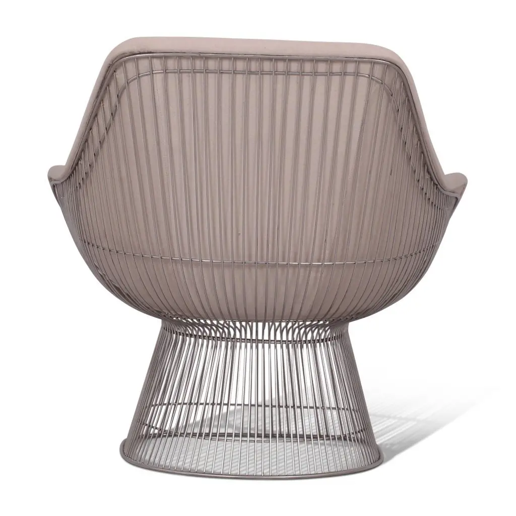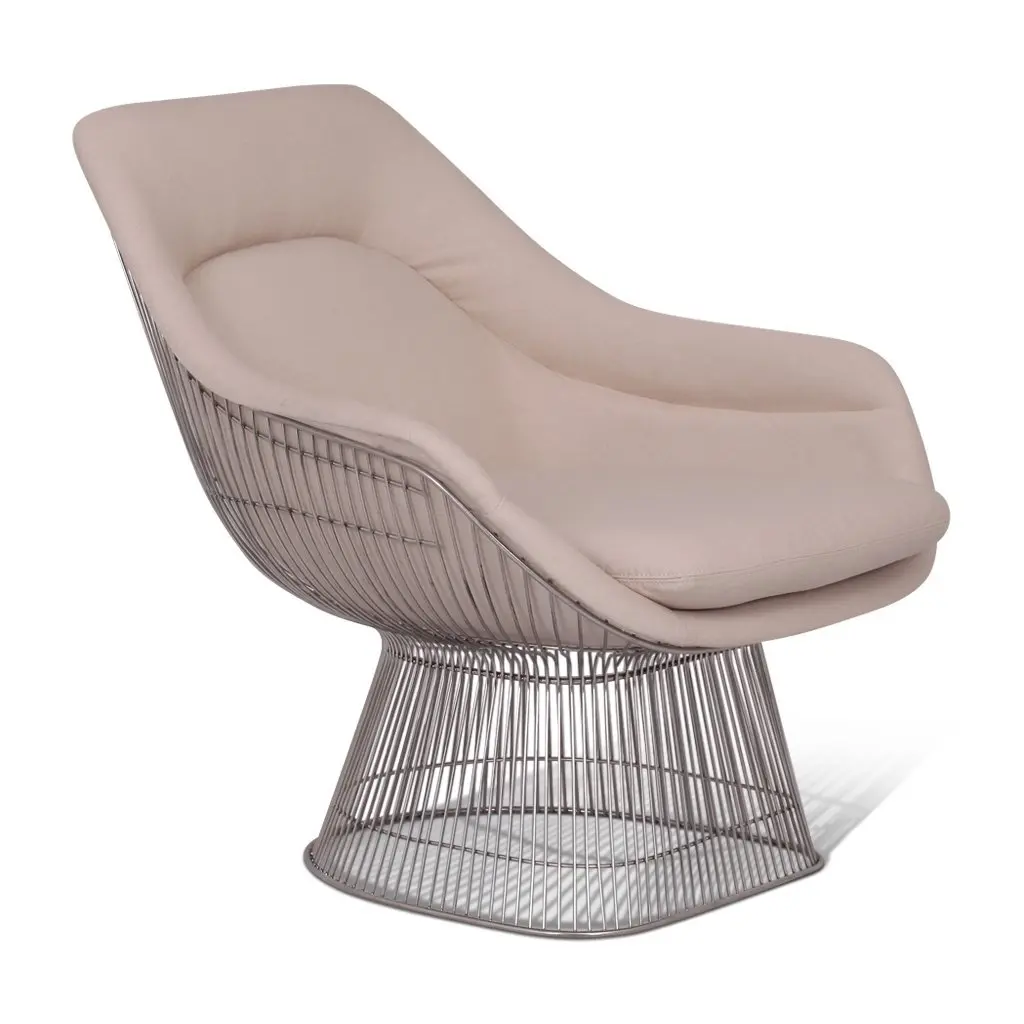 Inspired by the original 1966 Platner Collection designed by Warren Platner, this lounge chair captures the iconic Modernist era style. Both elegant and whimsical, the stainless steel wire base was designed to resemble a shiny sheaf of wheat. The design provides not just a unique look, but also full support and stability for the seating shell. In a displayed chair, high-density foam cushioning has been upholstered in a soft cashmere blend upholstery for luxurious comfort. Both a joy to look at and sit in, this piece of mid-century furniture truly reflects Platner's definition of a classic!
