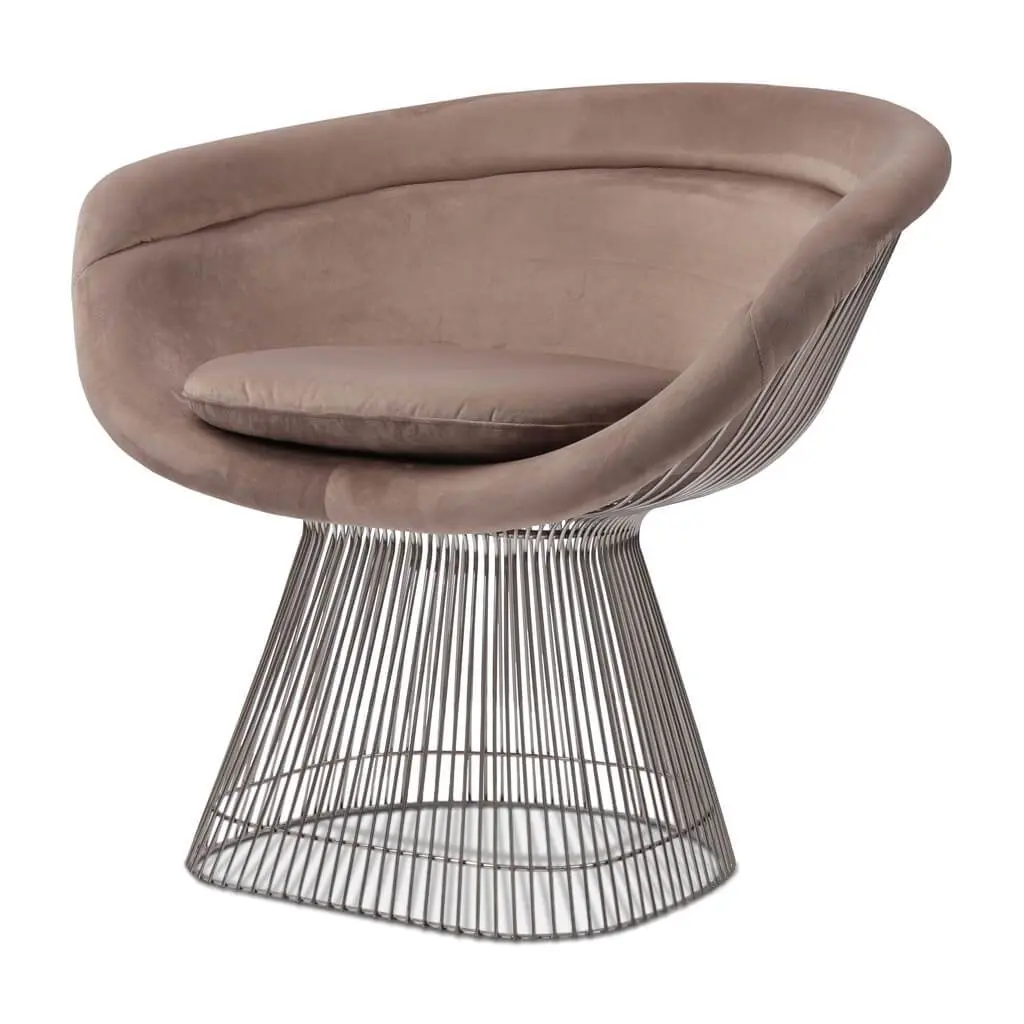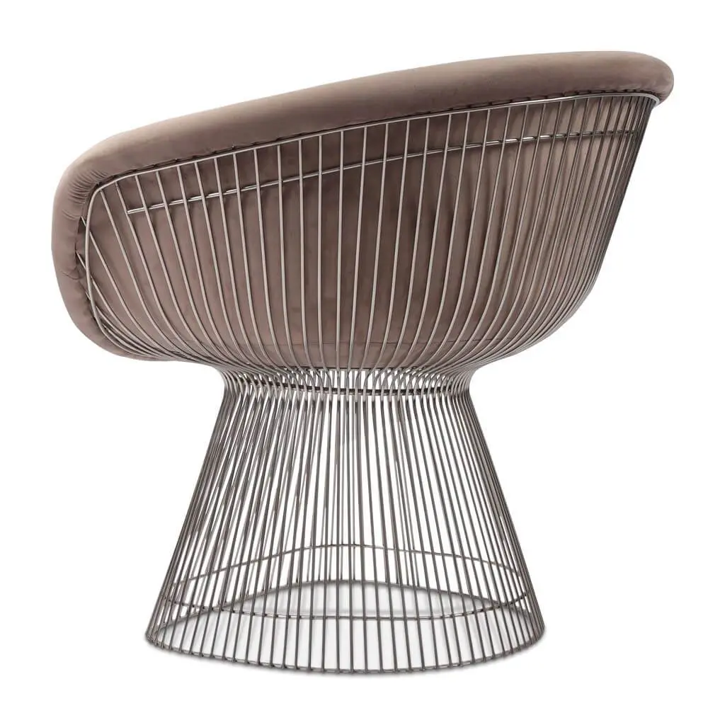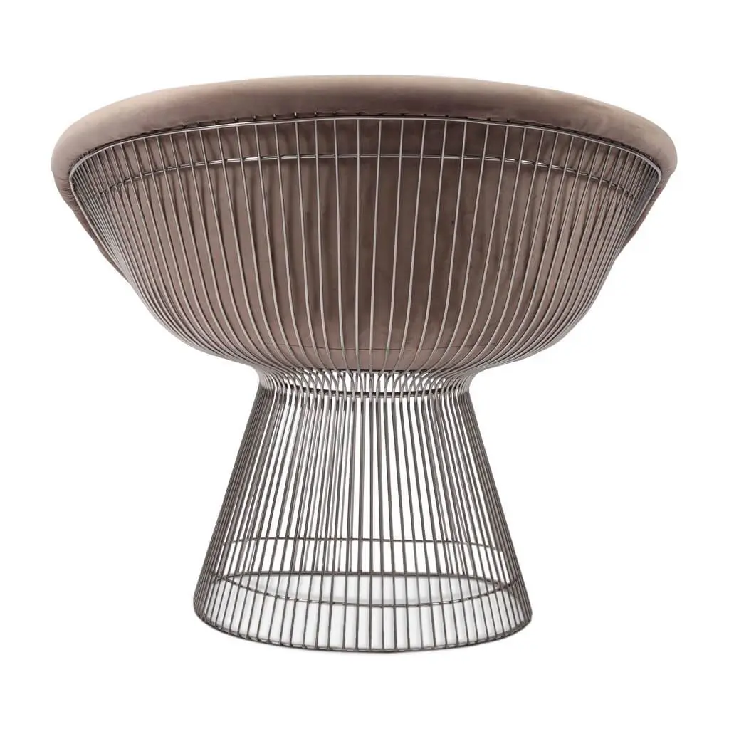 Inspired by the original 1966 Platner Collection designed by Warren Platner, this lounge chair captures the iconic Modernist era style. Both elegant and whimsical, the stainless steel wire base was designed to resemble a shiny sheaf of wheat. The design provides not just a unique look, but also full support and stability for the seating shell. In displayed chairs, high-density foam cushioning has been upholstered in a soft cashmere blend upholstery for luxurious comfort. Both a joy to look at and sit in, this piece of mid-century furniture truly reflects Platner's definition of a classic!