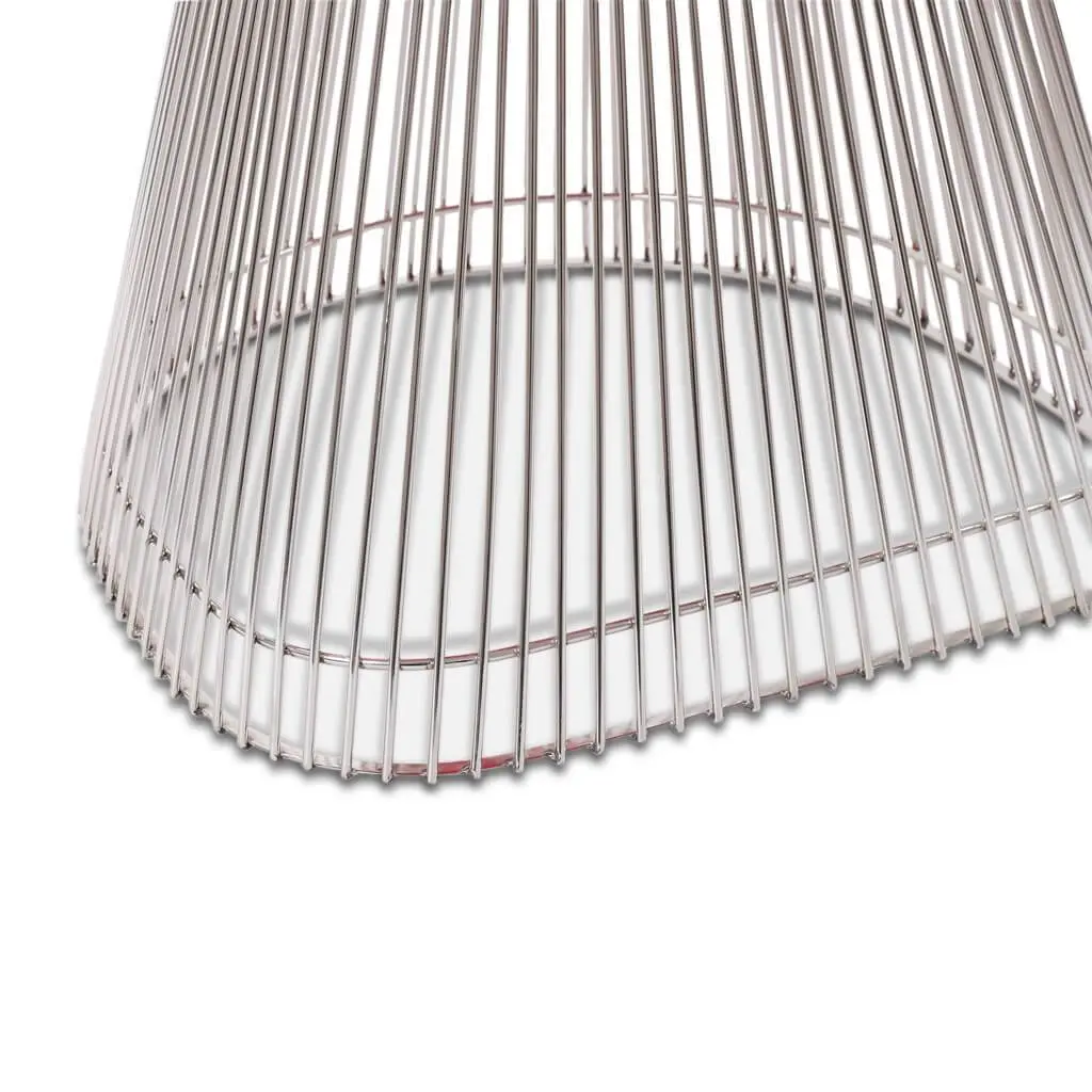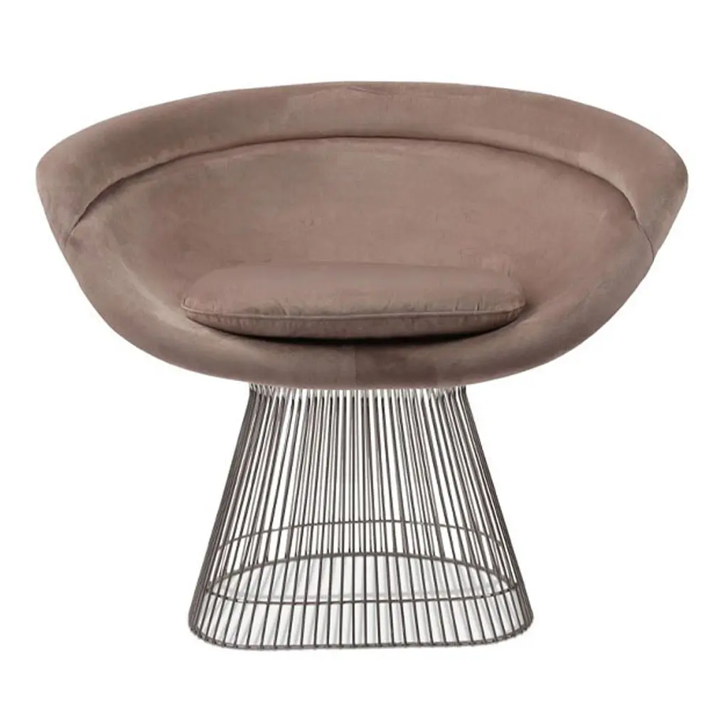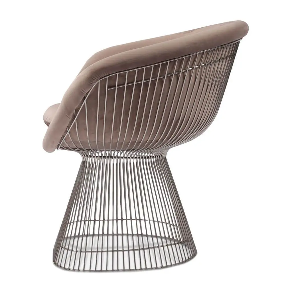 Inspired by the original 1966 Platner Collection designed by Warren Platner, this lounge chair captures the iconic Modernist era style. Both elegant and whimsical, the stainless steel wire base was designed to resemble a shiny sheaf of wheat. The design provides not just a unique look, but also full support and stability for the seating shell. In displayed chairs, high-density foam cushioning has been upholstered in a soft cashmere blend upholstery for luxurious comfort. Both a joy to look at and sit in, this piece of mid-century furniture truly reflects Platner's definition of a classic!