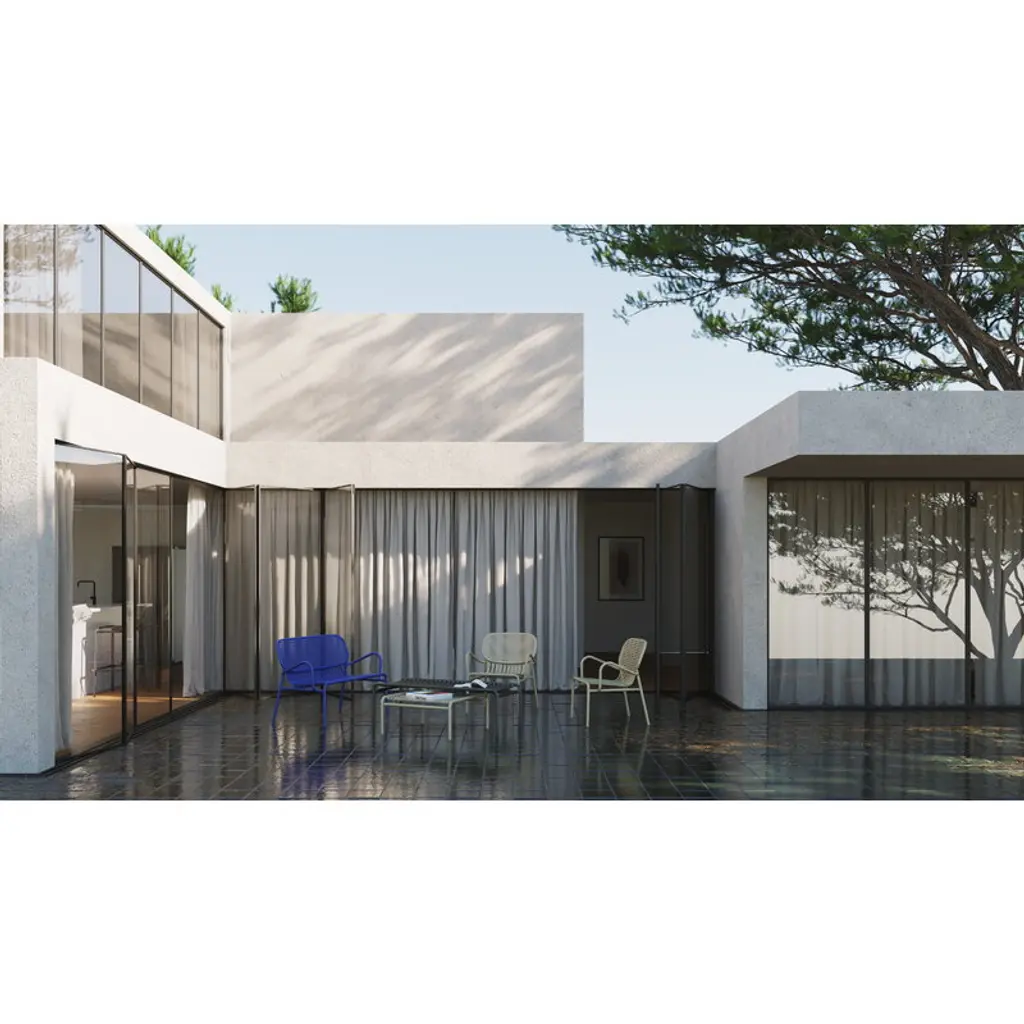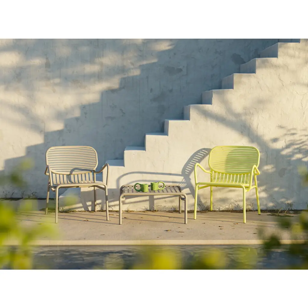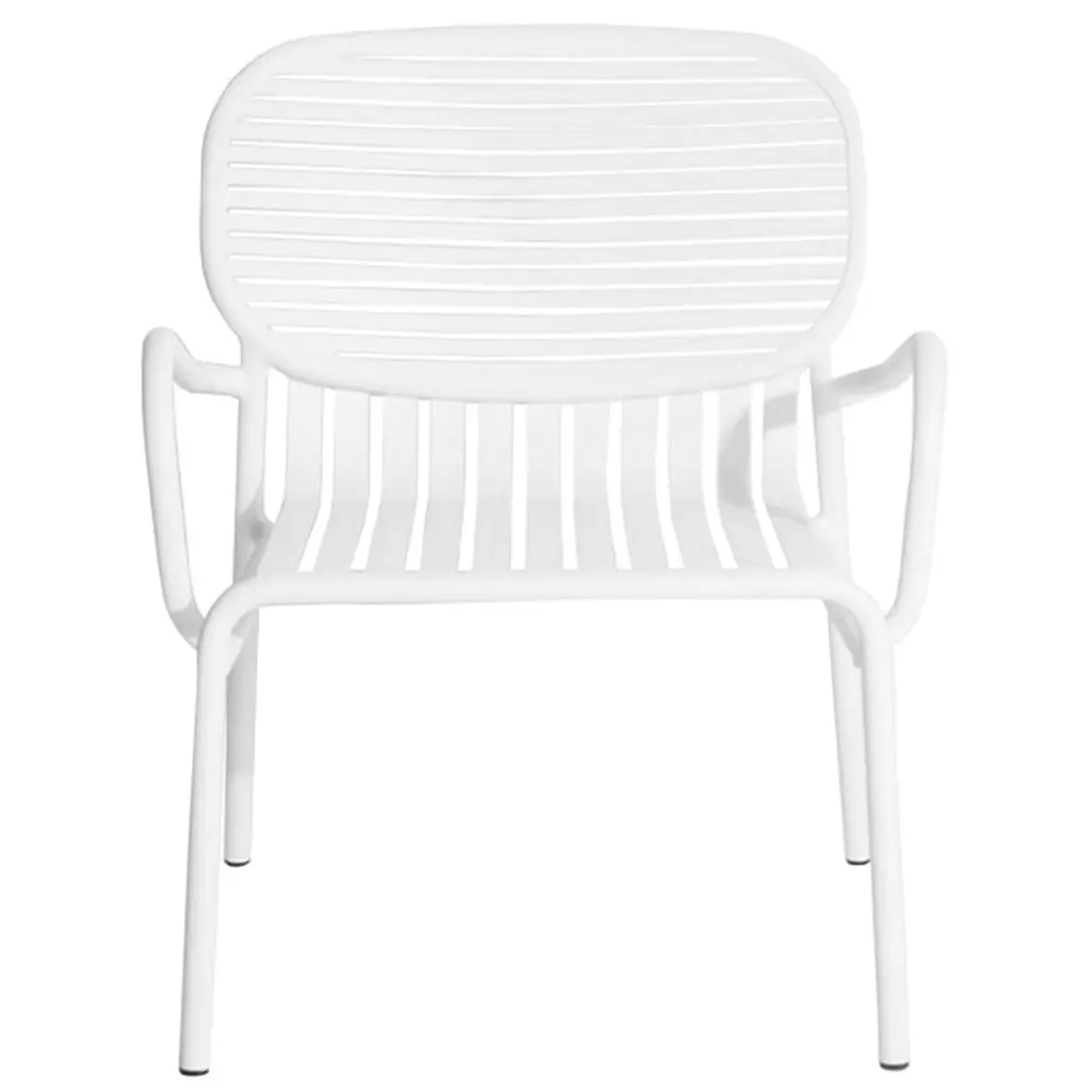 The Week-end lounge chair is part of Petite Friture’s collection of aluminum outdoor furniture. The Week-end armchair is characterized by oval shapes and both horizontal and vertical slats on the backrest. All the chairs of the Week-end range are stackable. Created by the design duo BrichetZiegler, Petite Friture’s Week-end outdoor furniture combines different geometrical shapes with functional, contemporary design. The aluminum structure makes the pieces lightweight and hardwearing at the same time, and the epoxy-coated matt surface can easily stand any weather. The Week-end range consists of chairs, benches and tables in many colors and sizes, and is thus suitable for large gardens and small balconies alike. Thanks to the sleek design, the pieces can also be used indoors.