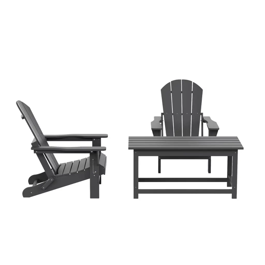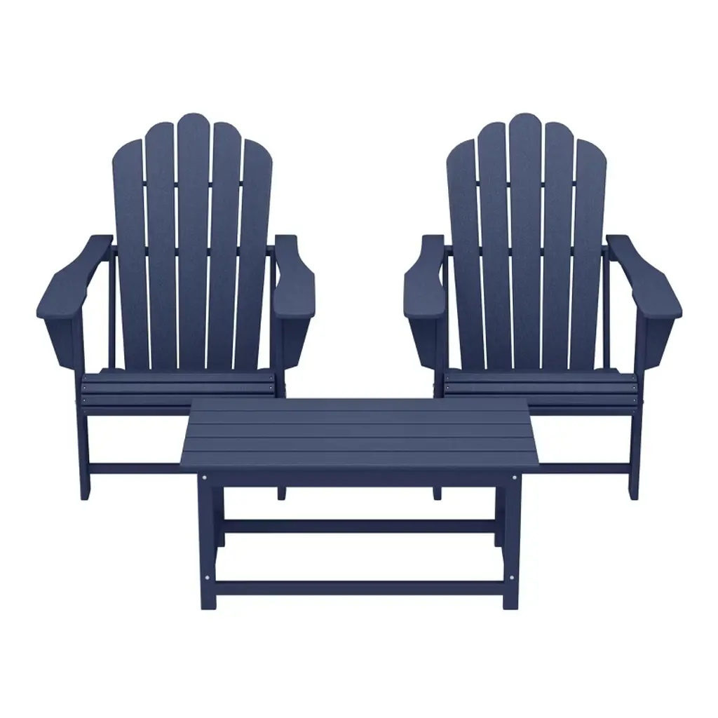 Relax in style with this comfortable and durable Adirondack conversation set. Each piece is constructed of a weather and UV resistant HDPE, which protects the set from the elements and keeps its beautiful color all year. Slip into comfort with the ergonomically designed chair, with the sloped and contoured seat with a waterfall rest that makes it more comfortable to sit. This set is perfect for your backyard and will make a perfect place to relax on a warm day with friends or family.While we strive to accurately represent product colors, please be aware that actual colors may vary slightly due to individual screen settings and lighting conditions. FeaturesSet includes: two (2) Adirondack chairs, one (1) coffee tableDurable HDPE constructionWeather and UV resistantContoured seat and waterfall restStainless steel hardwareSimple to assembleDetails:Product Type: Patio Conversation SetsWhat's Included: (2) Adirondack Chair; (1) Coffee TableAdirondack ChairDimensions: 29" W x 31.5" D x 34.5" HWeight: 32.75 lbs.Seat Width: 20.25"Seat Depth: 20"Seat Height: 14.5"Weight Capacity: 450 lbs.Coffee TableDimensions: 35.25" W x 17.5" D x 16" HWeight: 21 lbs.Weight Capacity: 220 lbs.