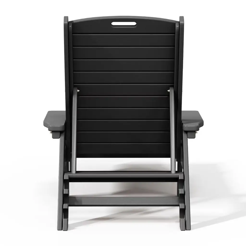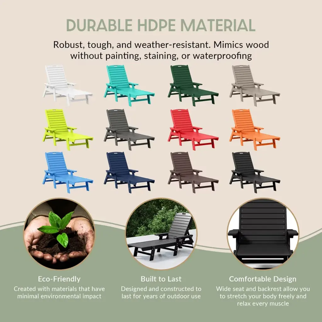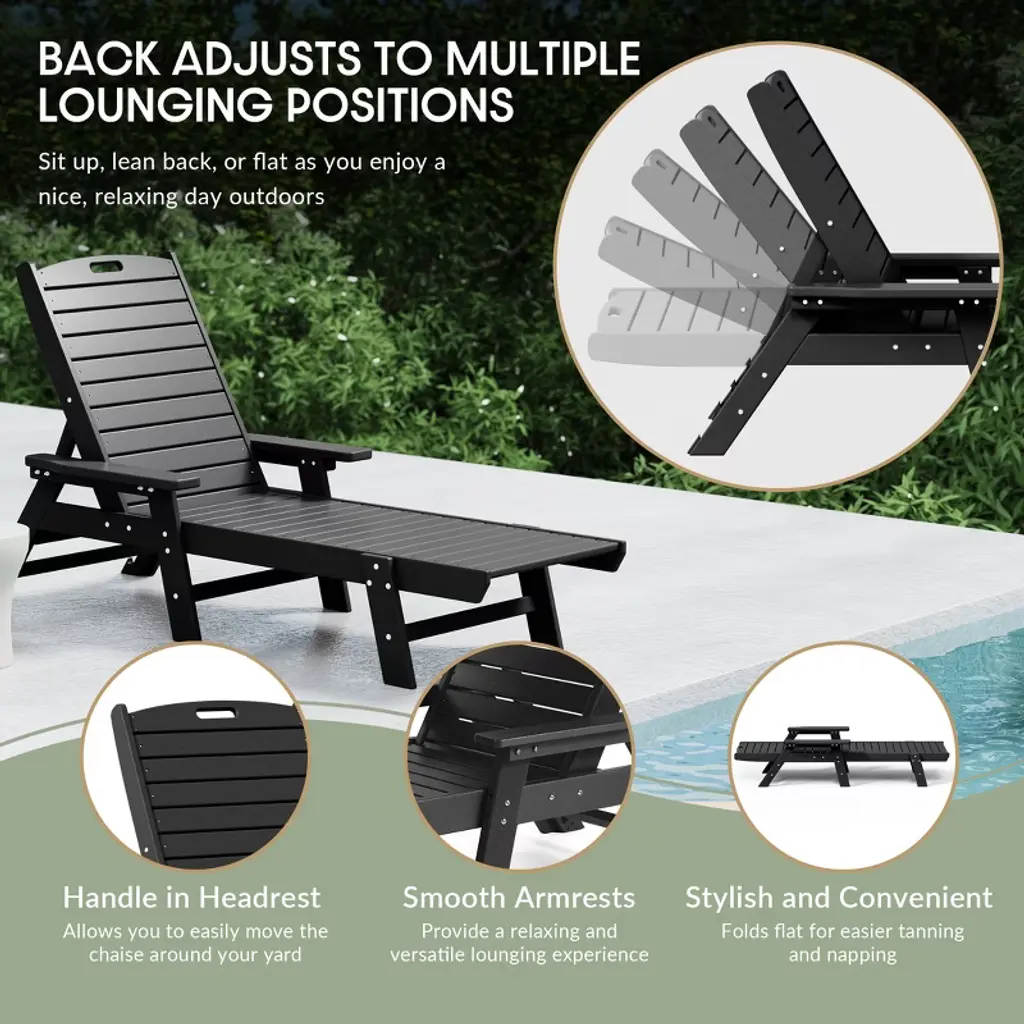 Lay back and soak up the sun near the pool with this beautiful and durable weather-resistant 2-piece reclining chaise lounge chair set. Made with high-quality [HDPE] material, which increases durability and is resistant to UV radiation, water, and the elements of the outdoors. Get the most out of your chaise lounge chairs when lounging in the sun thanks to the reclinable design, which lets you place the chair in any position. The chairs can be folded flat, and the handle in the headrest makes it simple to move the chairs and store them away.While we strive to accurately represent product colors, please be aware that actual colors may vary slightly due to individual screen settings and lighting conditions. FeaturesSet includes: two (2) reclining chaise lounge chairsBackrest can be adjusted in 5 different positions for the perfect seatDurable HDPE material ensures no peels, crack, chips, or rottingEasy to move thanks to the headrest's handleMade to withstand the harsh elements of the outdoors giving you the most out of the chairUV resistant protects from fading and weather resistant helps prevent mold or mildewQuality design ensures no need for painting, waterproofing, or stainingDetails:Product Type: Patio Chaise LoungesWhat's Included: (2) Chaise LoungeChaise LoungeDimensions: 27.25" W x 78.25" D x 38" HWeight: 66 lbs.Seat Width: 21"Seat Depth: 46.75"Seat Height: 11.75"Weight Capacity: 450 lbs.