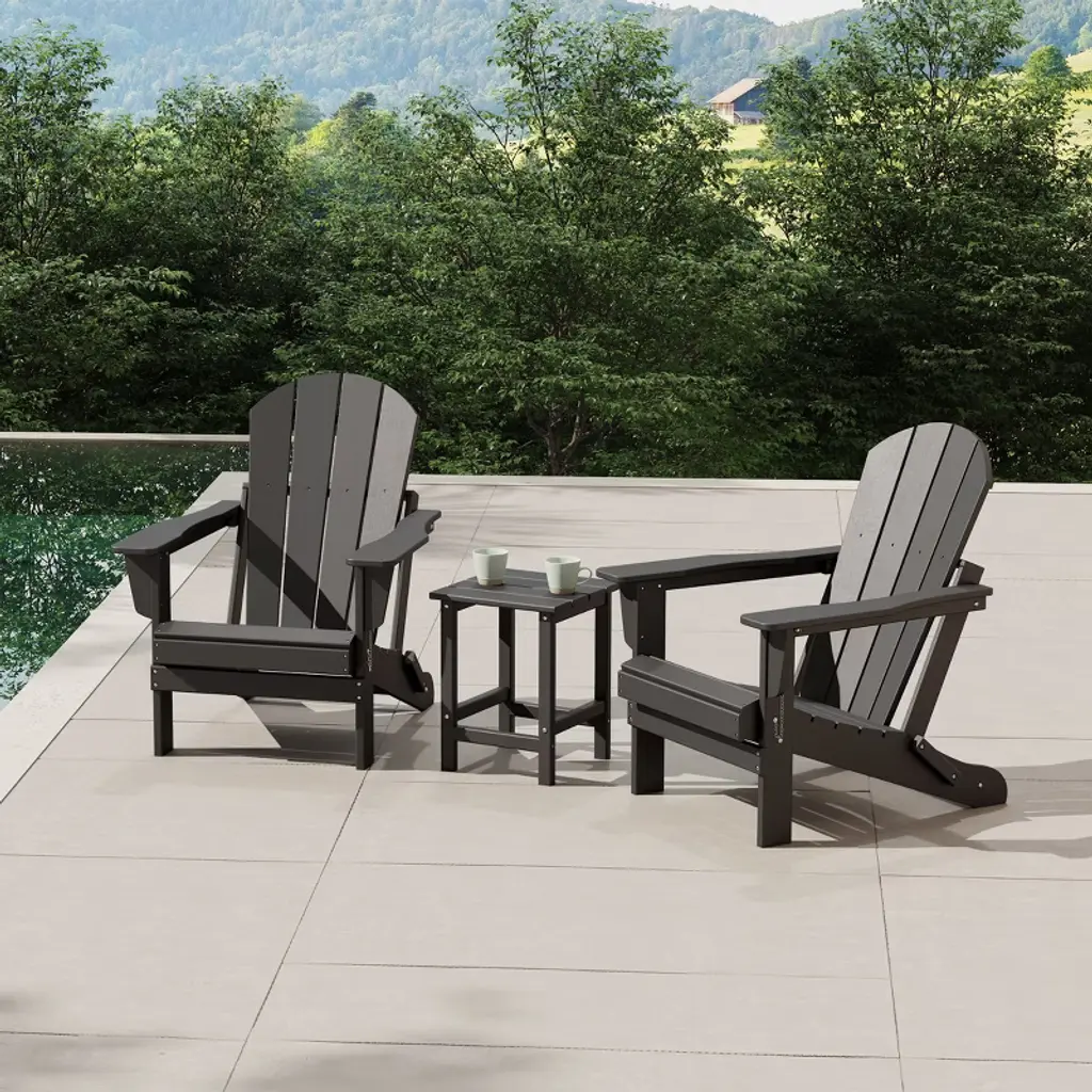 Sit back and unwind after a long day with this attractive outdoor patio set. With its lovely designed adirondack chairs and gorgeous patio accent side table, this wonderful 3-piece set is sure to brighten up your patio. Each piece is designed with a high quality (HDPE) material that is durable and has weather and UV resistance for an overall well-built patio set. The versatile design allows for the chair to be used both indoors and outdoors. Whether it be on the patio or next to the pool, wherever it is, it will make a statement and add style to your space.While we strive to accurately represent product colors, please be aware that actual colors may vary slightly due to individual screen settings and lighting conditions. FeaturesSet includes: two (2) Adirondack chairs and one (1) side tableDurable Eco-friendly HDPE lumberFade and UV resistantWeather resistantFoldable chairs for easy storageContoured seat, waterfall rest, and wide armrestA variety of lovely color options for any settingDetails:Product Type: Patio Conversation SetsWhat's Included: (2) Adirondack Chair; (1) Side TableAdirondack ChairDimensions: 29" W x 31.5" D x 34.5" HWeight: 32.75 lbs.Seat Width: 20.25"Seat Depth: 20"Seat Height: 14.5"Weight Capacity: 450 lbs.Table Top Width: 14"Table Top Depth: 14"Table Top Thickness: 0.5"Side TableDimensions: 14" W x 14" D x 18" HWeight: 9 lbs.Table Top Width: 14"Table Top Depth: 14"Table Top Thickness: 0.5"Weight Capacity: 180 lbs.