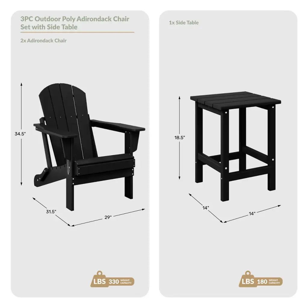 Sit back and unwind after a long day with this attractive outdoor patio set. With its lovely designed adirondack chairs and gorgeous patio accent side table, this wonderful 3-piece set is sure to brighten up your patio. Each piece is designed with a high quality (HDPE) material that is durable and has weather and UV resistance for an overall well-built patio set. The versatile design allows for the chair to be used both indoors and outdoors. Whether it be on the patio or next to the pool, wherever it is, it will make a statement and add style to your space.While we strive to accurately represent product colors, please be aware that actual colors may vary slightly due to individual screen settings and lighting conditions. FeaturesSet includes: two (2) Adirondack chairs and one (1) side tableDurable Eco-friendly HDPE lumberFade and UV resistantWeather resistantFoldable chairs for easy storageContoured seat, waterfall rest, and wide armrestA variety of lovely color options for any settingDetails:Product Type: Patio Conversation SetsWhat's Included: (2) Adirondack Chair; (1) Side TableAdirondack ChairDimensions: 29" W x 31.5" D x 34.5" HWeight: 32.75 lbs.Seat Width: 20.25"Seat Depth: 20"Seat Height: 14.5"Weight Capacity: 450 lbs.Table Top Width: 14"Table Top Depth: 14"Table Top Thickness: 0.5"Side TableDimensions: 14" W x 14" D x 18" HWeight: 9 lbs.Table Top Width: 14"Table Top Depth: 14"Table Top Thickness: 0.5"Weight Capacity: 180 lbs.