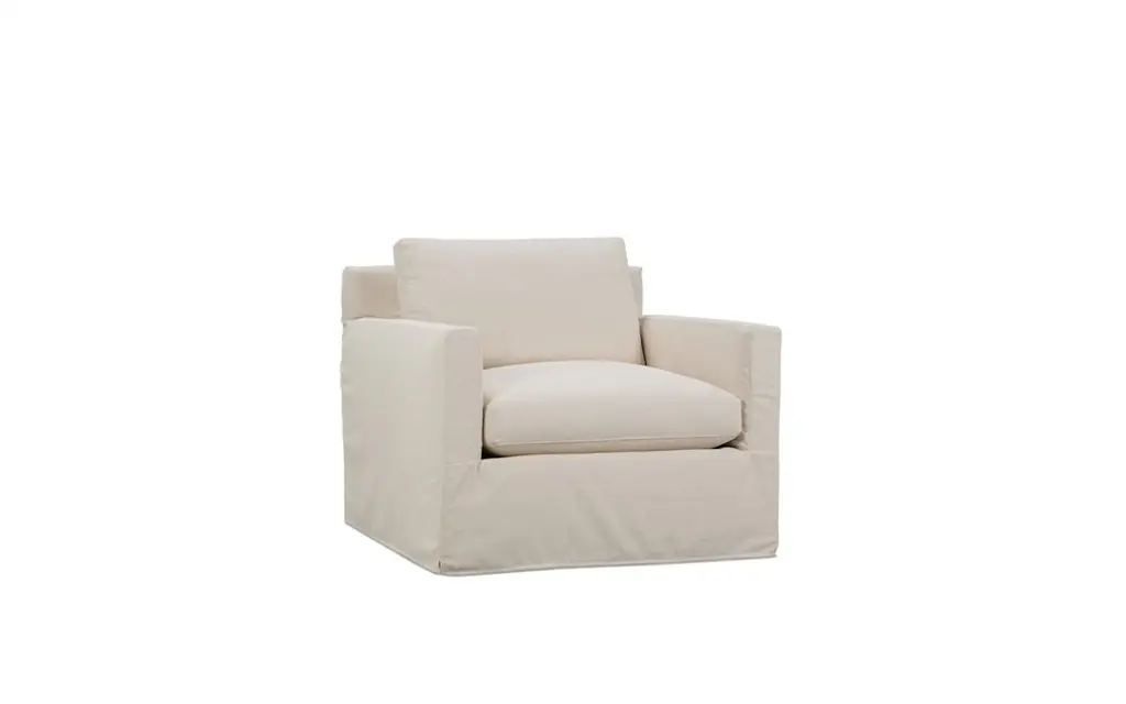 Casual and timeless with modern appeal, the Weybridge slipcovered chair blends seamlessly with any stylish living space. A plush seat is nestled within the clean-lined frame, while a breezy slipcover gently touches the ground. Soft and supportive cushioning offers plush, cloud-like comfort, with a foam core surrounded by a blend of fiber, down, and feather fill. Choose from washable slipcover fabrics in a variety of serene hues.