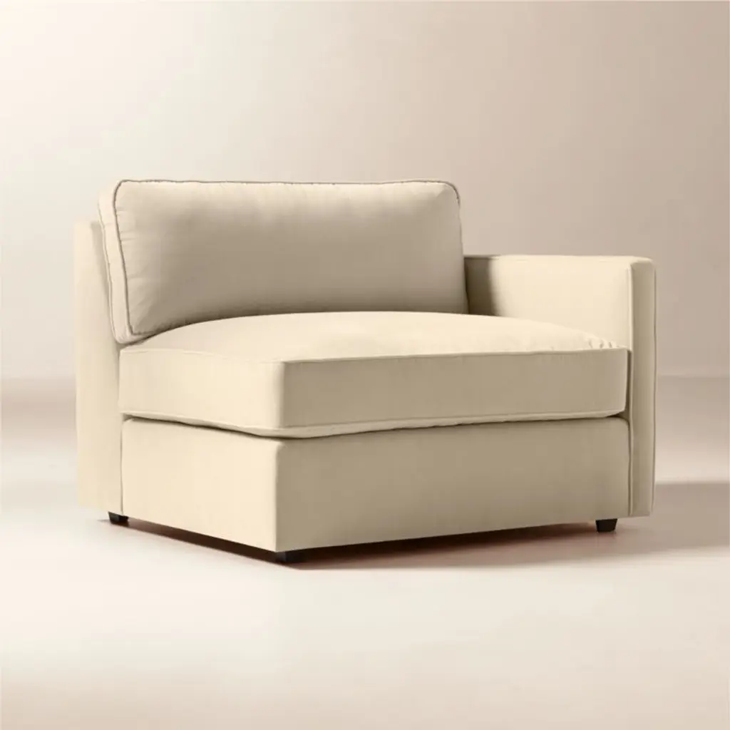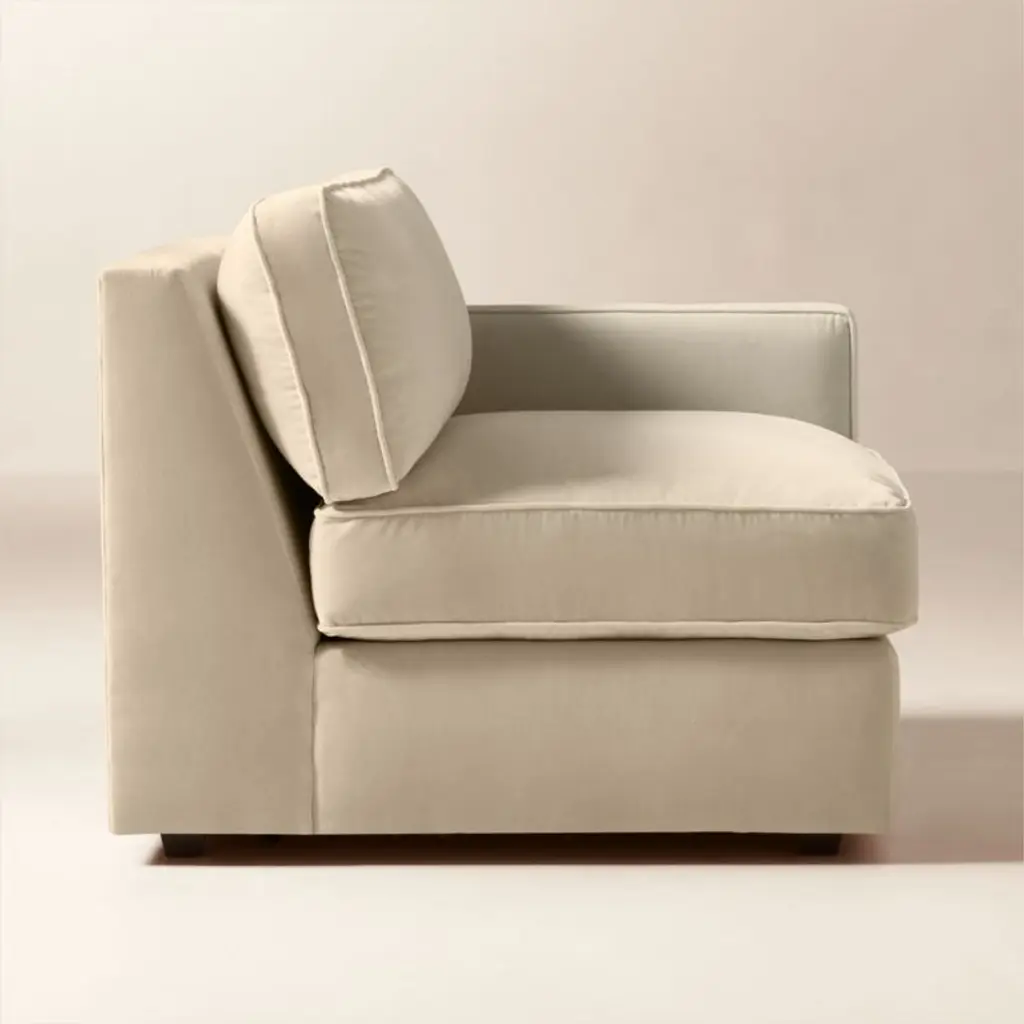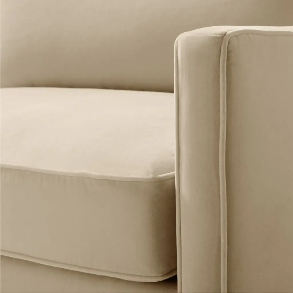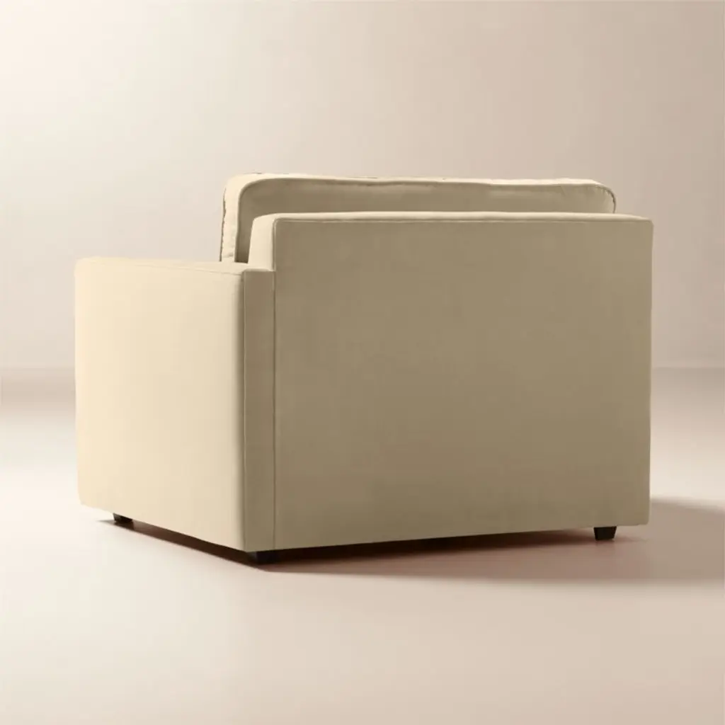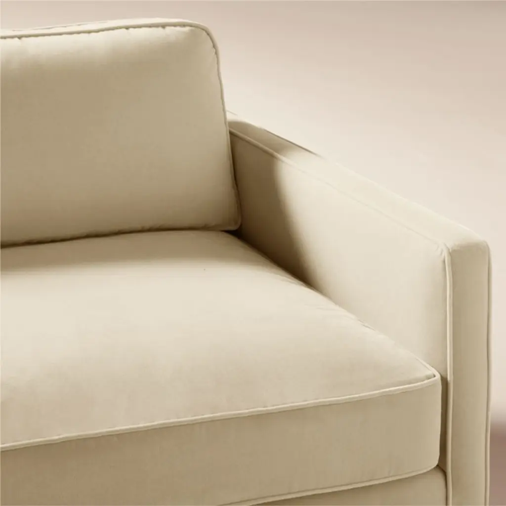 Hand-assembled by skilled artisans in North Carolina, performance velvet chair is a refreshing take on a minimalist silhouette. Crafted of kiln-dried solid hardwood certified sustainable by the Forest Stewardship Council (FSC), the crisp, tightly upholstered frame floats atop recessed legs with a slim, wrap-around arm that looks neat from any angle. Sumptuous cushions are wrapped in a soft blend of feathers and down to provide just enough support. The chair is covered in a plush taupe performance velvet made by JB Martin, an award-winning South Carolina textile mill that has been family-run for six generations. CB2 exclusive.