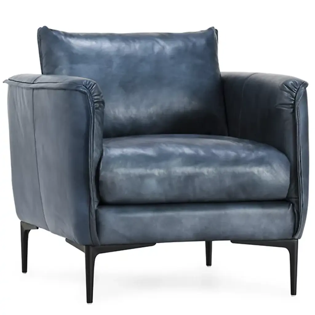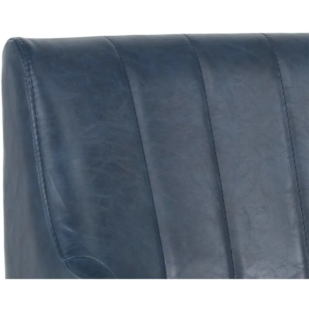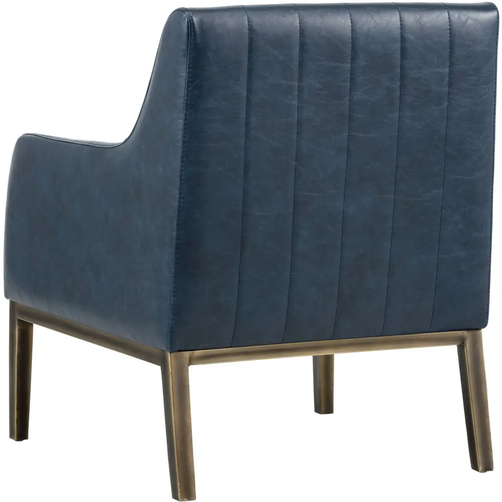 A retro lounge chair featuring channel stitching on the seat and seat back in vintage blue faux leather. Finished with a rustic bronze steel frame. Designed for comfort and urban appeal. Handle With Care: This design has been crafted with faux leather. Faux leather is manufactured to reflect the natural characteristics of leather as such, colour variations, markings, wrinkles, grooves, and light scratches are appreciated characteristics. No two pieces will be alike. Visit our Product Care page for more information on how to ensure the lasting beauty of this piece.
