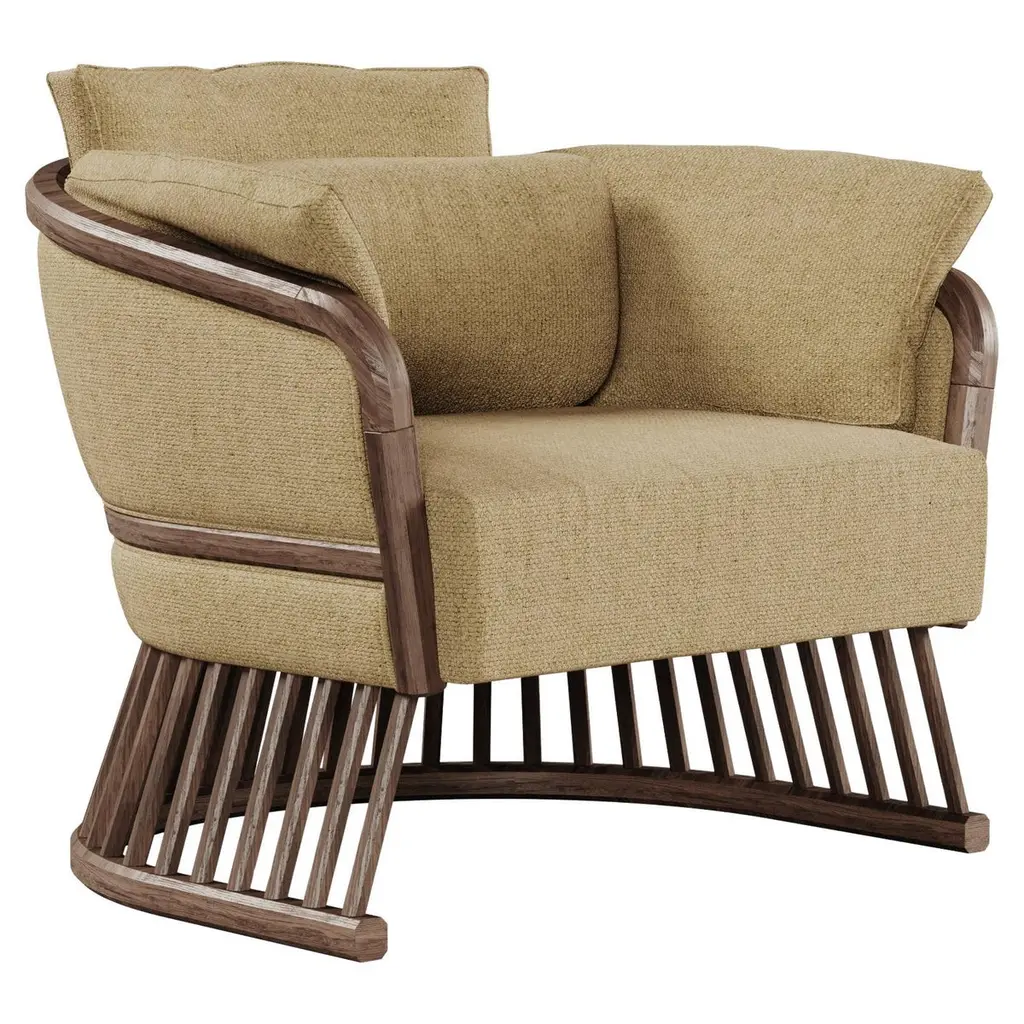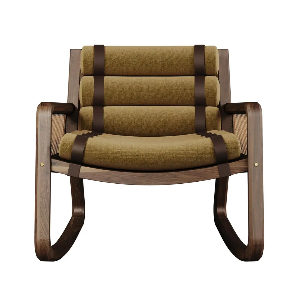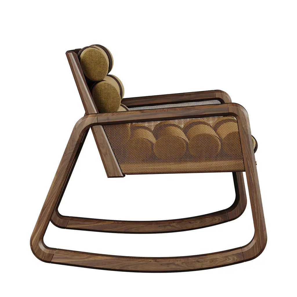 Diversifying from printing to publishing, William Strachan was a successful businessman. Most known for his unquestionable expertise and talent, William was entrusted with the printing of Johnson's Dictionary, and also published the works of famous philosophers. Nowadays his original painting by Reynolds is located at the National Portrait Gallery in London. Honoring this Scottish gentleman so much appreciated as a printer and publisher, Wood Tailors' designers conceived this timeless rocking armchair. Rigorously handcrafted in solid walnut wood and upholstered in linen, the William Rocking Armchair is enriched with a natural rattan texture on his arms, giving it a timeless touch, and embellished with brushed brass and leather details.The William Armchair would look perfect next to a handcrafted center or side table in a deluxe living room.