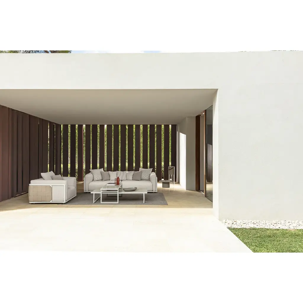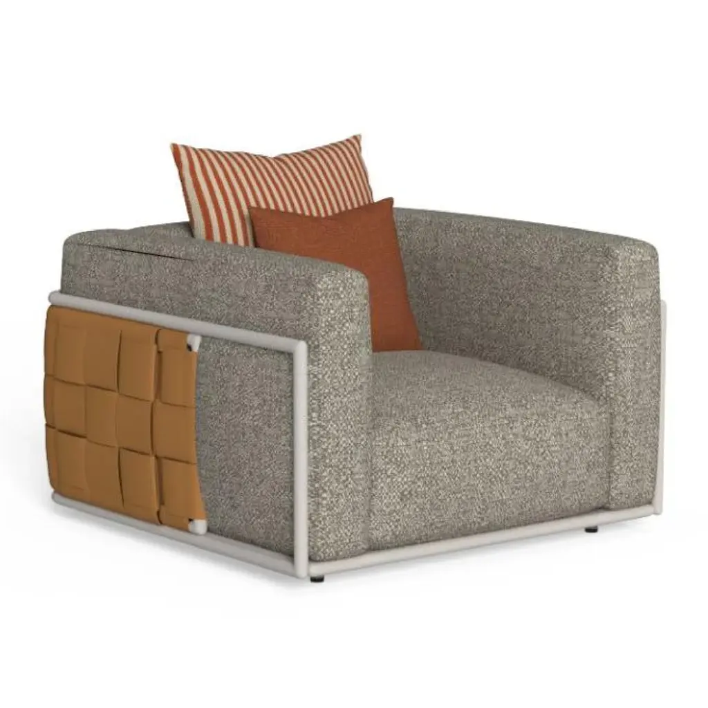 From the study of the cube as a primordial form, comes the sophisticated design of the Tressè armchair. The woven eco-leather bands that embrace the perimeter of the seat are the distinctive feature of this piece of furniture, which conveys a reassuring feeling of comfort and solidity. The soft and imposing cushions are highlighted by the fine finishes and the tubular aluminum structure. Available in silk gray, mud and Sienna, this armchair is the ideal outdoor solution for your garden or outdoor living room.