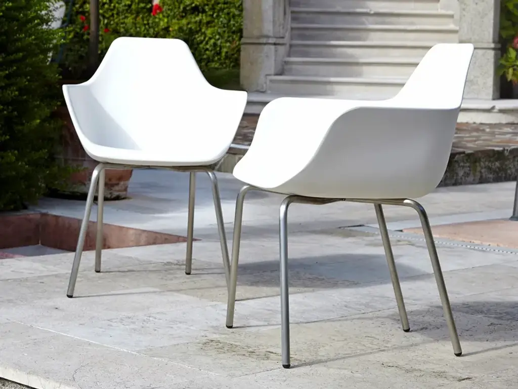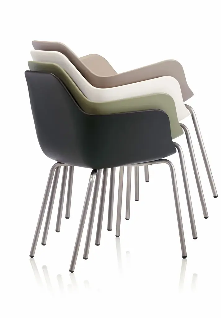 Y Four is a stackable chair in polyethylene.Y, the armchair introduced in 2015, has soft and moderate lines. Its shape, modern and with vintage recalls, allows a great comfort and a wonderful versatility, that makes it perfect to fit both in public and private spaces. The armchair is available in the outdoor version, stackable, and in the indoor one, with completely upholstered shell or with only a cushion, in the Y Soft version. Y is presented with steel or wood frame, available with different declinations.