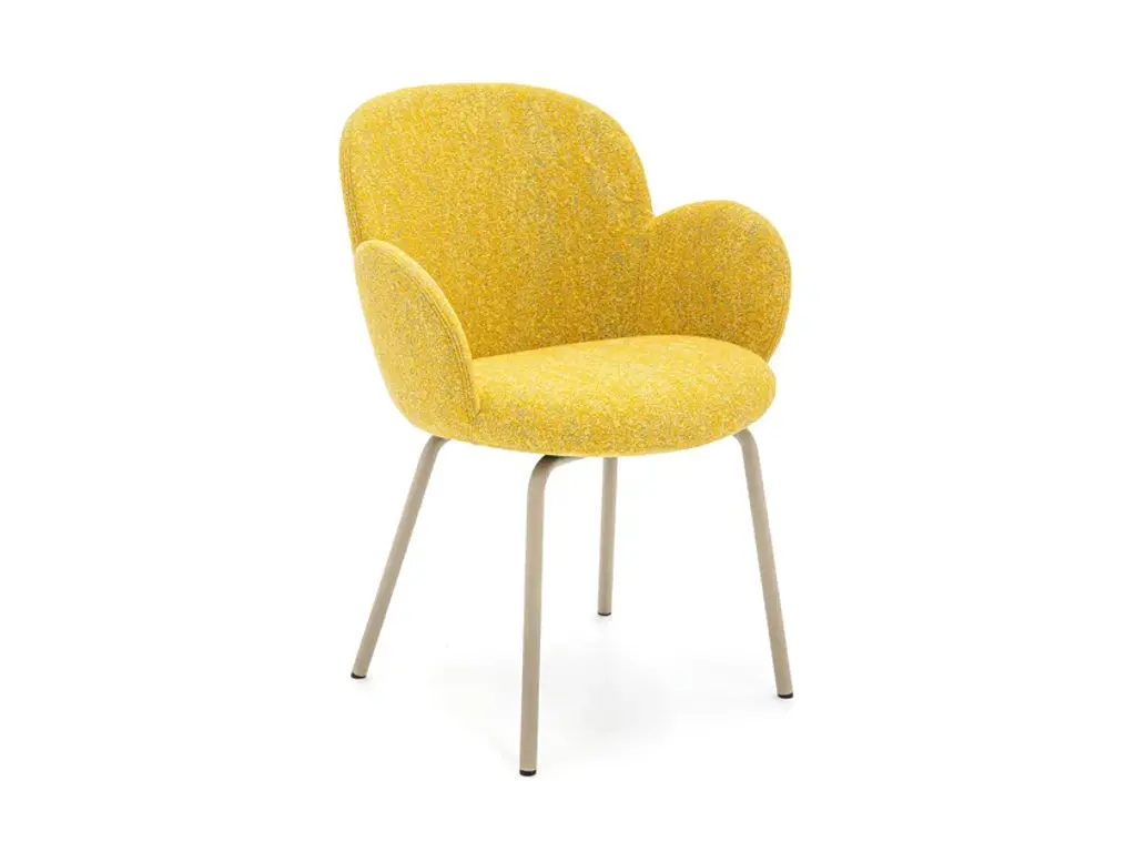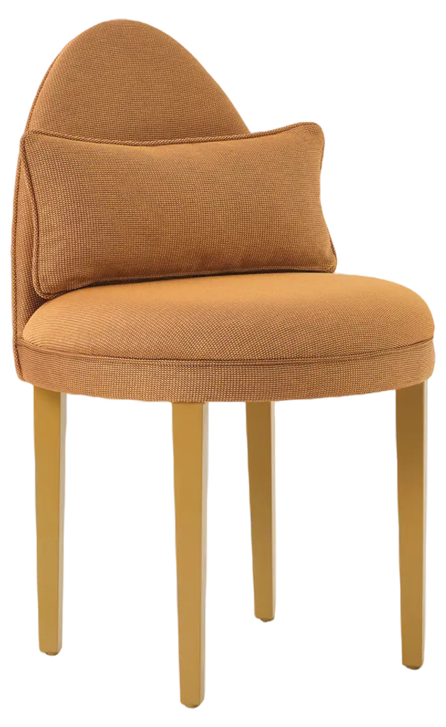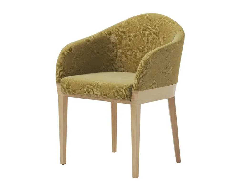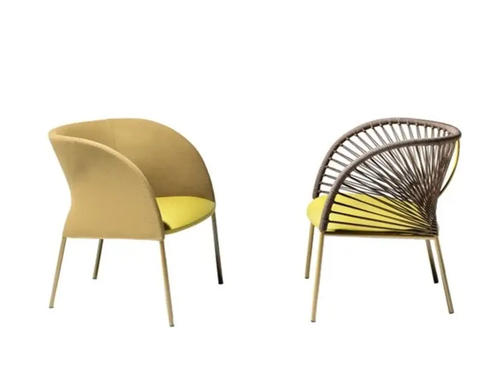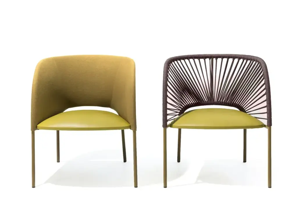 Yumi is a small armchair with a very simple principle and sophisticated language. Its sinuous outlines and wrapping shape create an inviting seating, a hollow backrest formed by a bent bow keeps it dean and light. Separated seat and backrest allows lo play with endless combinations of fabric, leathers and finishes. Yumi project is a neat representation of a harmonious bent bow. Its style ranges from a woven playful version to a more sophisticated upholstered version that makes the family suitable for residential and commercial spaces, indoor and outdoor. Yumi collection includes chairs, small armchairs, and low tables that will let interior designers and architects to cover complete areas of a project with the same product on multiple and unique versions.Back in injected flame-retardant polyurethane foam over internal steel frame. Seat in injected flame-retardant, polyurethane foam over wood frame.Seat and back can have different covers. Yumi collection covers are not removable.Yumi collection includes chairs, small armchairs, and low tables that will let interior designers and architects to cover complete areas of a project with the same product on multiple and unique versions.