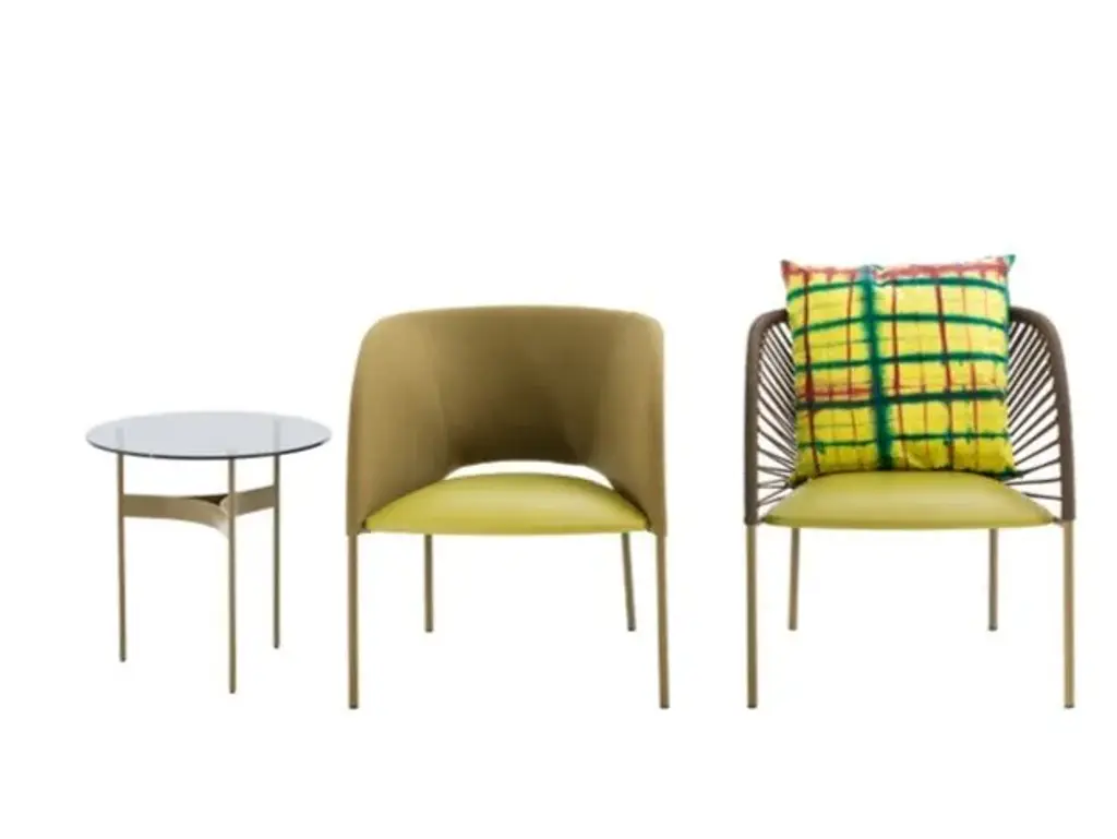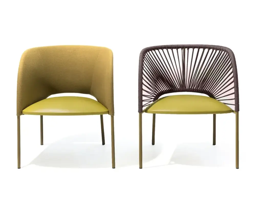 Yumi is a small armchair with a very simple principle and sophisticated language. Its sinuous outlines and wrapping shape create an inviting seating, a hollow backrest formed by a bent bow keeps it dean and light. Separated seat and backrest allows lo play with endless combinations of fabric, leathers and finishes. Yumi project is a neat representation of a harmonious bent bow. Its style ranges from a woven playful version to a more sophisticated upholstered version that makes the family suitable for residential and commercial spaces, indoor and outdoor. Yumi collection includes chairs, small armchairs, and low tables that will let interior designers and architects to cover complete areas of a project with the same product on multiple and unique versions.Back in injected flame-retardant polyurethane foam over internal steel frame. Seat in injected flame-retardant, polyurethane foam over wood frame.Seat and back can have different covers. Yumi collection covers are not removable.Yumi collection includes chairs, small armchairs, and low tables that will let interior designers and architects to cover complete areas of a project with the same product on multiple and unique versions.