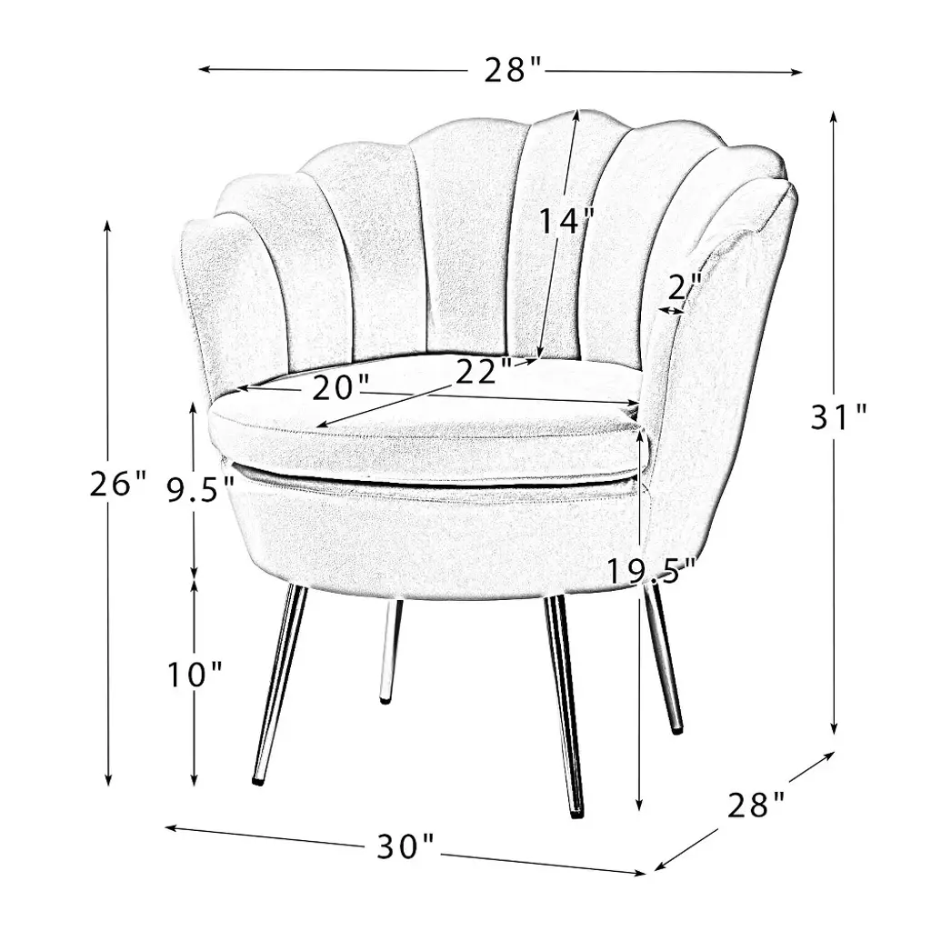 Whether you need a spot to curl up with a good book or somewhere to lay out clothes for the next day, this streamlined barrel chair is a versatile addition to your space. This is the classic and contemporary style accent chair with vertical channel tufted back. Made with premium velvet fabric, comfortable for skin touch, and features an on-trend solid hue that’s bound to blend in with your color scheme. High-density foam filling with a solid and manufactured wood frame provides comfort and support. The slender polished golden metal legs bring modern design and add to the timeless fashion of this piece. Plus, the scalloped seashell edges create artful elegance. It's the perfect pick for living room, office room, bedroom and other seating areas.