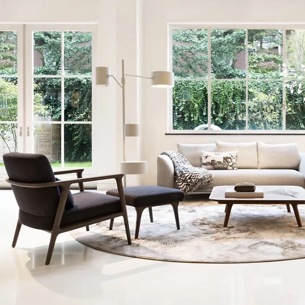 The Zio Lounge Chair from Mooi brings comfort to interiors that is at once casual and refined. A cleverly-constructed design by Marcel Wanders Studio, it transforms its surroundings, using smooth legs and braces of solid oak wood refined into coherency with the other elements, and pared down to something that blends natural lightness with stylish structure. The seat and coordinating back are upholstered with plush fire-safe foam, and covered with a soft blended fabric, contrasting well with the smooth wood frame below.