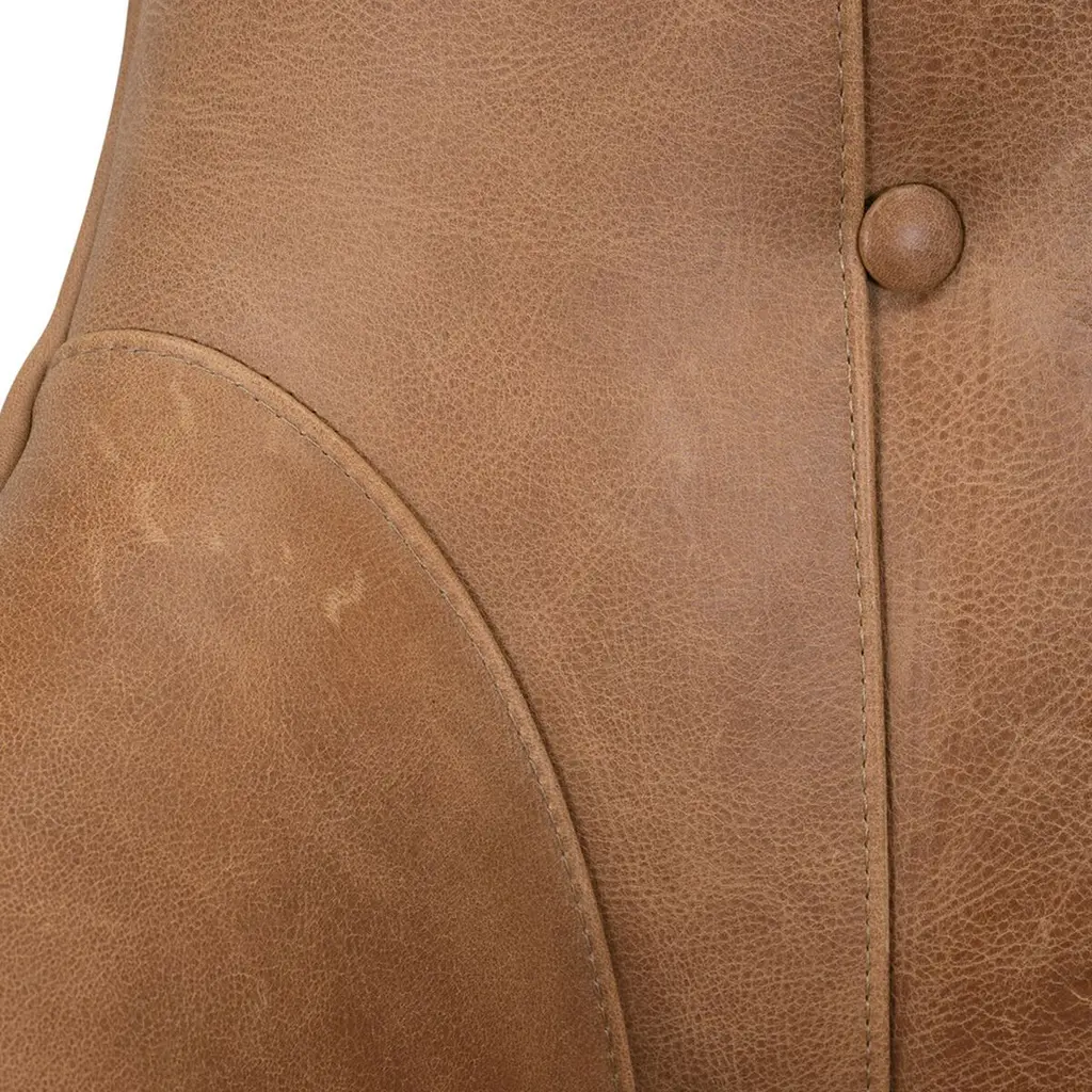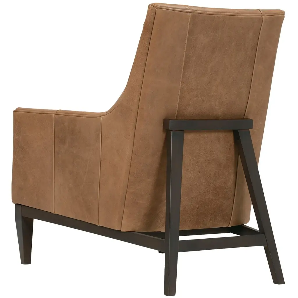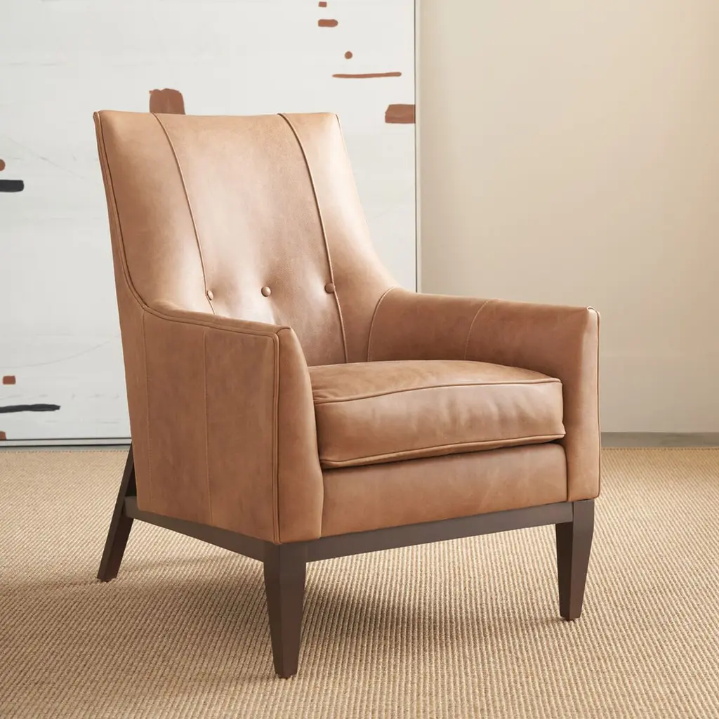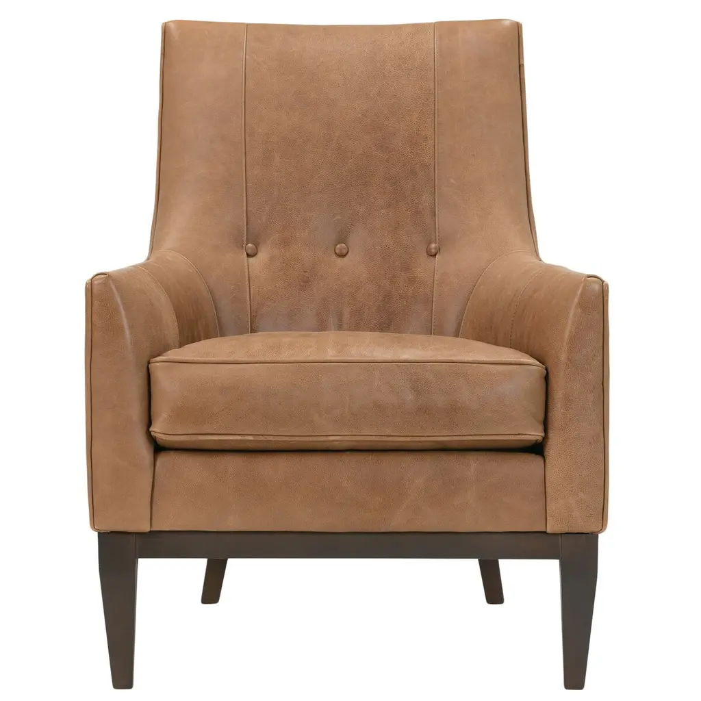 Modern with a touch of traditional style, the Zoya Leather Accent Chair is perfectly suited to a variety of aesthetics. This versatile seating option features a modern open wood frame, while the leather includes classic button tufting. The Brazilian hide is dyed and treated with a darker wax, which is then brushed to a distressed texture that will continue to develop the look of a vintage piece over time.