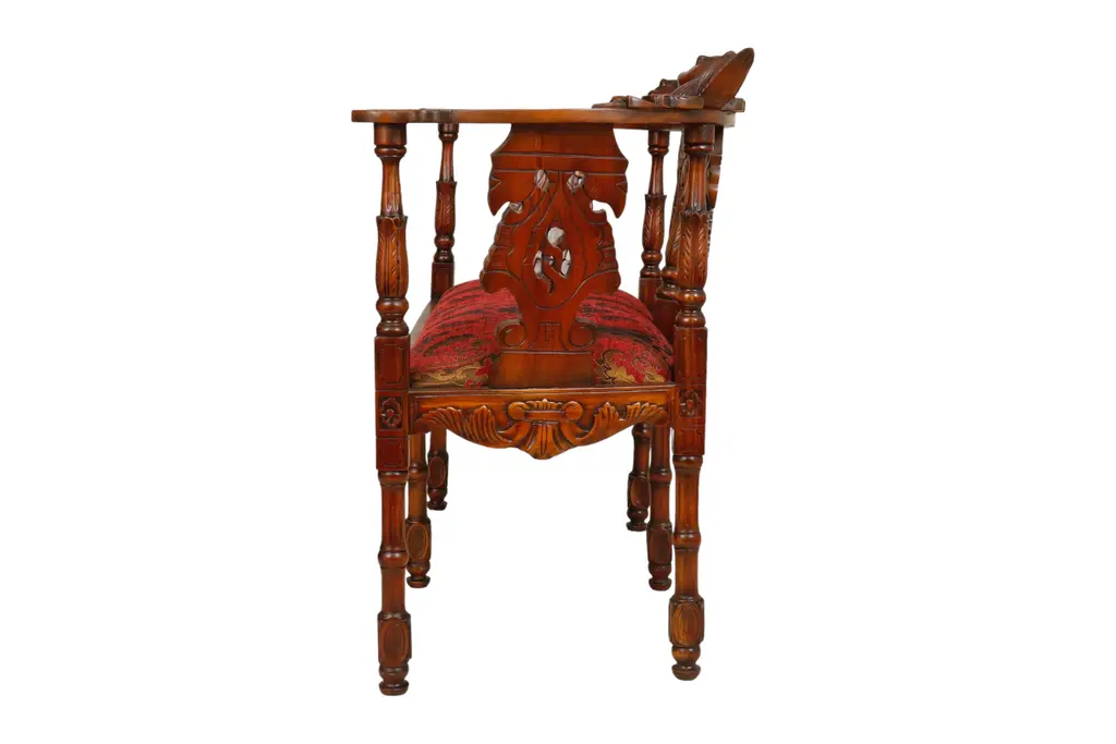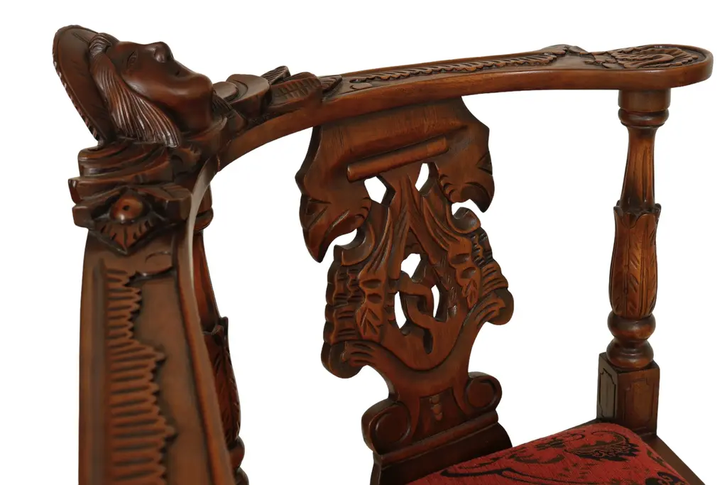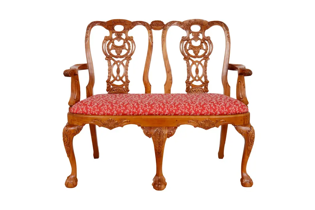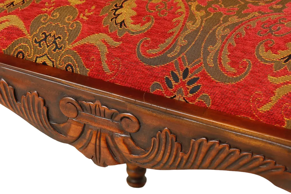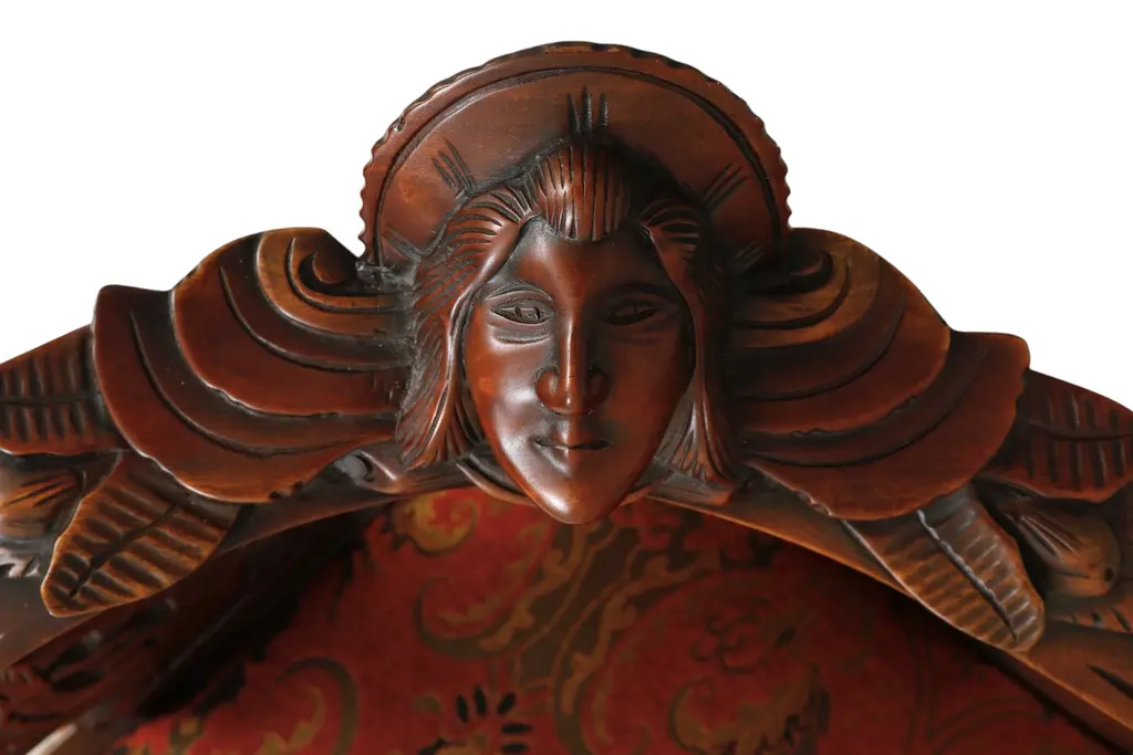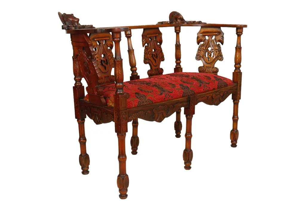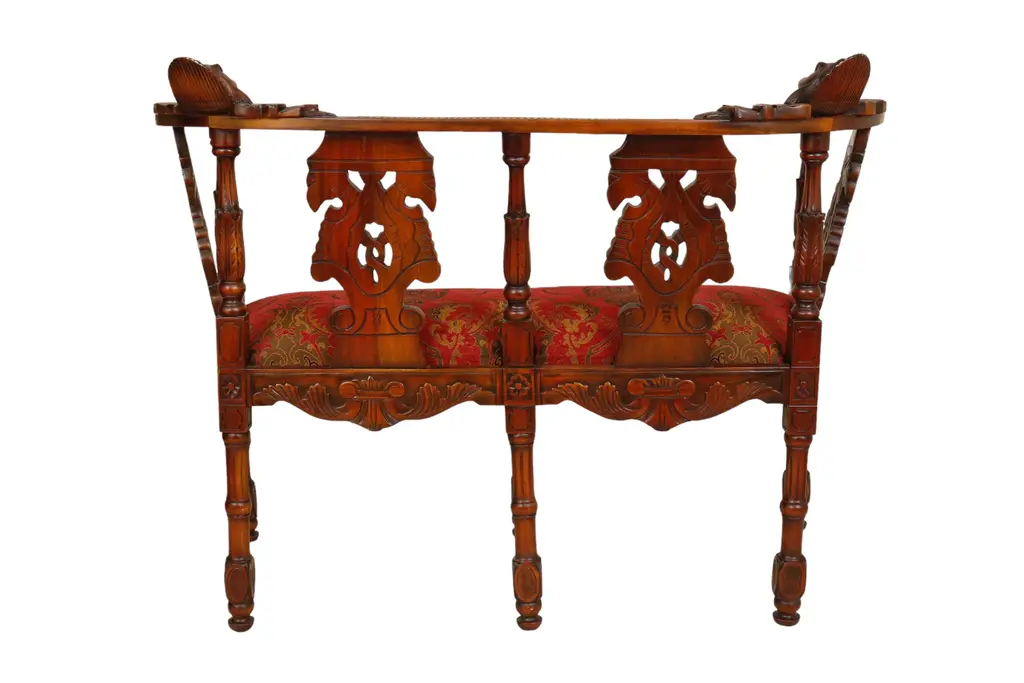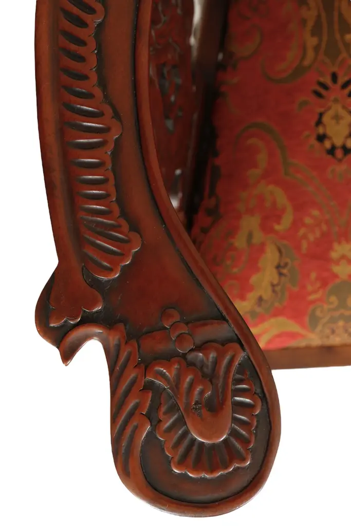 A richly carved parlor settee made of walnut, circa 1910. Carved throughout with foliage, the seat back is decorated with two putto heads, one at each shoulder, and supported with four pierced back splats. A serpentine carved apron frames the spring seat, upholstered in Sherry Kline’s ‘China Art’ jacquard in red. Stands on six turned legs. Seat height 19.5", arm height 31.75".