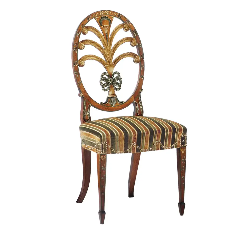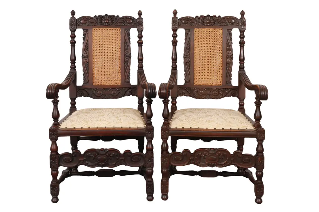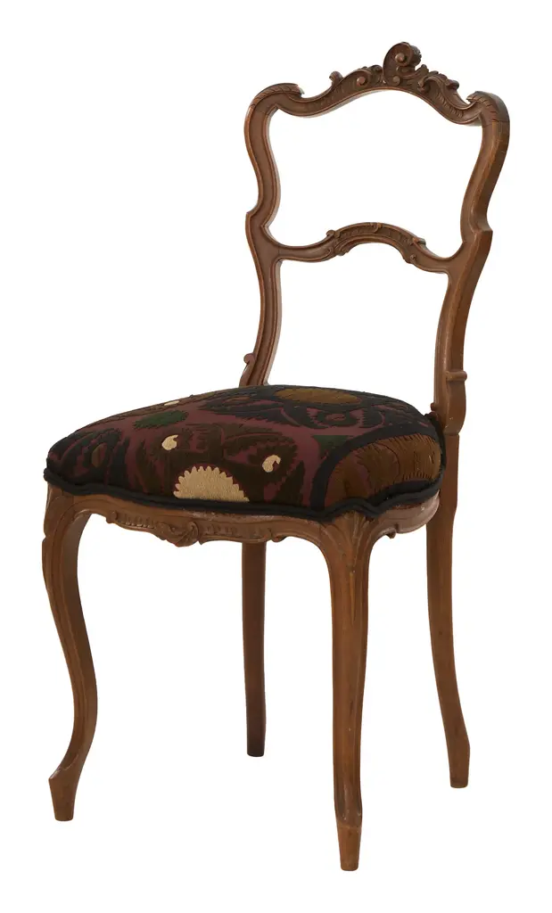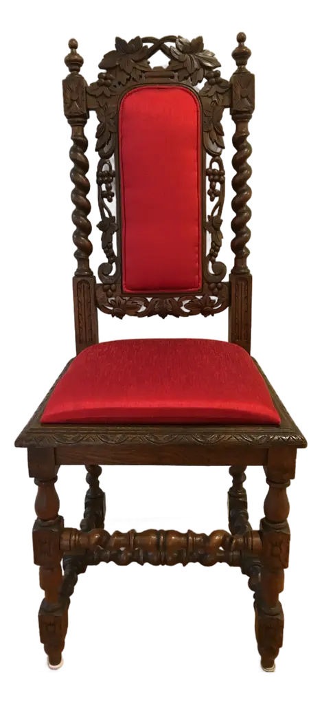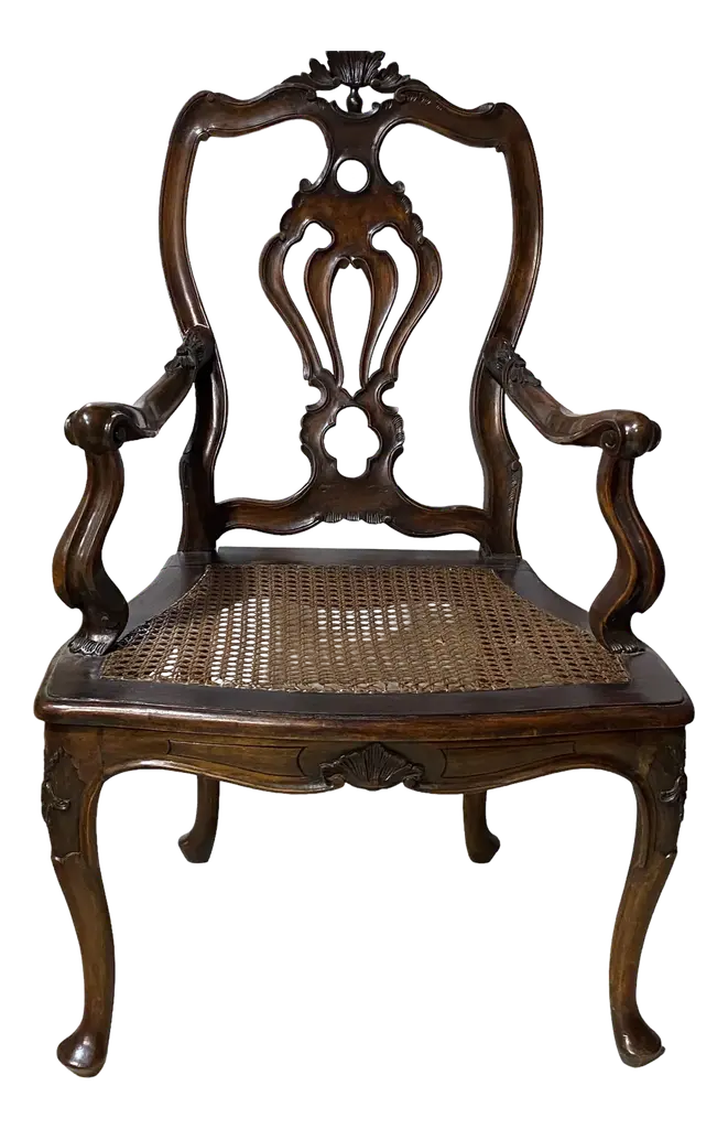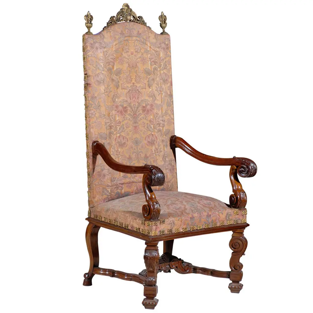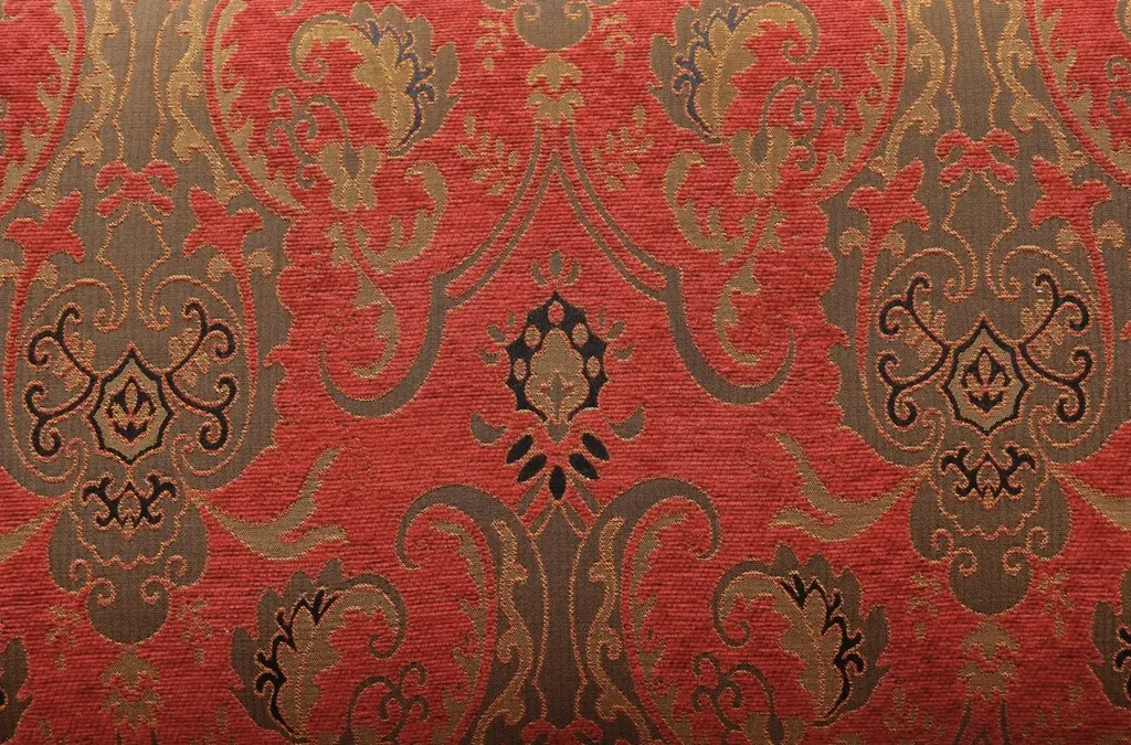 A richly carved parlor settee made of walnut, circa 1910. Carved throughout with foliage, the seat back is decorated with two putto heads, one at each shoulder, and supported with four pierced back splats. A serpentine carved apron frames the spring seat, upholstered in Sherry Kline’s ‘China Art’ jacquard in red. Stands on six turned legs. Seat height 19.5", arm height 31.75".